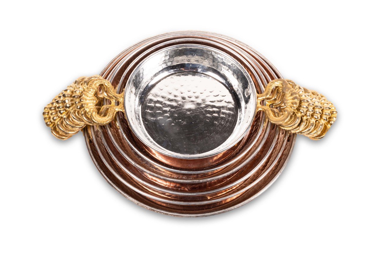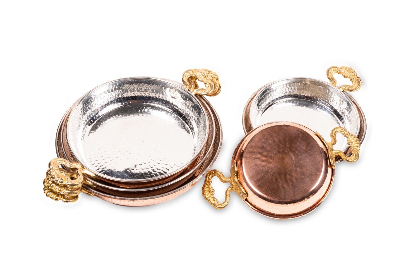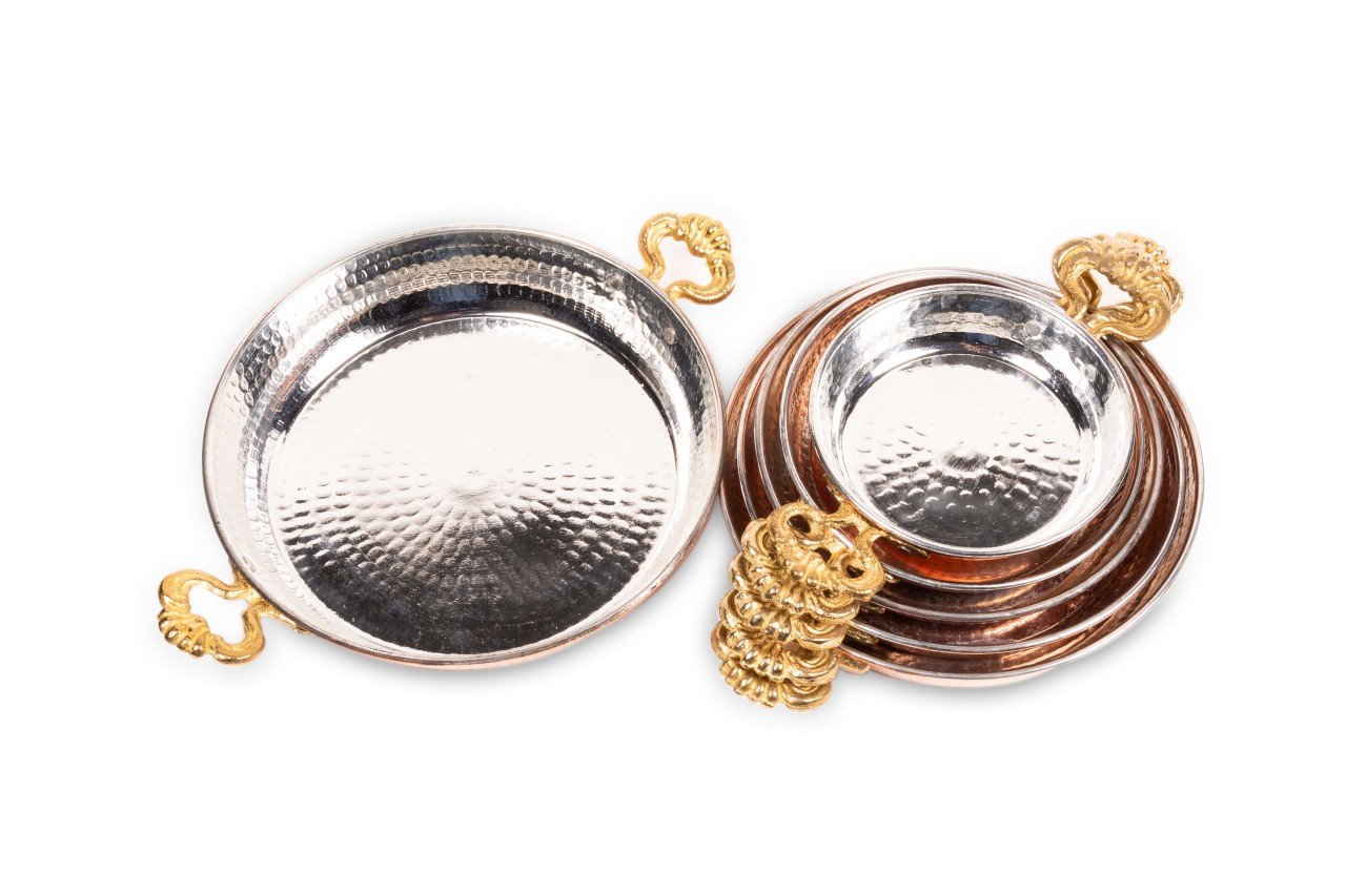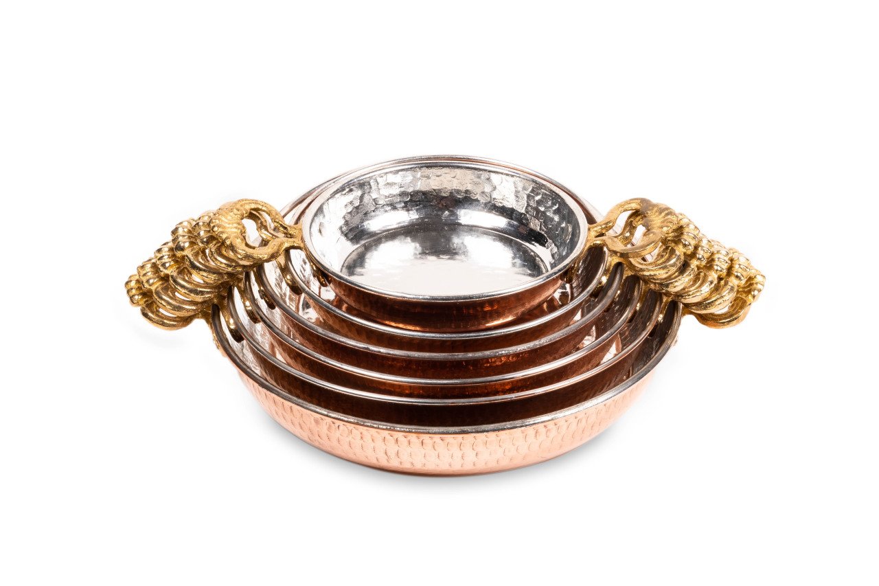 Bakır sahan, dövme bakırdan imal edilmiştir. En önemli özelliği hem kalın olması hem de dövme ustaları tarafından saatlerce süren dövme işlemi sonucu imal edilmesidir. Bakır sahanın, iç kısmı kalaylı ve günlük kullanıma uygun olup, sahip olduğu iki adet kulpun ham maddesi pirinçtir. Ergonomik olarak tasarlanmış olan bu kulplar, sahanın kolaylıkla kavranmasına olanak sağlamaktadır. Ürün ısı muhafazasında da çok üstün özellikler sergilemektedir. Hem dipten hem de yanlardan sağladığı son derece eşit ısı dağılımı müthiş bir fark yaratacaktır. Ayrıca, bakır sahan tamamen el işi olduğundan, dayanıklılığı uzun yıllar sürecek, keyifli ve zevkle kullanımınıza olanak sağlayacaktır.