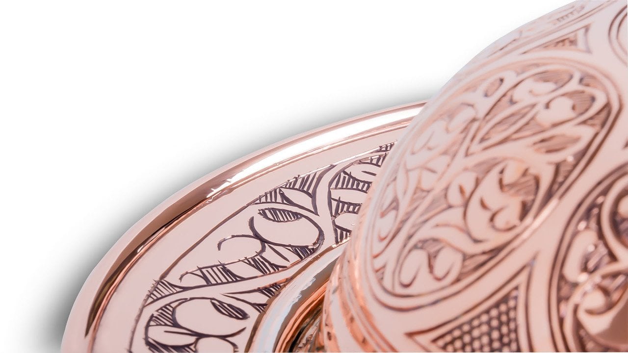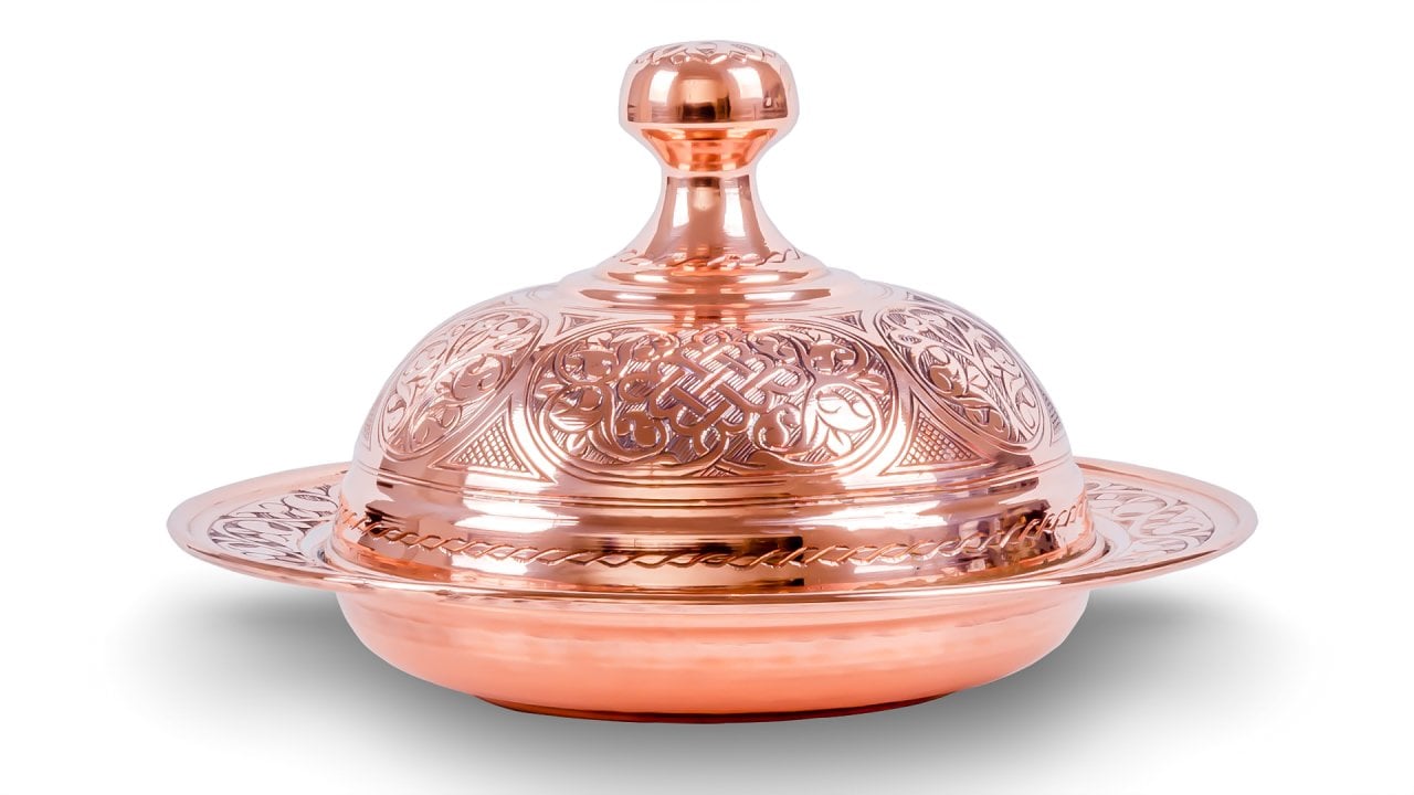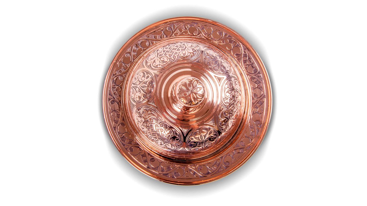 Gün doğumu parlaklığında bakır tabak ile kendinizi gün doğumunun mutluluk verici parlaklığına bırakın. Tüm yemek servislerinizde rahatlıkla kullanabileceğiniz bakır tabak ile kendinizi özel hissedecek, fark yaratmanın keyfini süreceksiniz. Her bir kıvrımında eşsiz detaylar barındıran tabağınız, baktığınız her açıdan sizi mutlu edecek sadece yemek servislerinizde değil, evinizin herhangi bir köşesinde dekoratif amaçla kullanmak isteyeceğiniz ikon parçanız olacaktır. İki parçadan oluşan tabağının alt tabak parçasının iç yüzeyi kalayla kaplanmış olup, iç tarafından dış kenarlarına doğru, bakır ustasının el işçiliğinin ustalığını taşıyan işlemeler ve kabartmalarla bezenmiştir. Kapak kısmı tek parça ham bakırdan yapılmış, üst tarafında kapak kulpu ile zarif bir bütünlük oluşturmaktadır. İç tarafı yine kalayla kaplı olan kapağın alt kısım ile birleştiği kısımlar, alt taraftaki işlemeler ile zarifçe dans etmektedir. Tabak kısmı kapağı ile birlikte kullanılabileceği gibi tek başına da kullanıma uygun olacak şekilde üretilmiştir. Türk bakır sanatının ve örneklerinin içerisinde önemli bir yere sahip olan tabağınız evinize yepyeni bir soluk katacak. Sitemizde 19-22 ve 25 cm çap ölçülerine sahip 3 farklı modeli bulabilirsiniz.