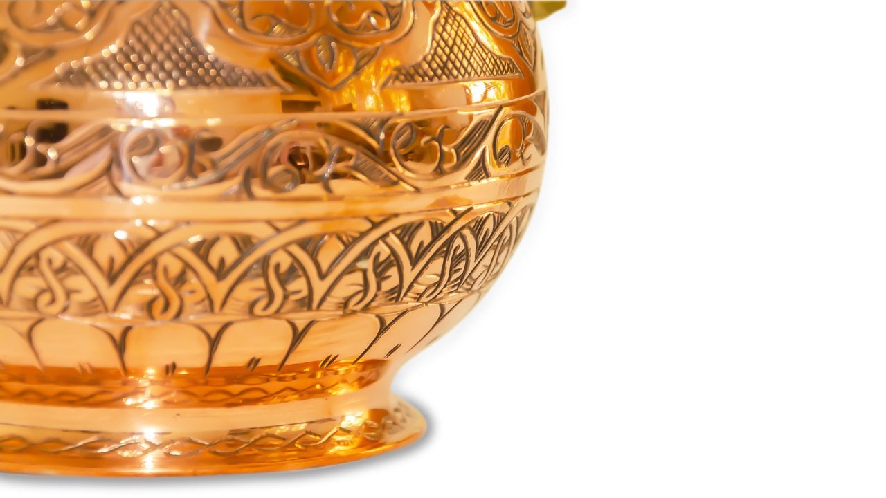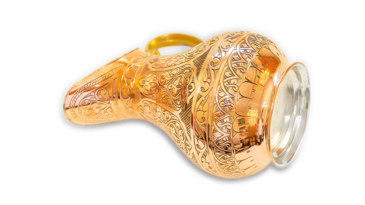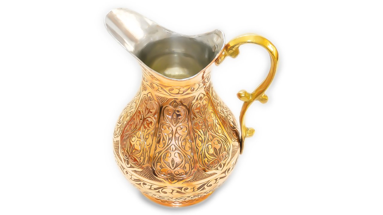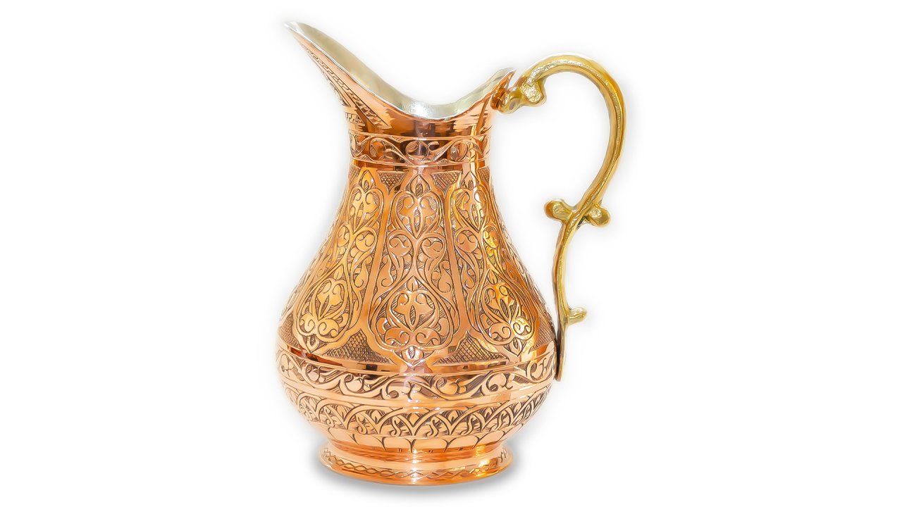 Güzel kızıl bakır sürahi, hem gündelik toplantılara hem de özel etkinliklere çarpıcı bir ayrıcalık getiriyor. Usta zanaatkarlar tarafından hazırlanan sürahi, bol su, buzlu çay ve benzeri içecekler için yeterli bir boyuta sahiptir. Karanlık çağlardan bu yana, bakır içme kapları ve sürahiler, zenginlik ve sadeliğin şaşırtıcı dengesiyle meşhur olmuştur. Ergonomik biçimi ve sağlam tutma yeri, doldurma, taşıma ve dökme işlemini kolaylaştırırken, gıda açısından güvenli kalay kaplı iç kısmı ile görsel kontrastı arttırılmıştır. Tamamen el yapımı olan bu geleneksel ürün, hambakırdan üretilmiştir ve mükemmel soğuk iletkenliğe sahiptir. Sürahilerimiz, olağanüstü kaliteli ve uzun ömürlüdür. Çok sayıda araştırma, bakırın inanılmaz anti-bakteriyel özelliklere sahip olduğunu, etkili bir anti-oksidan görevi yaptığını, bağışıklık sistemini güçlendirdiğini, iyi sağlığın geliştirilmesine yardımcı olduğunu, yaşlanmanın görünümünü yavaşlattığını, vücudun toksinleri temizlemesine ve serbest kalmasına yardımcı olduğunu göstermiştir. Doğal olarak anti-bakteriyel olduğundan, su, ürün içinde doğal olarak kendi kendine sterilize edilir. Ürünün, sahip olduğu zarif eğriler rüzgarda bükülen bir çiçeğin basit güzelliğini veya kumsalda çarpışmaya hazır bir dalganın yankısını yansıtmaktadır. Nesiller boyunca süregelen teknikler ile usta zanaatkârlar tarafından el işçiliğiyle yaratılan bu eşsiz parça evinize huzurlu bir güzellik katacaktır. Ürünü dilerseniz, sitemizde bulabileceğiniz tepsi ve kupalar ile kombine ederek tam bir sete çevirebilirsiniz. El yapımı bakır sürahinin yüksekliği 24 cm, kulp ucundan çapı 18 cm ve boğaz çapı 12 cm dir.