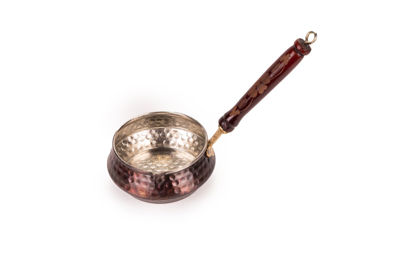 Handygoo Ahşap Saplı Bronz Dövme Bakır Sosluk, lezzetli soslar ve yağ kızdırmak için kullanabileceğiniz son derece pratik ve dekoratif bir tavadır. Ürün 11 cm çap, 5 cm yükseklik ve 18 cm lik sap ölçüleri ile her mutfakta elinizin altında olmasını isteyebileceğiniz bir üründür. Ürünümüz, el yapımı olup, kalın bakırdan üretilmiştir. Üzerindeki dövme işçiliği Gaziantep'li bakır işleme ustalarımız tarafından yapılmıştır. %100 el yapımı olmasından dolayı ürün size özeldir.