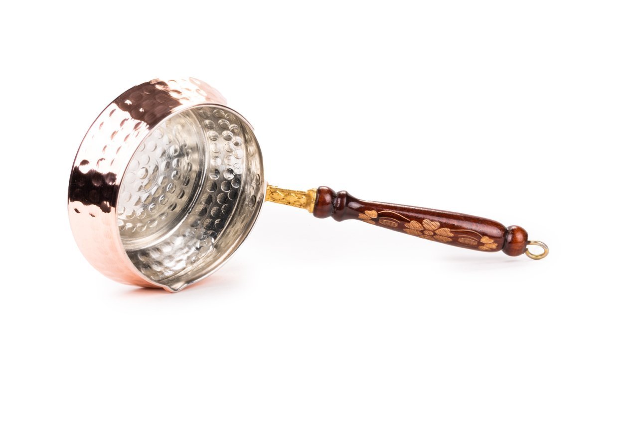 Handygoo Ahşap Saplı Kırmızı Dövme Bakır Sosluk, lezzetli soslar ve yağ kızdırmak için kullanabileceğiniz son derece pratik ve dekoratif bir tavadır. Ürün 11 cm çap, 5 cm yükseklik ve 18 cm lik sap ölçüleri ile her mutfakta elinizin altında olmasını isteyebileceğiniz bir üründür. Ürünümüz, el yapımı olup, kalın bakırdan üretilmiştir. Üzerindeki dövme işçiliği Gaziantep'li bakır işleme ustalarımız tarafından yapılmıştır. %100 el yapımı olmasından dolayı ürün size özeldir.