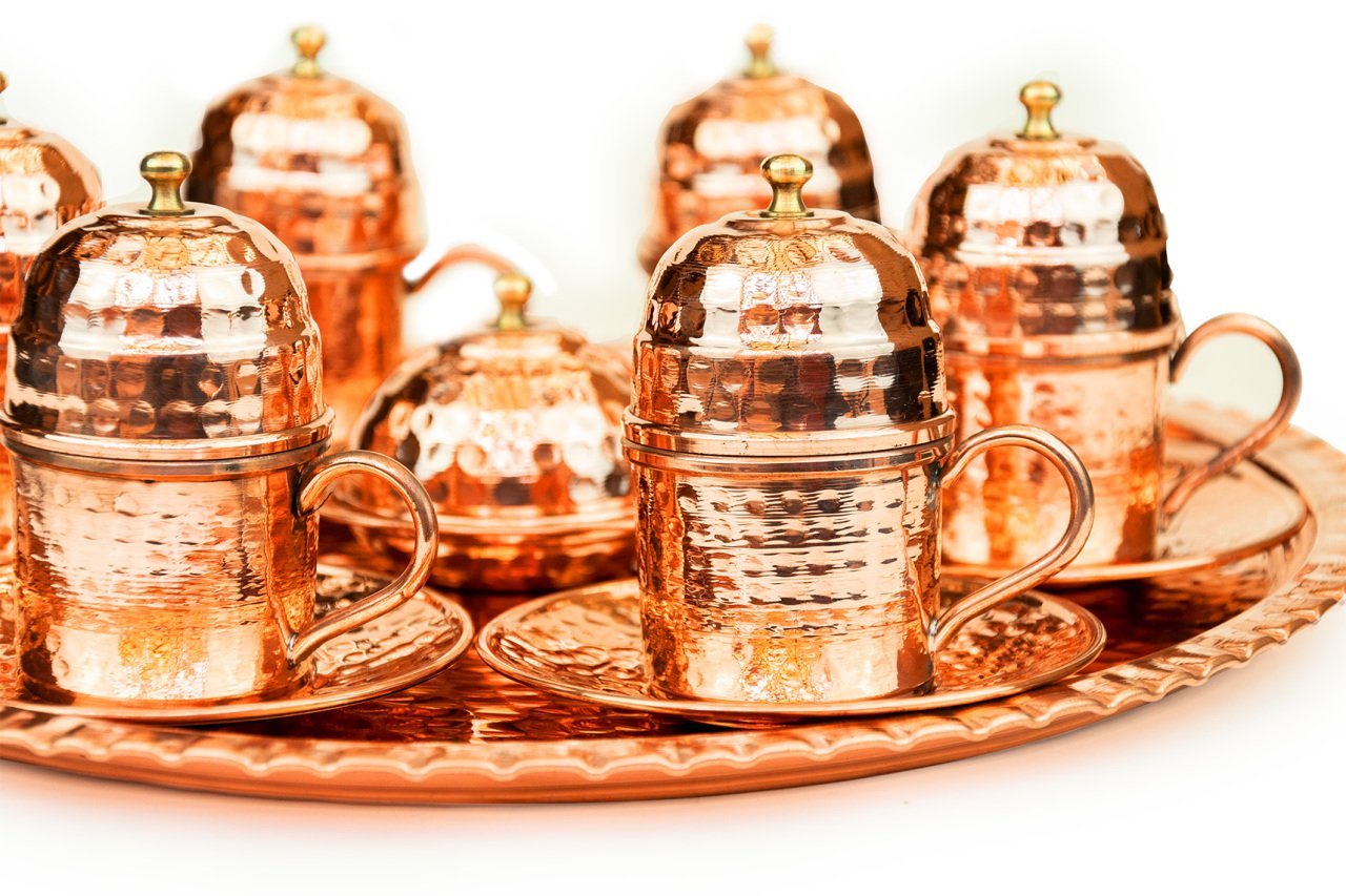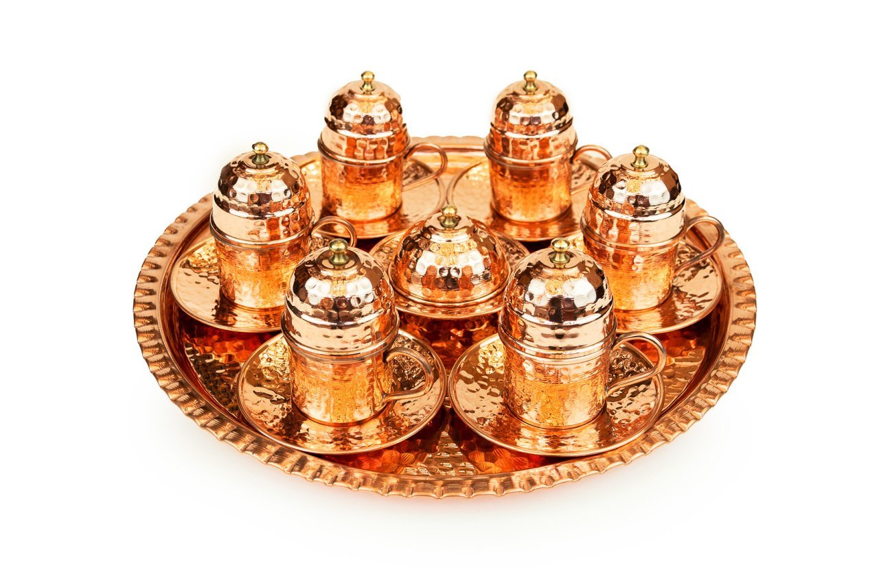 Handygoo Altı Kişilik Dövme Bakır Kahve Fincanı Seti, Türk kahvesi sunum ve servisleriniz için özel olarak tasarlandı. Ürünümüzün tamamı bakırdan üretilmiştir. Kahve fincanlarından, fincan altlıklarına, lokumluğundan tepsisine kadar baştan sona el yapımıdır. Bakır kahve fincanı seti üzerindeki tüm çekiçleme G.Antep'li bakır nakış ve işleme ustalarımız tarafından özenle sizler için yapılmıştır. Dolayısı ile her bir setimiz aslında size özeldir. Özellikle geleneksel ve çok özel rengi ile dikkatleri üzerine toplayan dövme bakır kahve fincanı seti modelimiz, türk kahvesi servis, sunum ve içim zevkinizi oldukça yükseklere taşımaktadır. Görenleri kendisine hayran bırakacağından emin olabilirsiniz. Dövme bakır kahve fincanı seti modelimiz kendi imalatımız olup kalın bakırdan üretilmiştir. Set içerisinde, tepsisi, 6 adet kapaklı kahve fincan kaidesi, 6 adet porselen kahve fincanı, 6 adet fincan tabağı ve lokumluk yer almaktadır. Tepsi 35 cm çapında dövme bakır ve 2 cm kalınlığındadır. Fincan kaideleri 5 cm çap ve 4,5 cm yüksekliğinde ve yine dövme bakırdır. Porselen kahve fincanları ise 4,8 cm çap ve 5,8 cm yüksekliğe sahiptir. Fincanlar kapakları ile birlikte toplam 9,5 cm yüksekliğe sahiptir. Dövme bakır lokumluk 9,5 cm çap ve 5,5 cm yüksekliğindedir. Günlük kullanımda, kullanmaktan büyük zevk duyacağınız ürünümüz aynı zamanda sevdikleriniz için son derece ideal bir hediye de olacaktır. Ayrıca sitemizde bakır kahve fincanı setinize uygun olacak aynı renk cezve modelleri ile birlikte yine tercih edebileceğiniz farklı bakır cezve modellerimizi bulabilirsiniz.