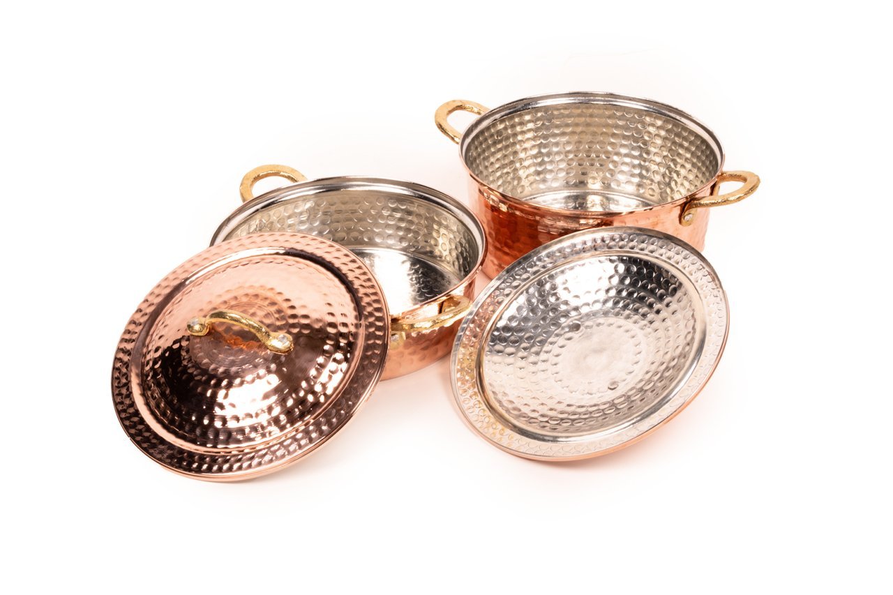Handygoo Anatolian Dövme Bakır Tencere Seti, 2 boy, modern ancak geleneksel tarzda ürettiğimiz dövme bakır tencere modellerimizi içermektedir. Set içerisinde ufak boy derin bakır tencere ve yine ufak boy pilav tenceresi modelimiz yer almaktadır. Set içerisindeki en ufak boy derin dövme bakır tenceremiz 21,5 cm çapında ve 10 cm derinliğindedir. 2 LT hacmi bulunmaktadır. Set içerisindeki ufak boy dövme bakır pilav tenceresi modelimiz 21,5 cm çapında ve 6,5 cm derinliğindedir. Tüm yemekleriniz için birbirinden farklı boy seçeneği sunan setimiz, mutfağınızdaki dekorasyonu bütünlerken, elinizin altında sürekli bulundurmak istediğiniz ürünümüz olacaktır. Günlük kullanıma son derece uygun olan bakır tencere modellerimizin iç yüzeyi güvenle kullanımınız için kalaylanmıştır. Tüm tencerelerimiz tamamen el yapımı olup, G.Antep'li bakır ustalarımız tarafından elde dövülerek üretilmiştir. Dolayısı ile ürünlerimiz tamamen size özeldir. Ürünlerimiz kalın bakırdan üretilmektedir. Dövme bakır tencere seti ürünümüze, tüm kredi kartlarına peşin yada taksit imkanları ile güvenle sahip olabilirsiniz.
