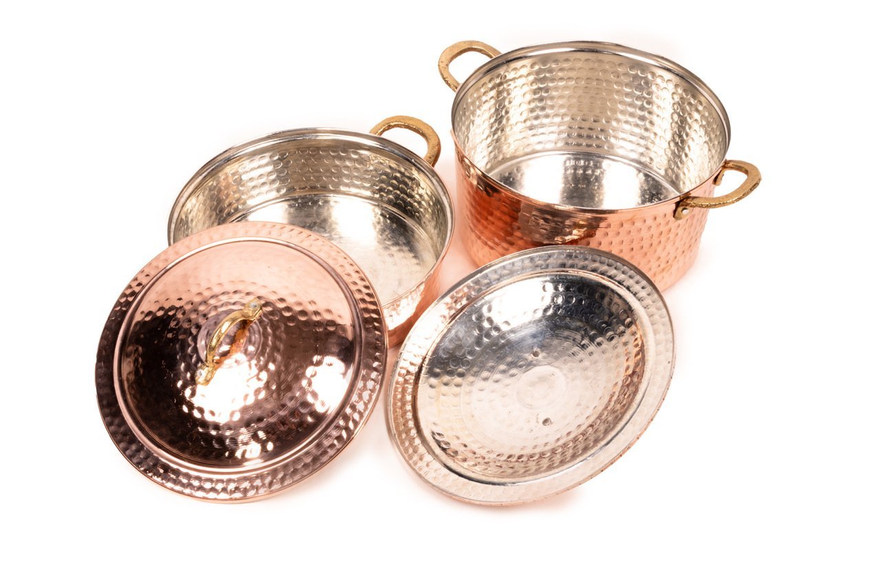 Handygoo Antepia Dövme Bakır Tencere Seti, 2 boy, modern ancak geleneksel tarzda ürettiğimiz dövme bakır tencere modellerimizi içermektedir. Set içerisinde orta boy derin bakır tencere ve yine orta boy pilav tenceresi modelimiz yer almaktadır. Set içerisindeki orta boy derin dövme bakır tenceremiz 25,5 cm çapında ve 13 cm derinliğindedir. 5 LT hacmi bulunmaktadır. Set içerisindeki orta boy dövme bakır pilav tenceresi modelimiz 25,5 cm çapında ve 8 cm derinliğindedir. Tüm yemekleriniz için birbirinden farklı boy seçeneği sunan setimiz, mutfağınızdaki dekorasyonu bütünlerken, elinizin altında sürekli bulundurmak istediğiniz ürünümüz olacaktır. Günlük kullanıma son derece uygun olan bakır tencere modellerimizin iç yüzeyi güvenle kullanımınız için kalaylanmıştır. Tüm tencerelerimiz tamamen el yapımı olup, G.Antep'li bakır ustalarımız tarafından elde dövülerek üretilmiştir. Dolayısı ile ürünlerimiz tamamen size özeldir. Ürünlerimiz kalın bakırdan üretilmektedir. Dövme bakır tencere seti ürünümüze, tüm kredi kartlarına peşin yada taksit imkanları ile güvenle sahip olabilirsiniz.