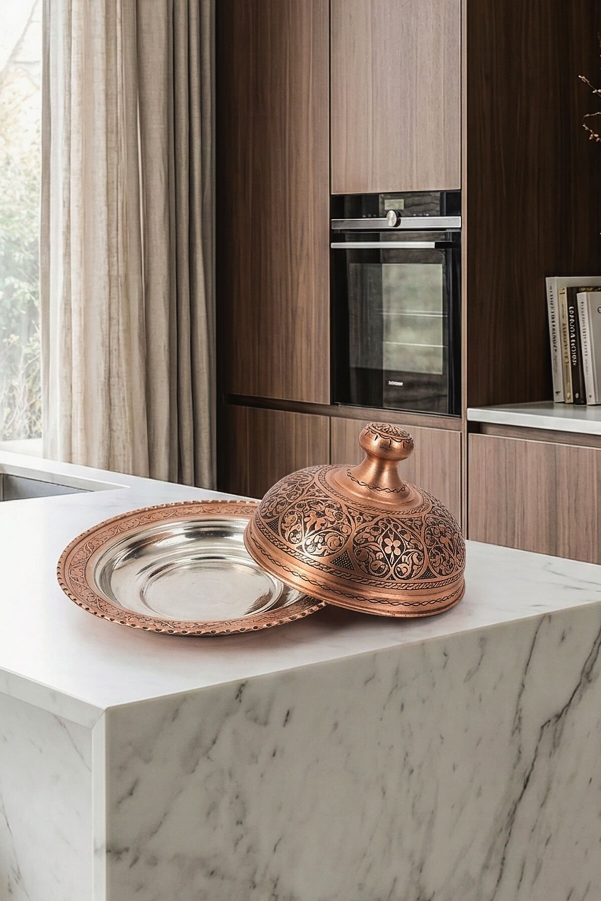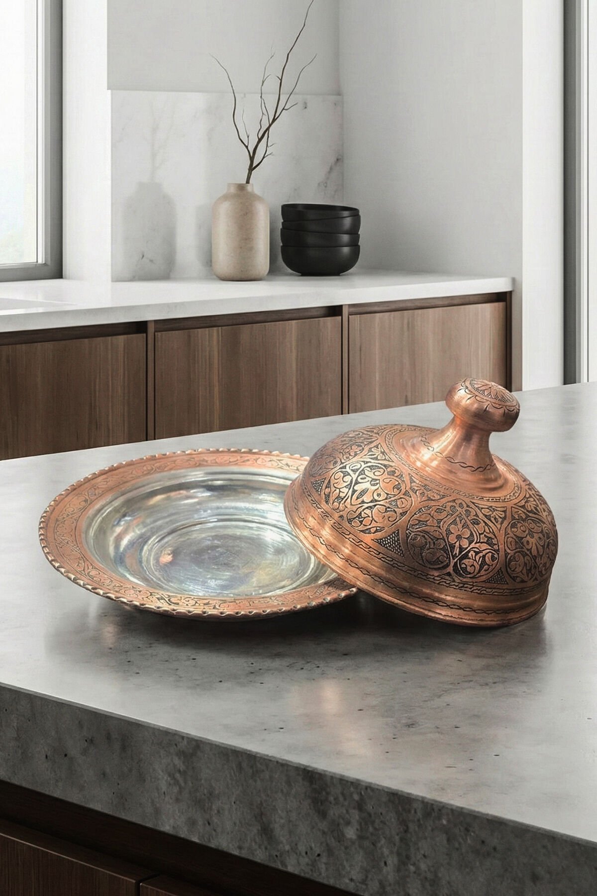 Her bir detayı sabırla ve özenle işlenen el işlemesi bakır yüzeyi, ışığı mükemmel bir şekilde yansıtarak göz alıcı bir "aura" yaratır. Görsellerde de görüldüğü gibi yoğun ve zarif motiflerle bezeli kapak, sunumlarınıza ihtişam katarken, alt tabak ise sadeliğiyle denge sağlar. Fabrikasyon ürünlerin aksine, bu dövme bakır ürünün her biri kendine hastır ve küçük detaylarda benzersizlikler taşır.
