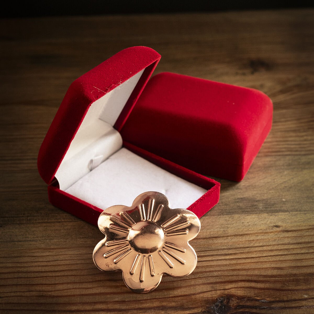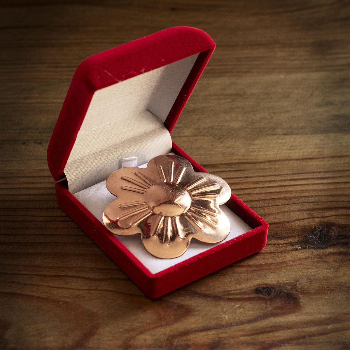 Bakır Toka modelimiz sahip olduğu çiçek şekli ile çok zariftir. Bakı rengindedir. Üretimi tarafımıza aittir ve tamamen el yapımıdır. Bakır toka modelimiz, 6 cm en ve boy ile 0,2 cm kalınlığa sahiptir. 10 gr ağırlığındadır ve %100 orijinal bakırdır ve klasik toka modellerinden bu özelliği ile ayrılmaktadır. Bakır insan vücudu için sadece dışarıdan alınabilen çok önemli bir madendir. Modelimiz, ürün görsellerinde yer aldığı üzere kırmızı şık kutusu ile birlikte satılmaktadır. Kutu boyu 8 cm, eni 6 cm ve yüksekliği 3 cm dir. Bu sayede hem kendinize hem de sevdiklerinize hediye olarak da düşünebilirsiniz. Ücretsiz kargo avantajından da faydalanabilirsiniz.