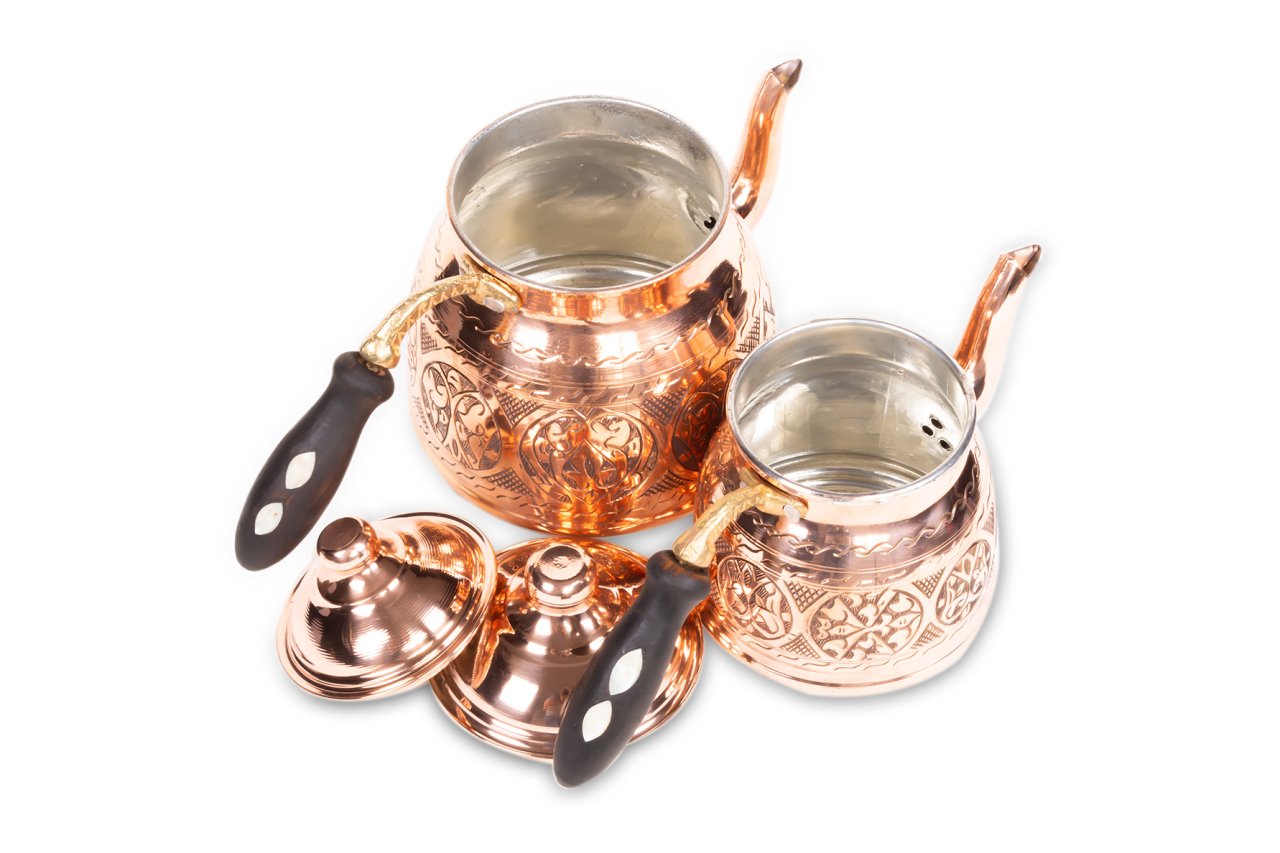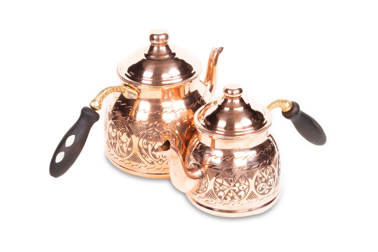 Handygoo Battal Old Passion El Yapımı Eskitme Bakır Çaydanlık, üzeri el işçiliği ile donatılmıştır. Tamamen el yapımı eskitme bakır çaydanlık, 2,8 lt lik alt demlik ve 1,8 lt lik üst demlik hacmi ile son derece ideal boyutlardadır. Kalın bakırdan üretilmiştir ve ağırlığı 1,7 kg (+50)(-50) dır. Geniş aileler için son derece kullanışlıdır. Ürünün içi tamamen kalaylanmış olup ürünün kulpları ise ahşap malzemedir. Ürün, bu ahşap kulplar üzerindeki sedef işçiliği ile bir kat daha güzelleşmekte iken, hem dekoratif, hem ergonomik hem de şık görüntüsü ile kullanmaktan zevk alacağınız aynı zamanda sevdiklerinize de mutlaka hediye etmek isteyeceğiniz bir üründür. Sitemizde eskitme, nikelajlı ve kırmızı bakır modeli olmak üzere 3 farklı seçeneği olan bakır çaydanlık ürününe ücretsiz kargo fırsatı ile sahip olabilirsiniz.