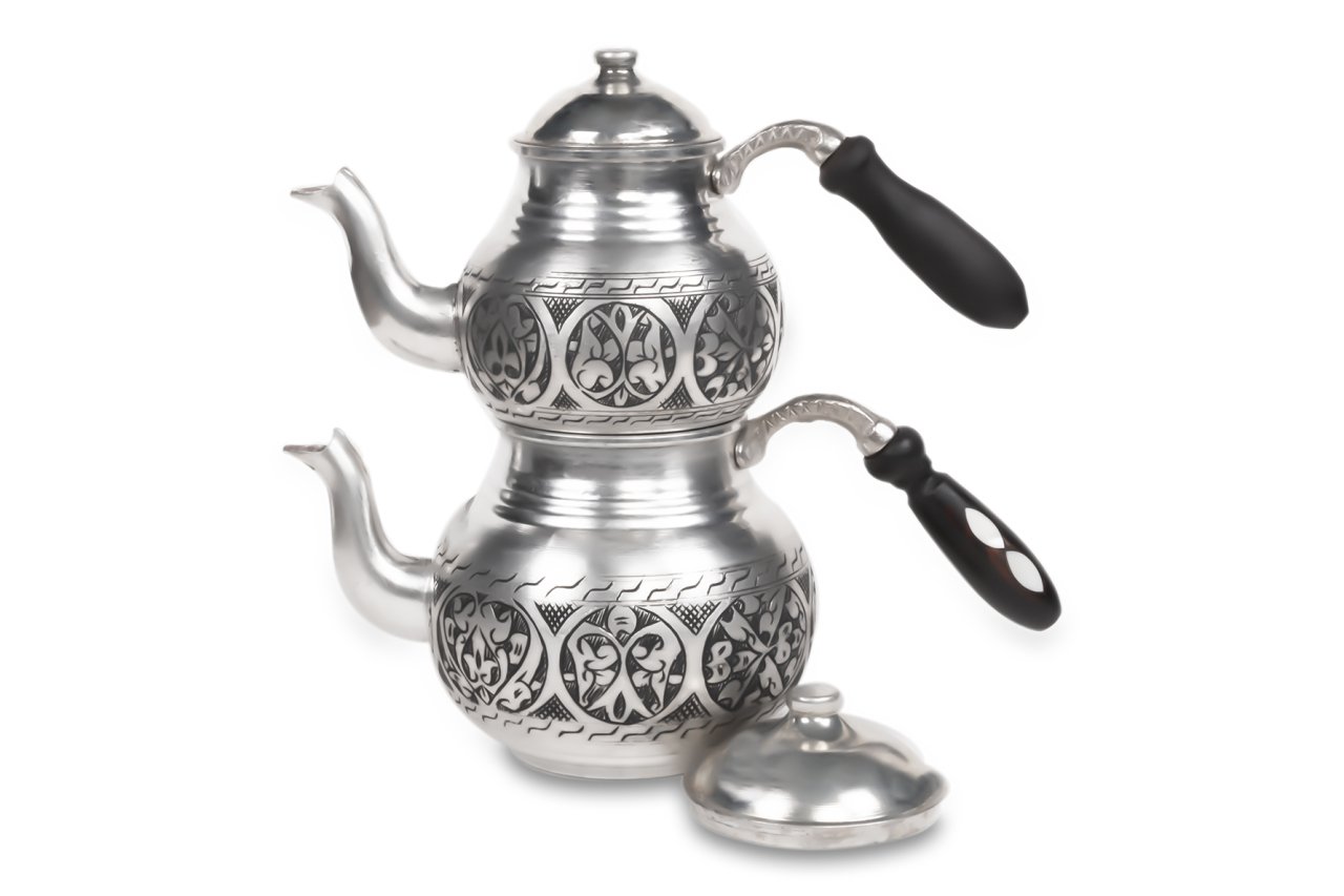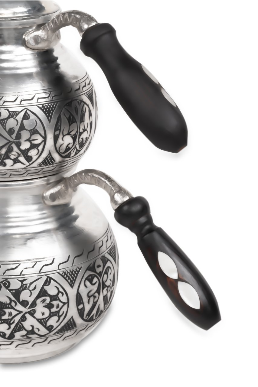 Handygoo Battal Tombul El Yapımı Eskitme Bakır Çaydanlık, üzeri el işçiliği ile donatılmıştır. Tamamen el yapımı eskitme bakır çaydanlık, 2,8 lt lik alt demlik ve 1,8 lt lik üst demlik hacmi ile son derece ideal boyutlardadır. Kalın bakırdan üretilmiştir ve ağırlığı 1,7 kg (+50)(-50) dır. Geniş aileler için son derece kullanışlıdır. Ürünün içi tamamen kalaylanmış olup ürünün kulpları ise ahşap malzemedir. Ürün, bu ahşap kulplar üzerindeki sedef işçiliği ile bir kat daha güzelleşmekte iken, hem dekoratif, hem ergonomik  hem de şık görüntüsü ile kullanmaktan zevk alacağınız aynı zamanda sevdiklerinize de mutlaka hediye etmek isteyeceğiniz bir üründür. Sitemizde eskitme, nikelajlı ve kırmızı bakır modeli olmak üzere 3 farklı seçeneği olan bakır çaydanlık ürününe ücretsiz kargo fırsatı ile sahip olabilirsiniz.