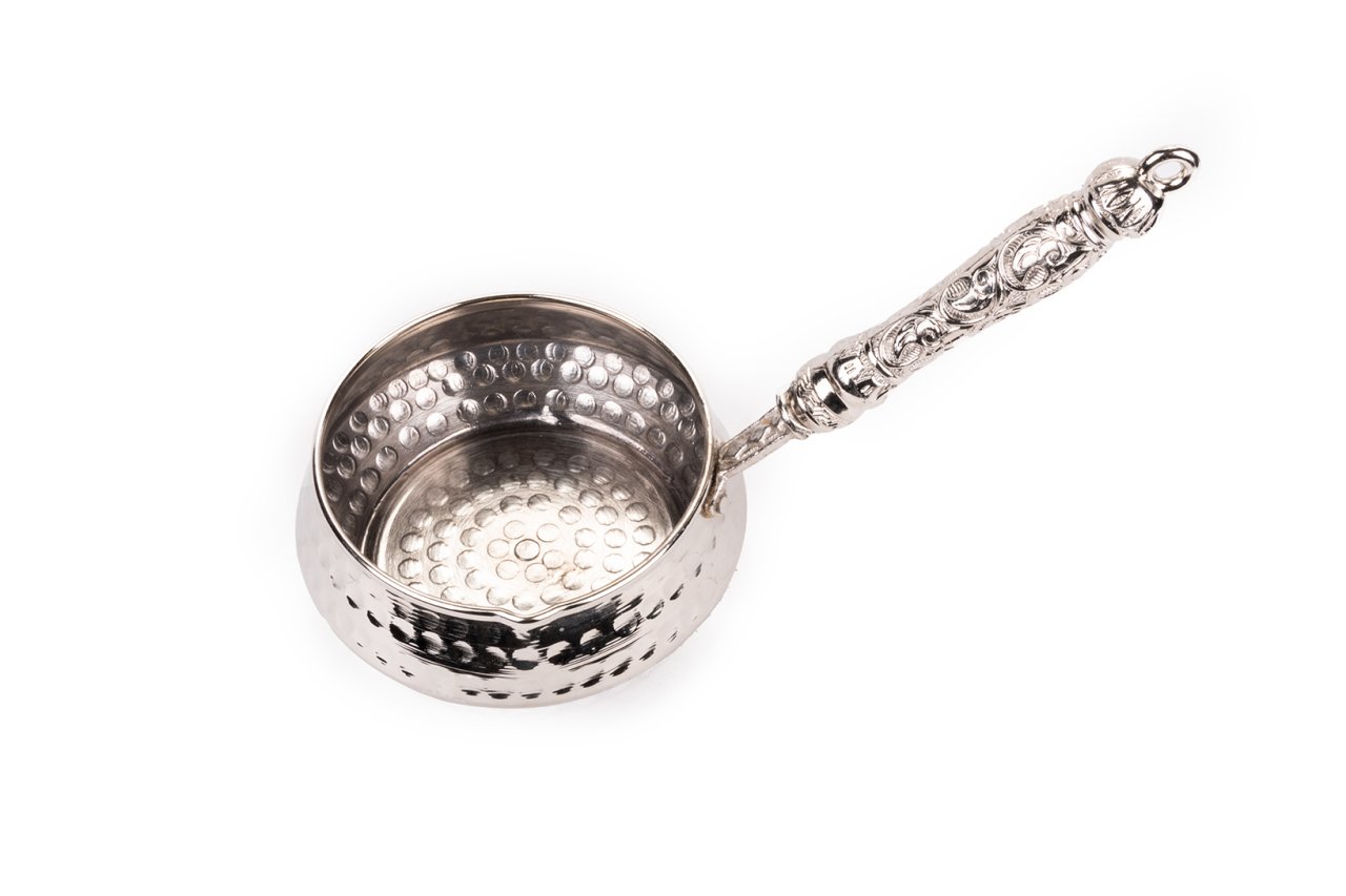 Handygoo Beyaz Saplı Nikelajlı Dövme Bakır Sosluk, lezzetli soslar ve yağ kızdırmak için kullanabileceğiniz son derece pratik ve dekoratif bir tavadır. Ürün 11 cm çap, 5 cm yükseklik ve 18 cm lik sap ölçüleri ile her mutfakta elinizin altında olmasını isteyebileceğiniz bir üründür. Ürünümüz, el yapımı olup, kalın bakırdan üretilmiştir. Üzerindeki dövme işçiliği Gaziantep'li bakır işleme ustalarımız tarafından yapılmıştır. %100 el yapımı olmasından dolayı ürün size özeldir.