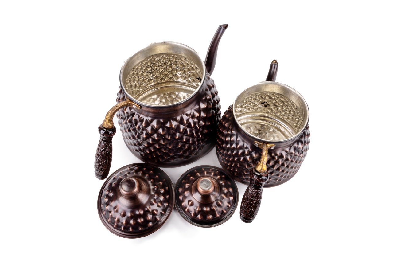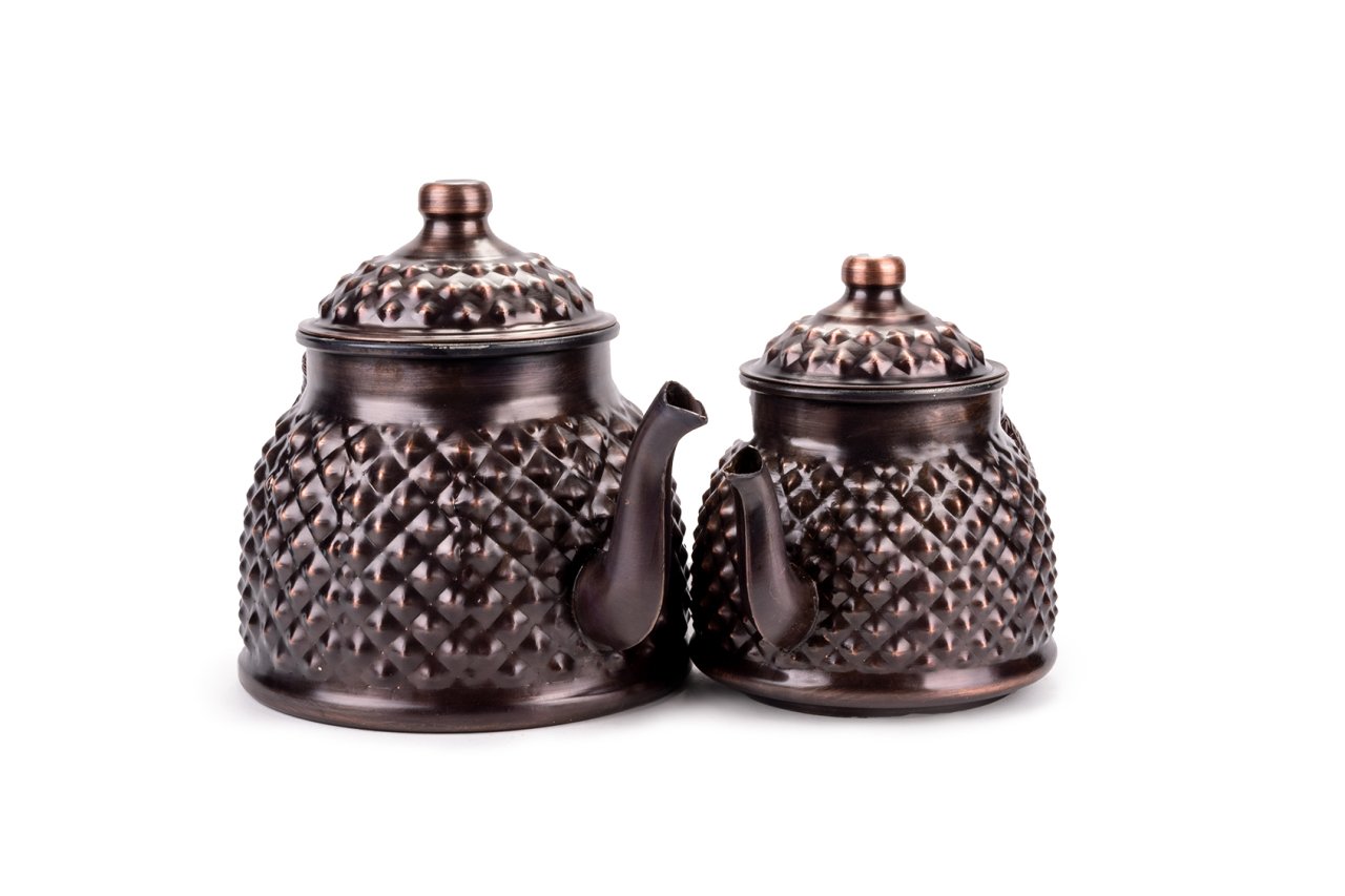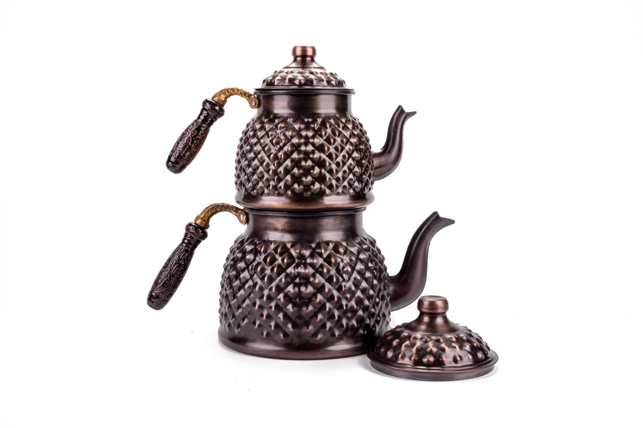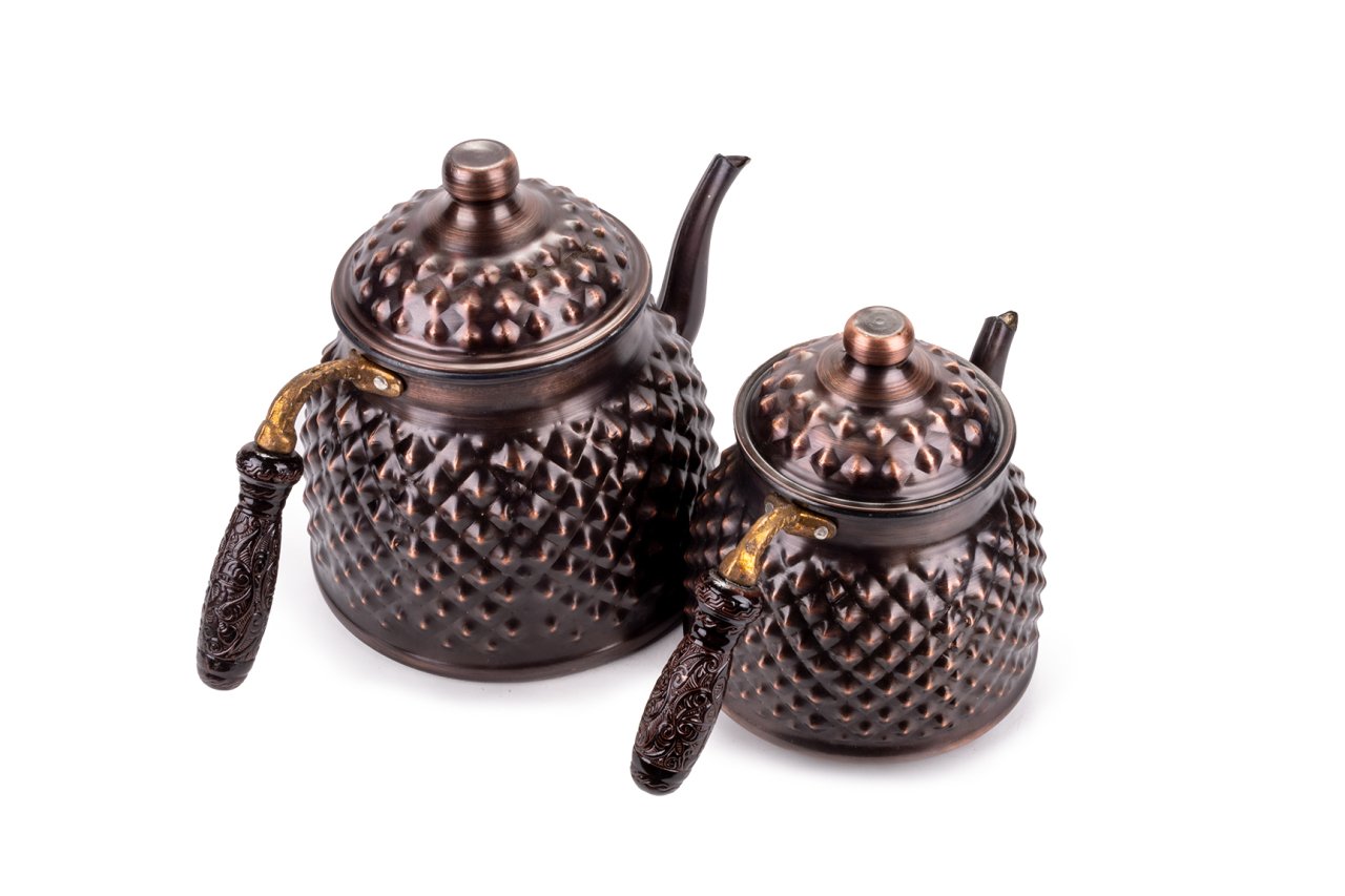 Handygoo Büyük Boy Dark Keops Bakır Çaydanlık, bakır çaydanlık modellerinde yeni bir nefes, farklı bir tarz. Lezzetli çaylar demlemeniz için tasarlandı. Kahvaltıda, ara öğünlerde, yemekten sonra, tatlının yanında...Hiç şüphesiz çay içmenin yeri ve zamanı yoktur. Bu doğrultuda da çay, pek çok insan için önem verilen içeceklerin başında gelir. Gün içerisinde kimi zaman bir bardak, kimi zaman ise bir demlik çay içilebilmektedir. Ortak bir çay demleme yöntemi bulunmamaktadır ancak bilindiği üzere bakır ürünlerde demlenen, servis edilen her içeceğin lezzetinin arttığı bir gerçektir. Çayınızı demlerken, bu ürün, şık ve otantik görüntüsü ile yine fark yaratmanızı sağlayacaktır. Klasik ürün modelinde yani iki ana kısımdan oluşmaktadır. Her iki kısım üzerinde ham bakır üzerine ustaca ve sabırla işlenmiş, piramit şekilleri yer almaktadır. Her iki parçanın da birbirinden bağımsız kapakları yer almaktadır. Kulplar son derece şık ve göz alıcıdır. Bakır çaydanlık, evinize, ofisinize yada bulunduğunuz herhangi bir mekana zerafet ve şıklık getirecektir. Kendiniz yada hediye ettiğiniz sevdikleriniz çaylarını iki kat keyif ile yudumlayacaklardır. Çaydanlık su haznesi 2,8 litre su almaktadır. Üst demlik ise 1,8 lt su almaktadır. Kalın bakırdan üretilmiştir. Evinize, iş yerinize ve tüm sevdiklerinize satın alabileceğiniz bu harika bakır çaydanlık modelimize hemen sahip olabilirsiniz.