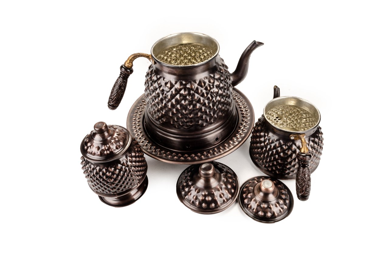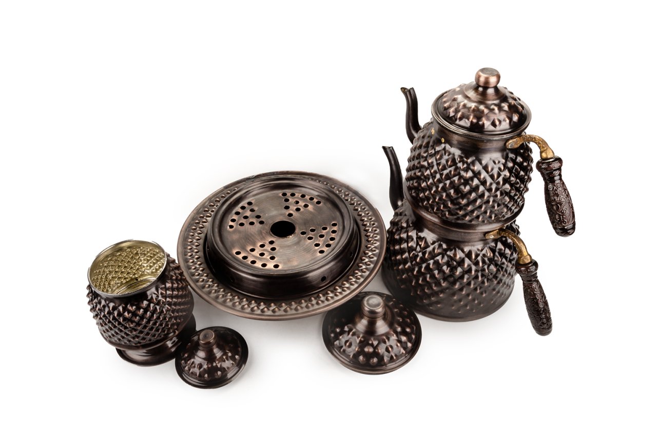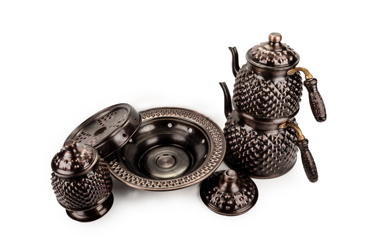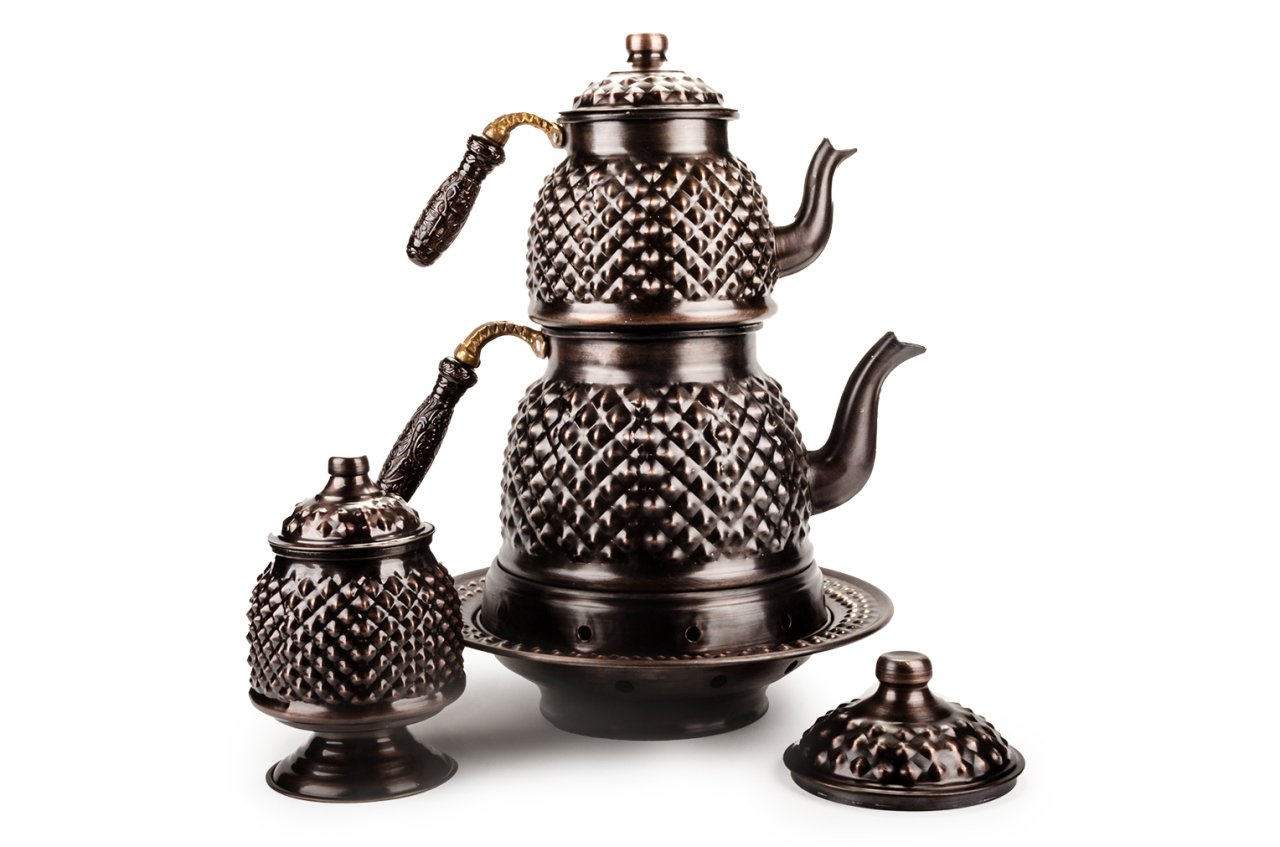 Handygoo Büyük Boy Dark Keops Bakır Çaydanlık ve Bakır Şekerlik Seti, bakır çaydanlık ve çay servisi setlerinde yepyeni bir model ve tarz olarak karşınızda. Geniş aileler ve kalabalık servisler için son derece idealdir. Ürün, bakır çaydanlık, bakır balkon sefası ve bakır şekerlik olmak üzere 3 parça set olarak satılmaktadır. Dilerseniz setin tüm parçalarını bağımsız olarak da sitemizden satın alabilirsiniz. Çayınızı demlerken ve servis ederken, bu ürün, şık ve otantik görüntüsü ile yine fark yaratmanızı sağlayacaktır. Bakır çaydanlık iki ana kısımdan oluşmaktadır. Her iki kısım üzerinde ham bakır üzerine ustaca ve sabırla işlenmiş, piramit şekilleri yer almaktadır. Her iki parçanın da birbirinden bağımsız kapakları yer almaktadır. Kulplar son derece şık ve göz alıcıdır. Bakır çaydanlık, evinize, ofisinize yada bulunduğunuz herhangi bir mekana zerafet ve şıklık getirecektir. Kendiniz yada hediye ettiğiniz sevdikleriniz çaylarını iki kat keyif ile yudumlayacaklardır. Çaydanlık su haznesi 2,8 litre su almaktadır. Üst demlik ise 1,8 lt su almaktadır. Kalın bakırdan üretilmiştir Balkon sefası iç çapı 18 cm iken, dış çapı 25 cm dir. Bakır balkon sefası yüksekliği 11 cm dir. Bakır balkon sefası, özellikle çay servisiniz esnasında çaydanlıklarınızın ısısını kaybetmemesi için tasarlandı. Özellikle bakır çaydanlık ürünleri ile bir bütün oluştururken dilerseniz porselen yada emaye demlik ve çaydanlıklarınız ile de rahatlıkla kullanabilirsiniz. Altında mumluk alanı yer alan ürün sayesinde tea light mumlarınız yada jel ile size hem romantik bir ortam sağlayacak, hem de enfes çay ve benzeri içecek ikramlarınız her daim sıcak kalacak. Bakır şekerlik yine özel tasarımdır. Ürünün ağız çapı 8,5 cm, taban çapı 12 cm dir. Ürün yüksekliği 17 cm dir. Şekerlik ayaklığının çapı ise 10 cm dir. Ürünün içi kalaylanmıştır. Hem dekoratif hem de şık görüntüsü ile evinizde ve iş yerinizde günlük olarak kullanmaktan büyük zevk duyacaksınız.