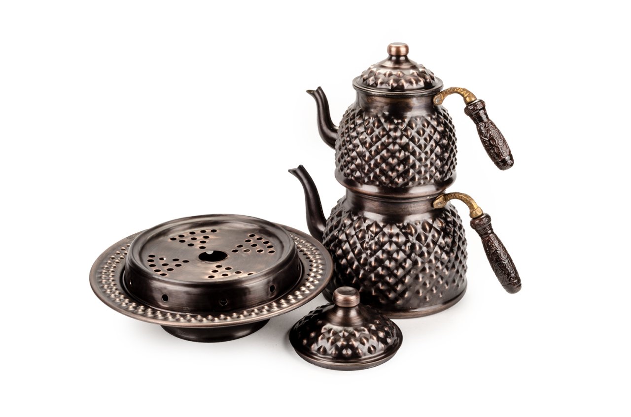 Handygoo Büyük Boy Dark Keops Bakır Çaydanlık ve Balkon Sefası, bakır çaydanlık modellerinde yeni bir nefes, farklı bir tarz. Lezzetli çaylar demlemeniz için tasarlandı. Kahvaltıda, ara öğünlerde, yemekten sonra, tatlının yanında...Hiç şüphesiz çay içmenin yeri ve zamanı yoktur. Bu doğrultuda da çay, pek çok insan için önem verilen içeceklerin başında gelir. Gün içerisinde kimi zaman bir bardak, kimi zaman ise bir demlik çay içilebilmektedir. Ortak bir çay demleme yöntemi bulunmamaktadır ancak bilindiği üzere bakır ürünlerde demlenen, servis edilen her içeceğin lezzetinin arttığı bir gerçektir. Çayınızı demlerken, bu ürün, şık ve otantik görüntüsü ile yine fark yaratmanızı sağlayacaktır. Ürün bakır çaydanlık ve kendisi ile takım balkon sefası ile birlikte satılmaktadır. Bakır çaydanlık iki ana kısımdan oluşmaktadır. Her iki kısım üzerinde ham bakır üzerine ustaca ve sabırla işlenmiş, piramit şekilleri yer almaktadır. Her iki parçanın da birbirinden bağımsız kapakları yer almaktadır. Kulplar son derece şık ve göz alıcıdır. Bakır çaydanlık, evinize, ofisinize yada bulunduğunuz herhangi bir mekana zerafet ve şıklık getirecektir. Kendiniz yada hediye ettiğiniz sevdikleriniz çaylarını iki kat keyif ile yudumlayacaklardır. Çaydanlık su haznesi 2,8 litre su almaktadır. Üst demlik ise 1,8 lt su almaktadır. Kalın bakırdan üretilmiştir. Geniş aileler için son derece uygundur. Balkon sefası iç çapı 18 cm iken, dış çapı 25 cm dir. Bakır balkon sefası yüksekliği 11 cm dir. Bakır balkon sefası, özellikle çay servisiniz esnasında çaydanlıklarınızın ısısını kaybetmemesi için tasarlandı. Özellikle bakır çaydanlık ürünleri ile bir bütün oluştururken dilerseniz porselen yada emaye demlik ve çaydanlıklarınız ile de rahatlıkla kullanabilirsiniz. Altında mumluk alanı yer alan ürün sayesinde tea light mumlarınız yada jel ile size hem romantik bir ortam sağlayacak, hem de enfes çay ve benzeri içecek ikramlarınız her daim sıcak kalacak.