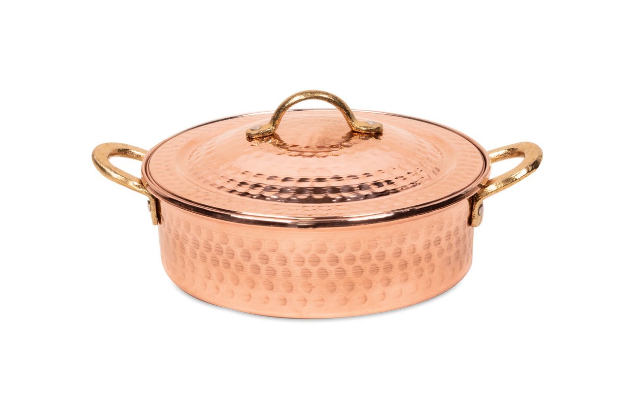 Handygoo Büyük Boy Dövme Bakır Pilav Tenceresi, son derece modern fakat bir o kadar da geleneksel tasarımı ile göz dolduruyor. 29 cm çap ve 8 cm derinliği ile pilav, karnıyarık vb. yemeklerinizi bakır tencere lezzetinde pişirmek için son derece kullanışlıdır. Kapağındaki özel tasarımımız ile birlikte, kapak kenarları bakır tencere dışına damlatma yapmamaktadır. Günlük kullanımda güvenle kullanımınız için iç kısmı tamamen kalaylanmıştır. Ürün bakır kaplama değildir. Gerçek bakırdan elde şekil verilerek ve yine elde çekiç ile dövülerek üretilmiştir. Kalın bakırdan üretilen dövme bakır tencere kendi imalatımızdır. Mutfağınızda severek kullanabileceğiniz bakır pilav tenceresi, mutfağınızdaki diğer çelik, granit vb tencerelerinizi de dekoratif olarak tamamlayacaktır.