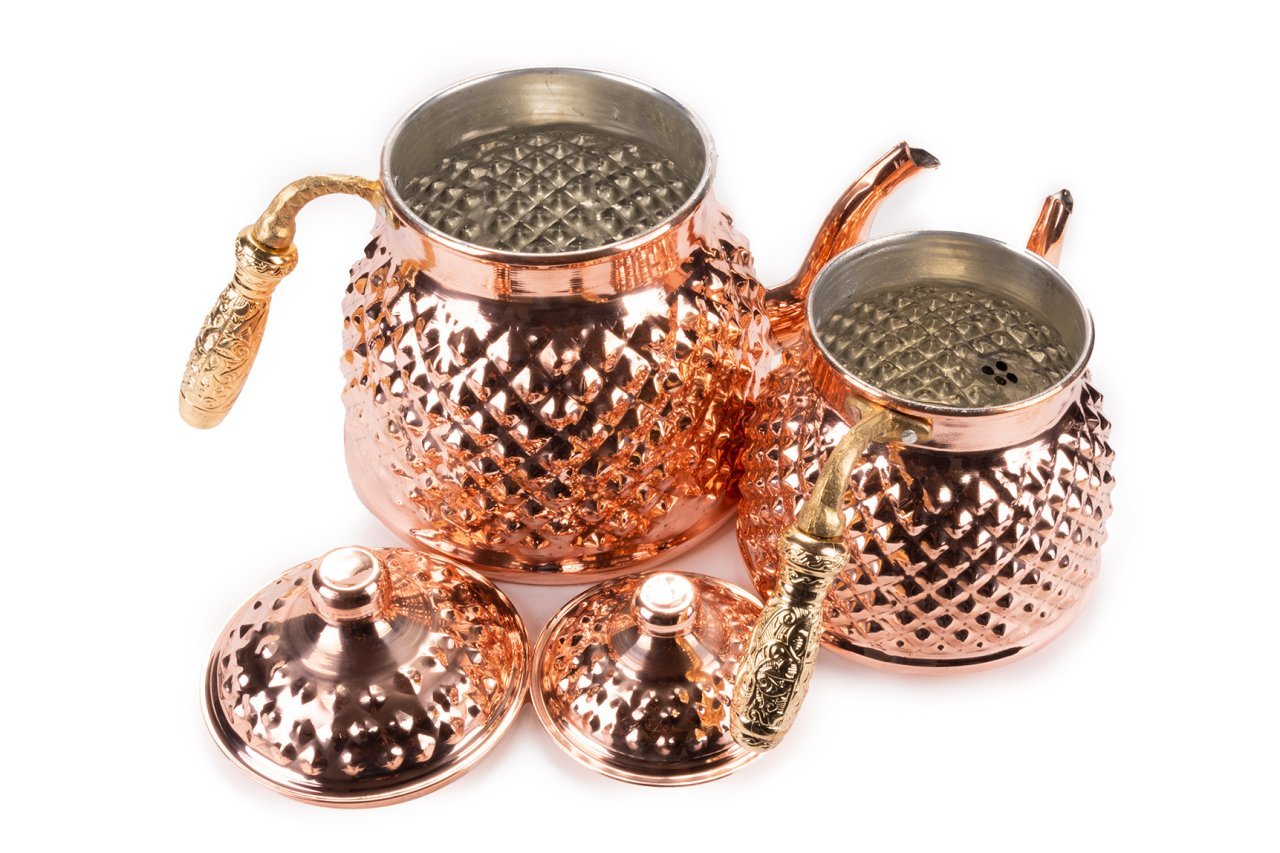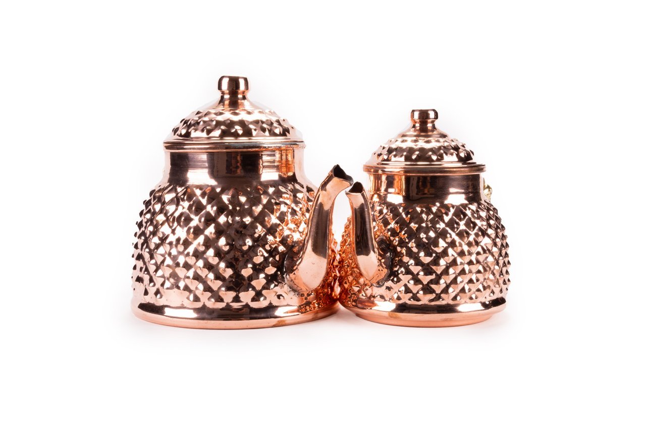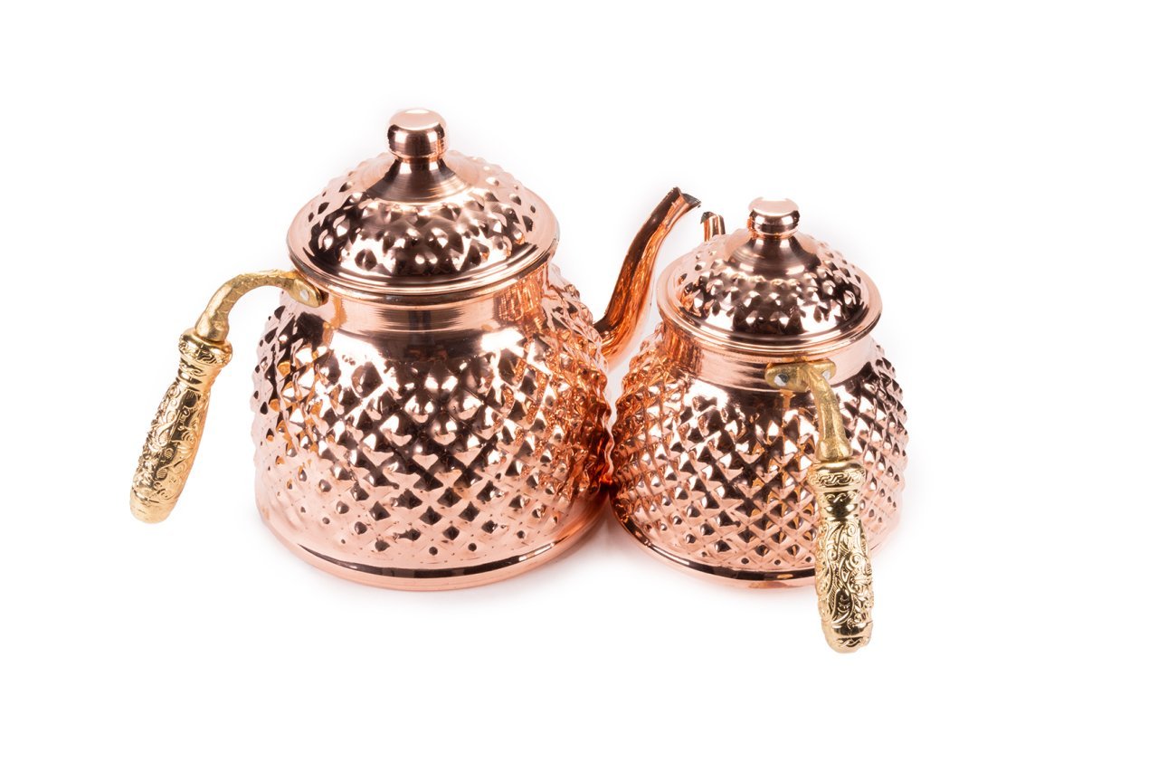 Handygoo Büyük Boy Kırmızı Keops Bakır Çaydanlık, bakır çaydanlık modellerinde yeni bir nefes, farklı bir tarz. Lezzetli çaylar demlemeniz için tasarlandı. Kahvaltıda, ara öğünlerde, yemekten sonra, tatlının yanında...Hiç şüphesiz çay içmenin yeri ve zamanı yoktur. Bu doğrultuda da çay, pek çok insan için önem verilen içeceklerin başında gelir. Gün içerisinde kimi zaman bir bardak, kimi zaman ise bir demlik çay içilebilmektedir. Ortak bir çay demleme yöntemi bulunmamaktadır ancak bilindiği üzere bakır ürünlerde demlenen, servis edilen her içeceğin lezzetinin arttığı bir gerçektir. Çayınızı demlerken, bu ürün, şık ve otantik görüntüsü ile yine fark yaratmanızı sağlayacaktır. Klasik ürün modelinde yani iki ana kısımdan oluşmaktadır. Her iki kısım üzerinde ham bakır üzerine ustaca ve sabırla işlenmiş, piramit şekilleri yer almaktadır. Her iki parçanın da birbirinden bağımsız kapakları yer almaktadır. Kulplar son derece şık ve göz alıcıdır. Bakır çaydanlık, evinize, ofisinize yada bulunduğunuz herhangi bir mekana zerafet ve şıklık getirecektir. Kendiniz yada hediye ettiğiniz sevdikleriniz çaylarını iki kat keyif ile yudumlayacaklardır. Çaydanlık su haznesi 2,8 litre su almaktadır. Üst demlik ise 1,8 lt su almaktadır. Kalın bakırdan üretilmiştir. Evinize, iş yerinize ve tüm sevdiklerinize satın alabileceğiniz bu harika bakır çaydanlık modelimize hemen sahip olabilirsiniz.