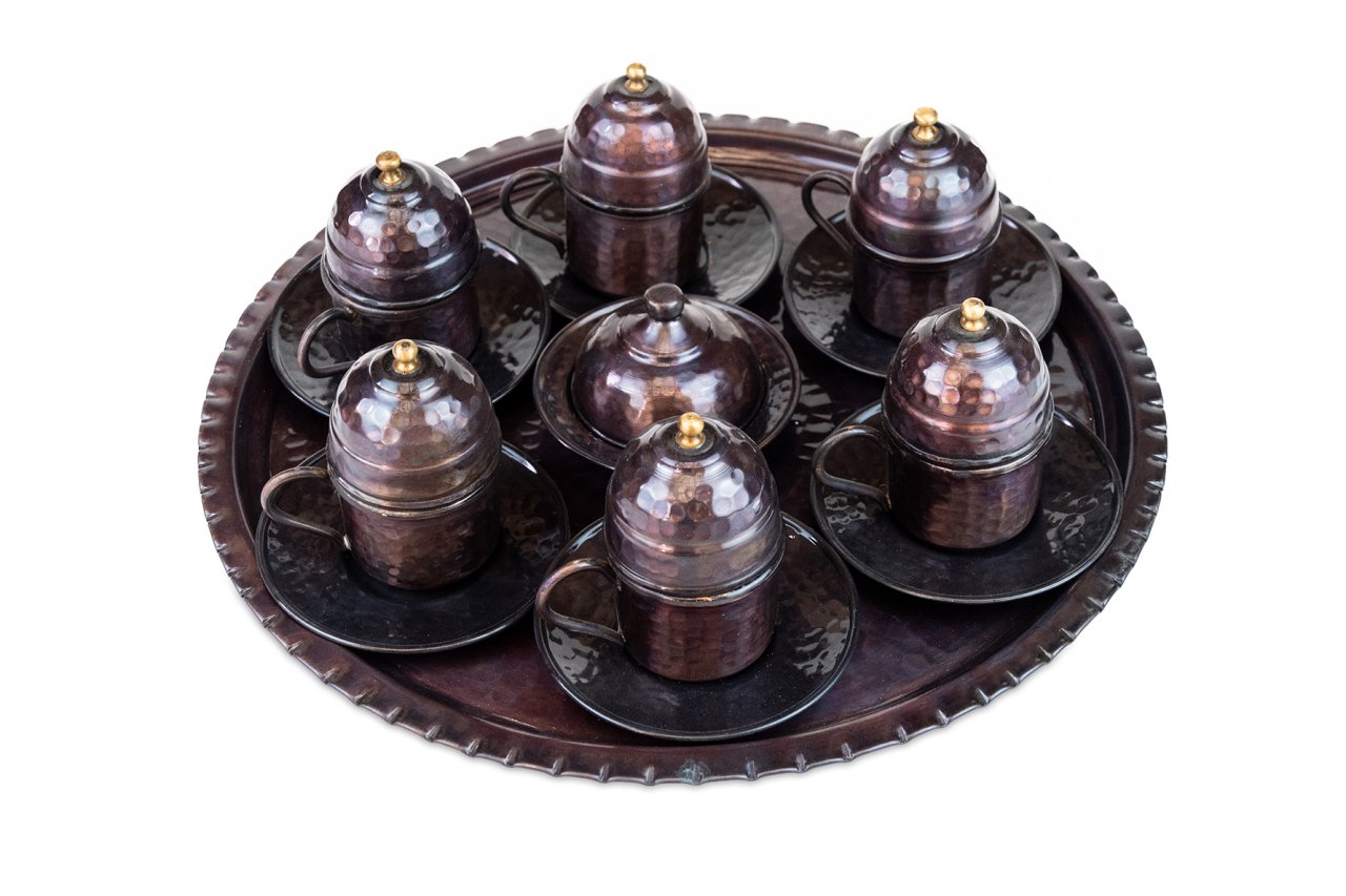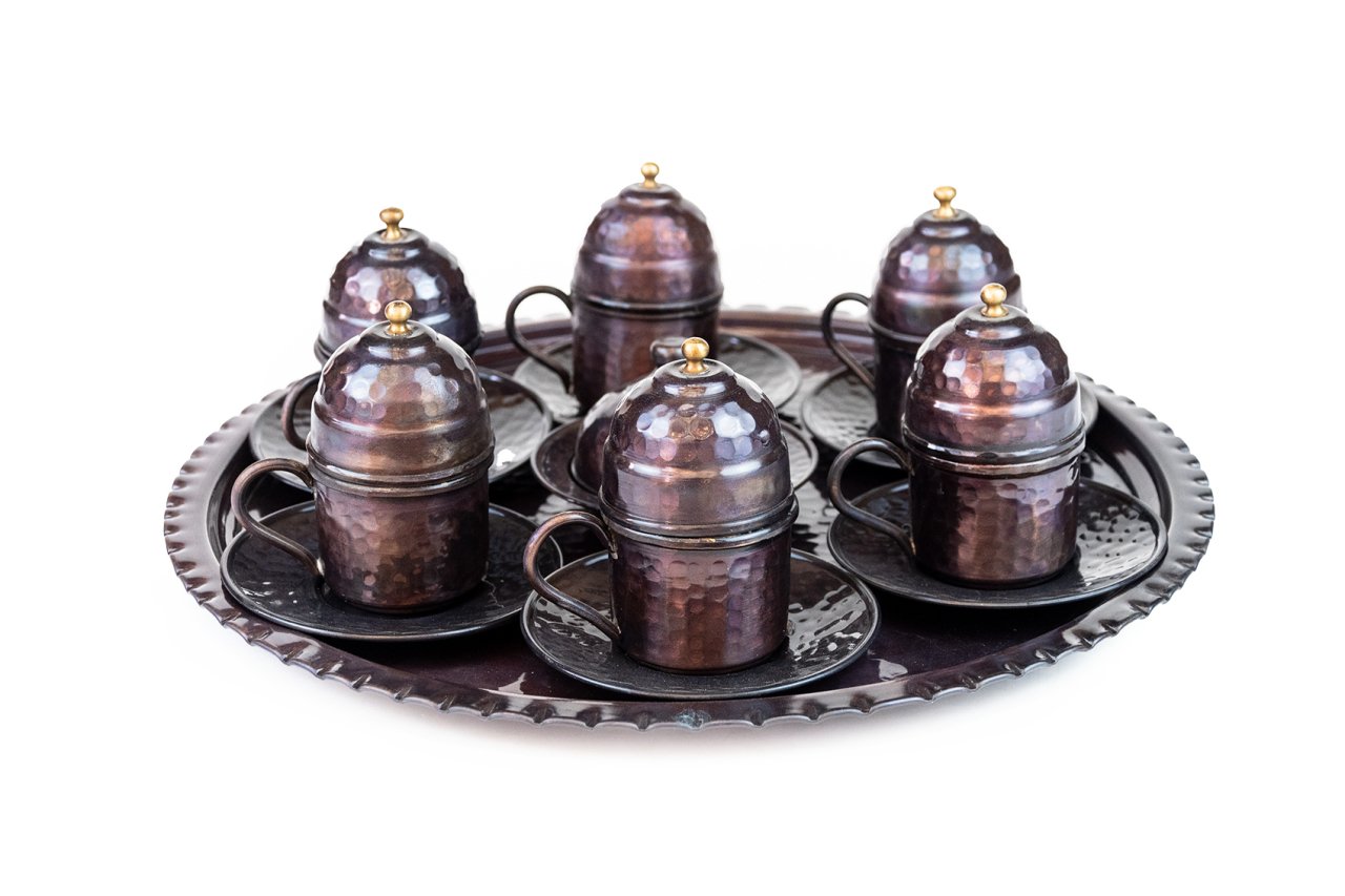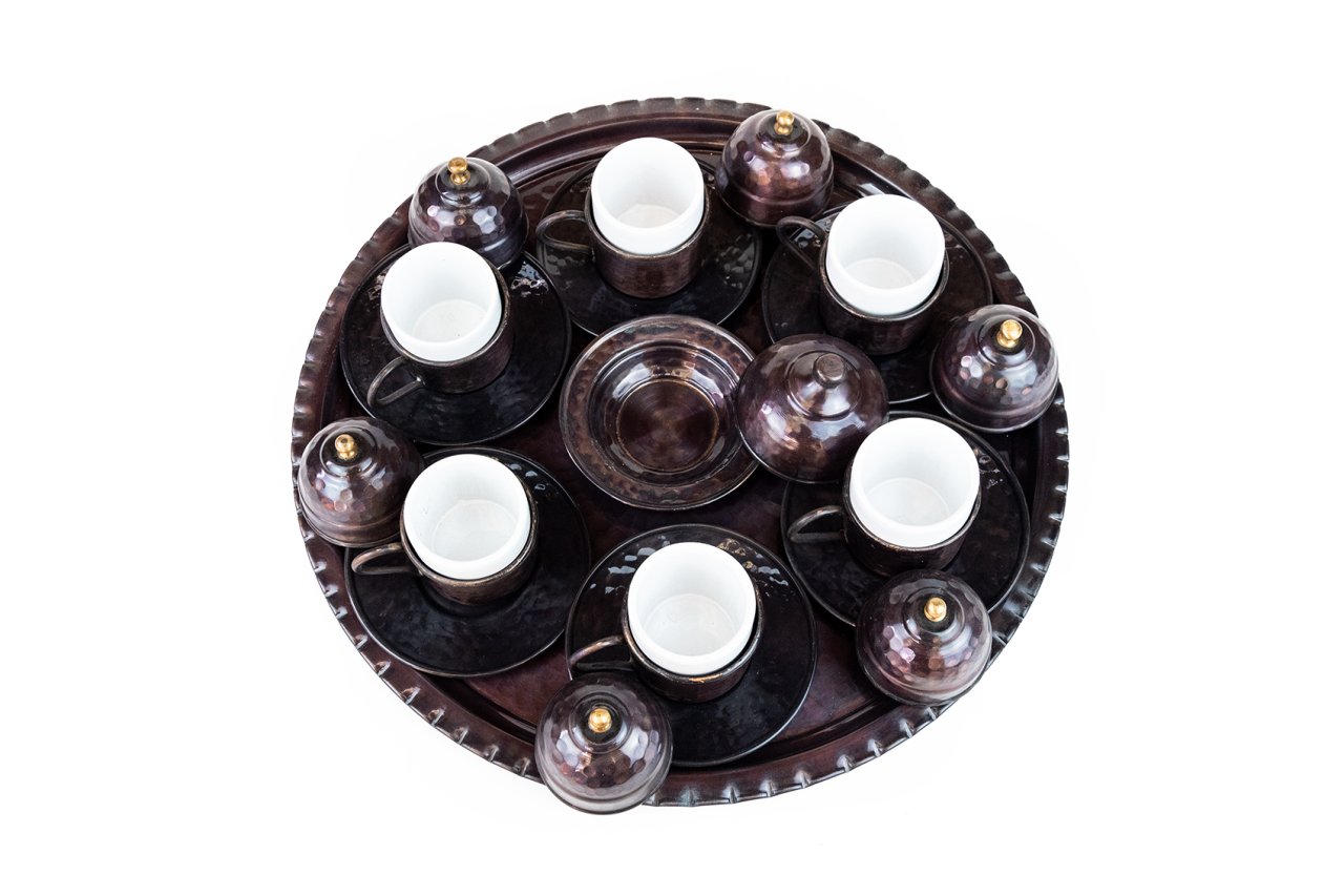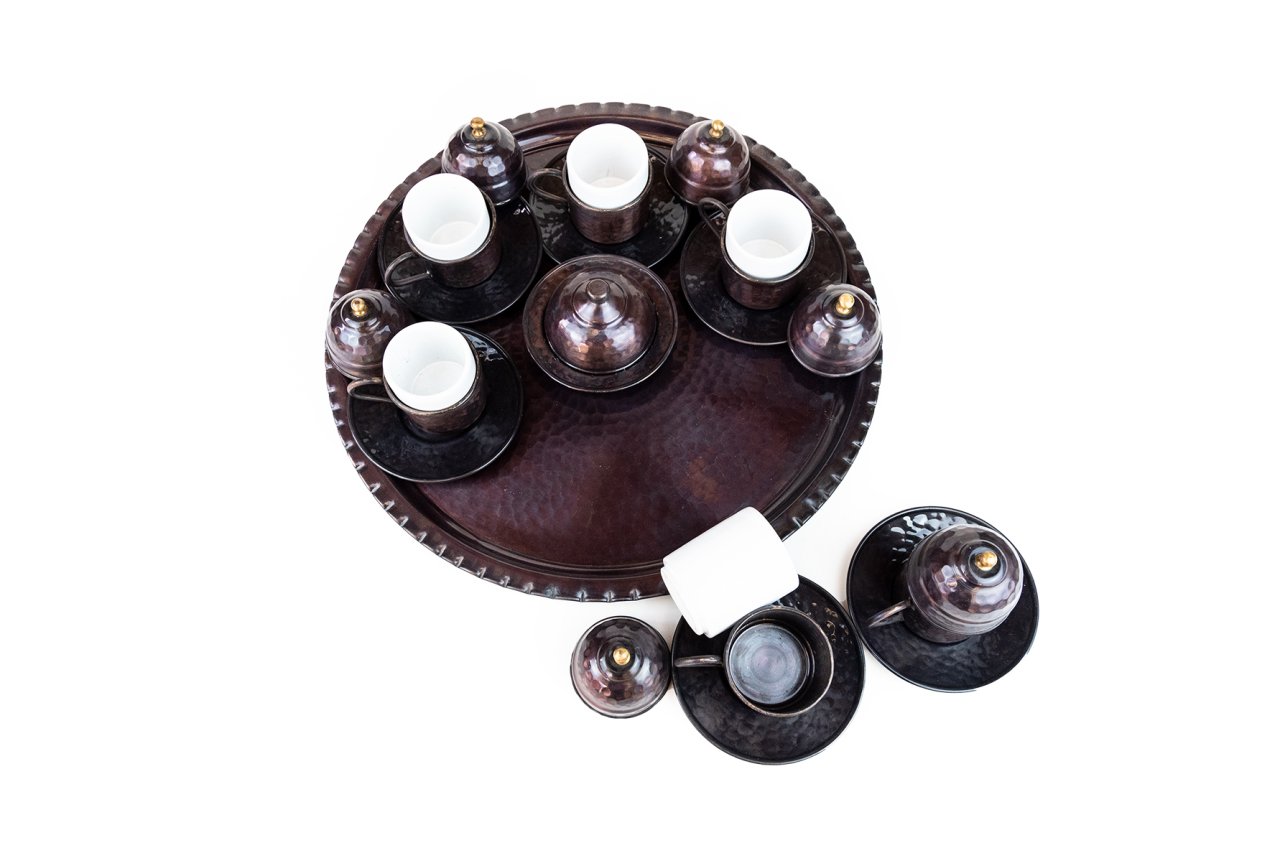 Handygoo Dark Altı Kişilik Bakır Kahve Fincanı Seti, Türk kahvesi sunum ve servisleriniz için özel olarak tasarlandı. Ürünümüzün tamamı bakırdan üretilmiştir. Kahve fincanlarından, fincan altlıklarına, lokumluğundan tepsisine kadar baştan sona el yapımıdır. Bakır kahve fincanı seti üzerindeki tüm çekiçleme G.Antep'li bakır nakış ve işleme ustalarımız tarafından özenle sizler için yapılmıştır. Dolayısı ile her bir setimiz aslında size özeldir. Özellikle koyu ve çok özel rengi ile dikkatleri üzerine toplayan bakır kahve fincanı seti modelimiz, türk kahvesi servis, sunum ve içim zevkinizi oldukça yükseklere taşımaktadır. Görenleri kendisine hayran bırakacağından emin olabilirsiniz. Bakır kahve fincanı seti modelimiz kendi imalatımız olup kalın bakırdan üretilmiştir. Set içerisinde, tepsisi, 6 adet kapaklı kahve fincan kaidesi, 6 adet porselen kahve fincanı, 6 adet fincan tabağı ve lokumluk yer almaktadır. Tepsi 35 cm çapında dövme bakır ve 2 cm kalınlığındadır. Fincan kaideleri 5 cm çap ve 4,5 cm yüksekliğinde ve yine dövme bakırdır. Porselen kahve fincanları ise 4,8 cm çap ve 5,8 cm yüksekliğe sahiptir. Fincanlar kapakları ile birlikte toplam 9,5 cm yüksekliğe sahiptir. Dövme bakır lokumluk 9,5 cm çap ve 5,5 cm yüksekliğindedir. Günlük kullanımda, kullanmaktan büyük zevk duyacağınız ürünümüz aynı zamanda sevdikleriniz için son derece ideal bir hediye de olacaktır. Ayrıca sitemizde bakır kahve fincanı setinize uygun olacak aynı renk cezve modelleri ile birlikte yine tercih edebileceğiniz farklı bakır cezve modellerimizi bulabilirsiniz.