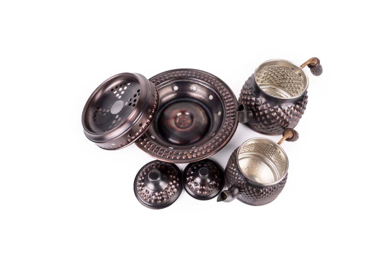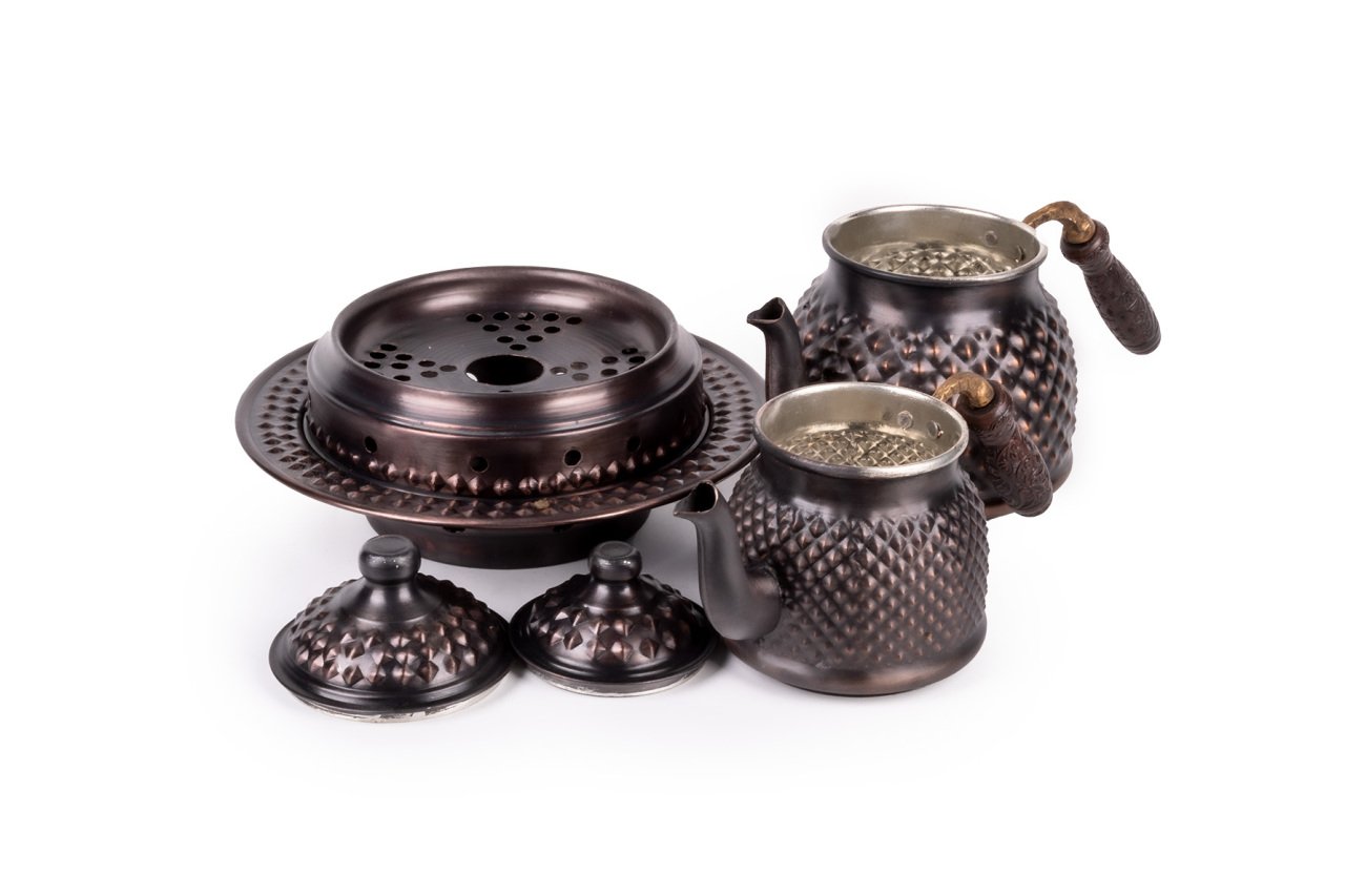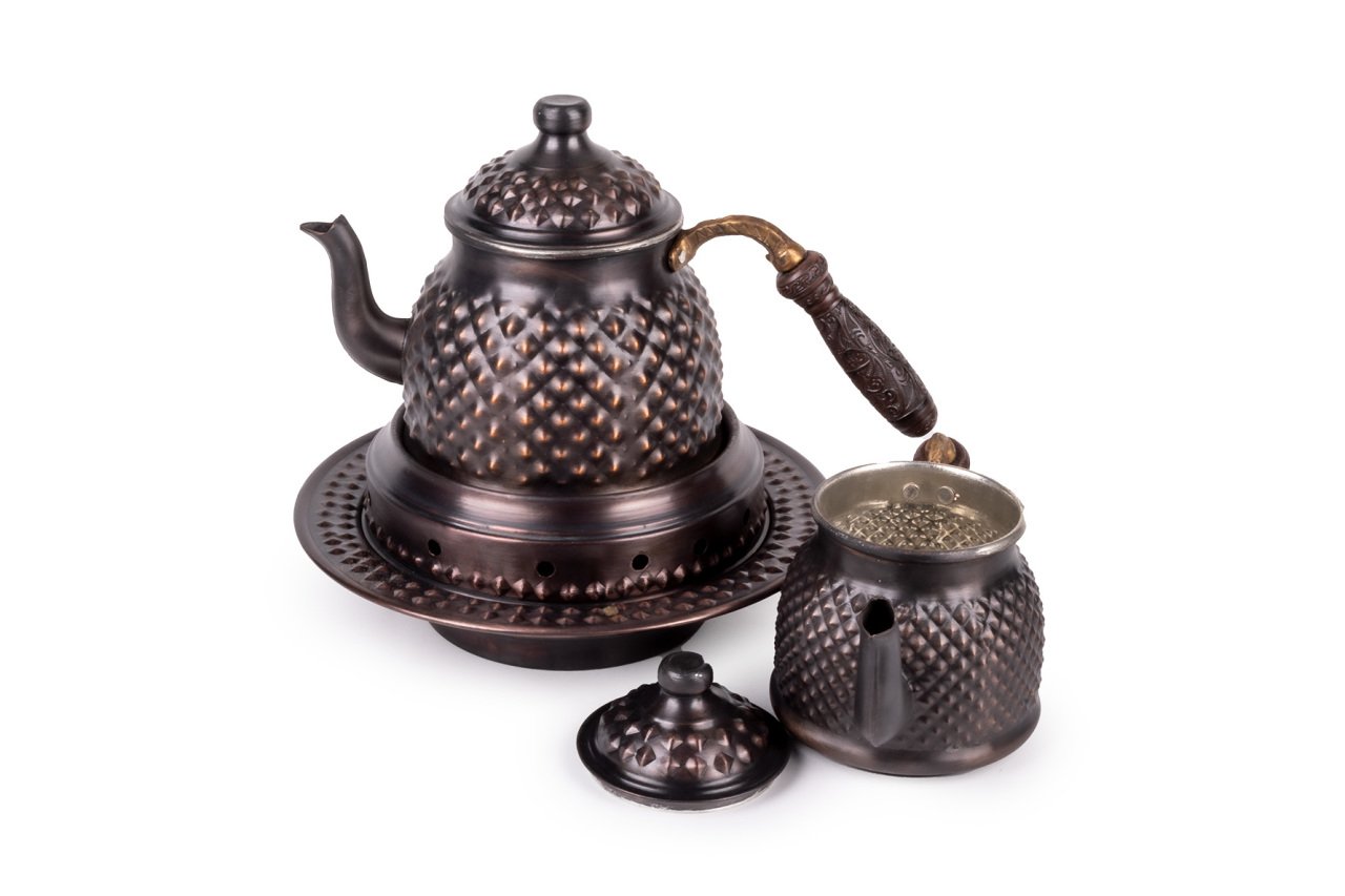 Handygoo Dark Keops Bakır Çaydanlık ve Balkon Sefası, bakır çaydanlık modellerinde yeni bir nefes, farklı bir tarz. Lezzetli çaylar demlemeniz için tasarlandı. Kahvaltıda, ara öğünlerde, yemekten sonra, tatlının yanında...Hiç şüphesiz çay içmenin yeri ve zamanı yoktur. Bu doğrultuda da çay, pek çok insan için önem verilen içeceklerin başında gelir. Gün içerisinde kimi zaman bir bardak, kimi zaman ise bir demlik çay içilebilmektedir. Ortak bir çay demleme yöntemi bulunmamaktadır ancak bilindiği üzere bakır ürünlerde demlenen, servis edilen her içeceğin lezzetinin arttığı bir gerçektir. Çayınızı demlerken, bu ürün, şık ve otantik görüntüsü ile yine fark yaratmanızı sağlayacaktır. Ürün bakır çaydanlık ve kendisi ile takım balkon sefası ile birlikte satılmaktadır. Bakır çaydanlık iki ana kısımdan oluşmaktadır. Her iki kısım üzerinde ham bakır üzerine ustaca ve sabırla işlenmiş, piramit şekilleri yer almaktadır. Her iki parçanın da birbirinden bağımsız kapakları yer almaktadır. Kulplar son derece şık ve göz alıcıdır. Bakır çaydanlık, evinize, ofisinize yada bulunduğunuz herhangi bir mekana zerafet ve şıklık getirecektir. Kendiniz yada hediye ettiğiniz sevdikleriniz çaylarını iki kat keyif ile yudumlayacaklardır. Çaydanlık su haznesi 1,8 litre su almaktadır. Üst demlik ise 0,8 lt su almaktadır. Kalın bakırdan üretilmiştir ve ağırlığı 1 kg (+50)(-50) dır. Balkon sefası iç çapı 16 cm iken, dış çapı 24 cm dir. Bakır balkon sefası yüksekliği 11 cm dir. Bakır balkon sefası, özellikle çay servisiniz esnasında çaydanlıklarınızın ısısını kaybetmemesi için tasarlandı. Özellikle bakır çaydanlık ürünleri ile bir bütün oluştururken dilerseniz porselen yada emaye demlik ve çaydanlıklarınız ile de rahatlıkla kullanabilirsiniz. Altında mumluk alanı yer alan ürün sayesinde tea light mumlarınız yada jel ile size hem romantik bir ortam sağlayacak, hem de enfes çay ve benzeri içecek ikramlarınız her daim sıcak kalacak.