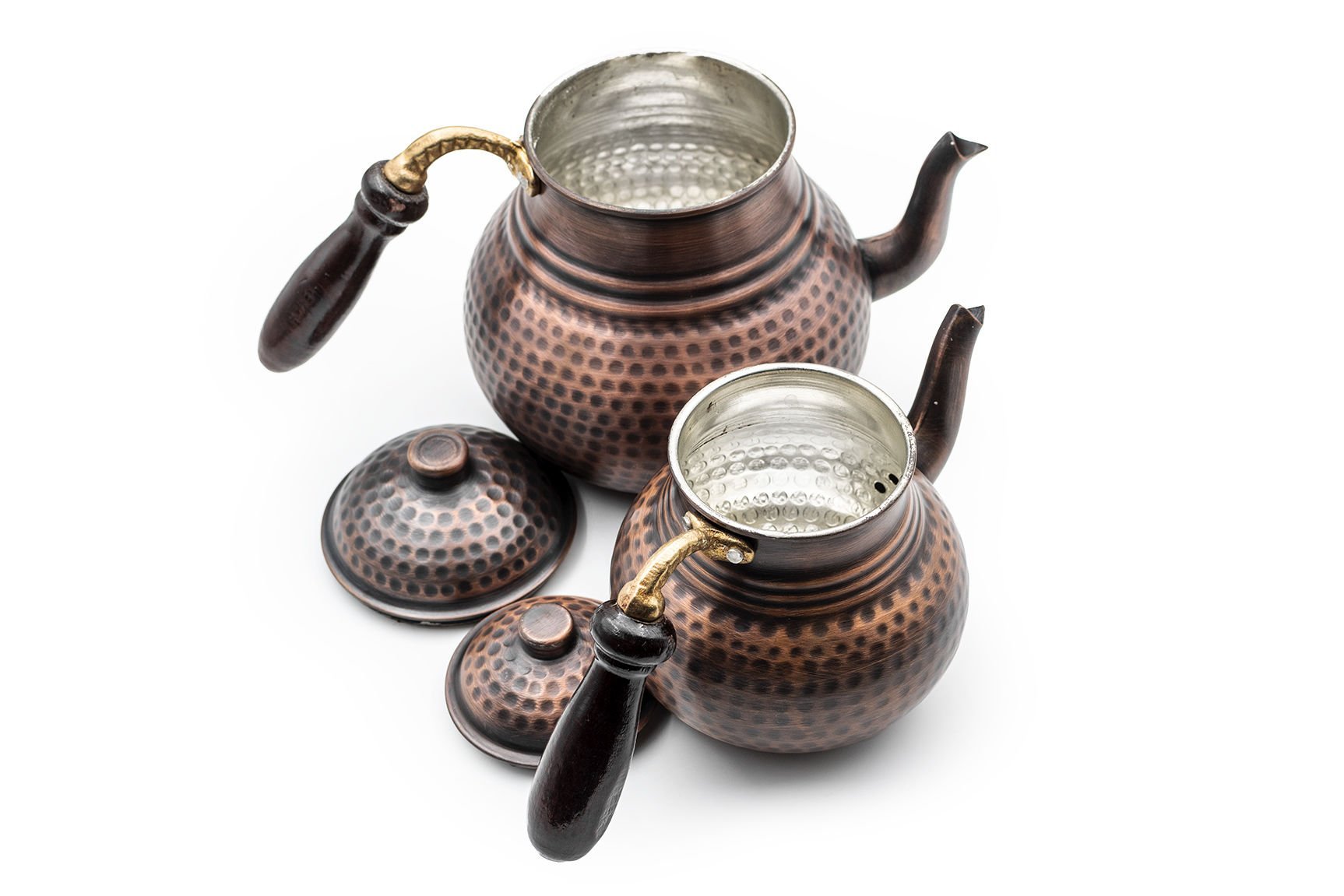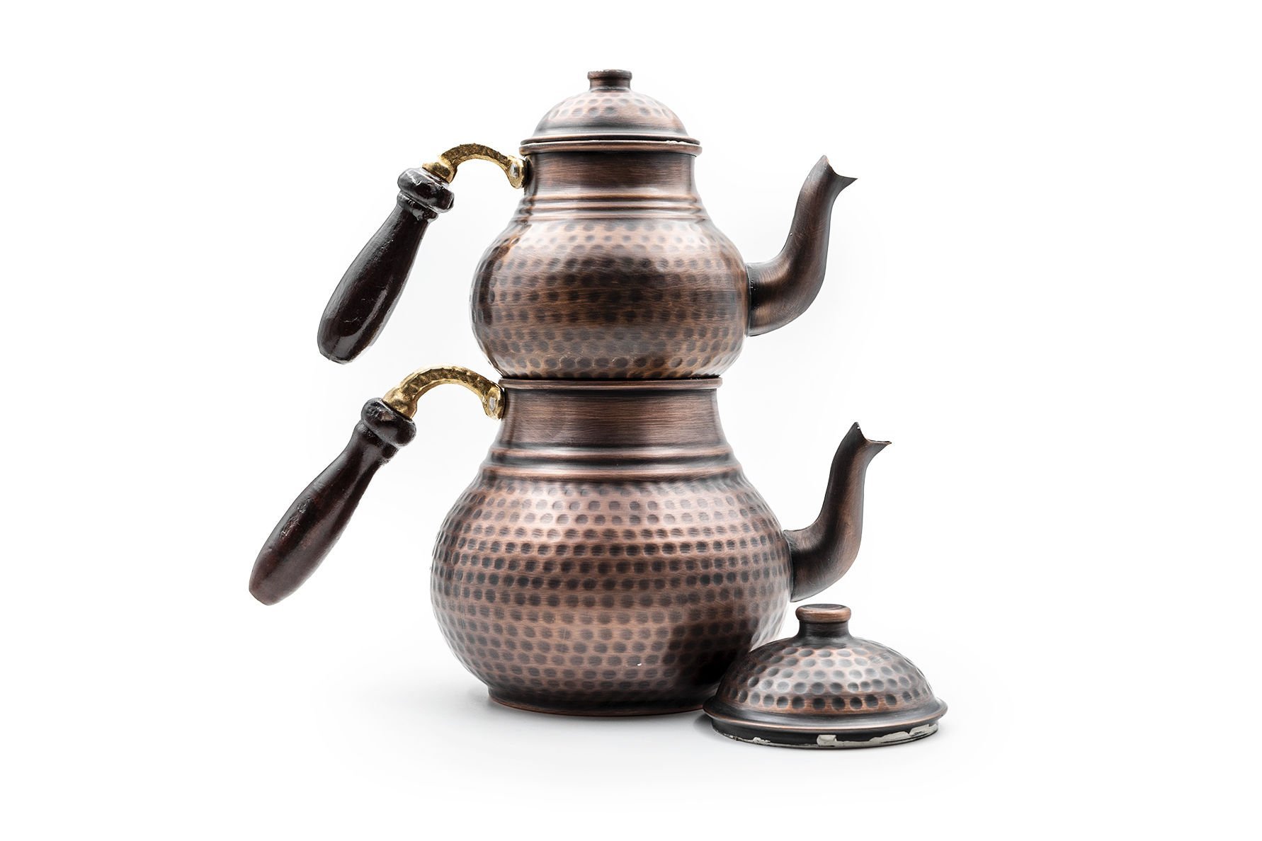 Handygoo Deep Hand Dövme Bakır Çaydanlık, dövme bakır sanatının tüm güzelliğini üzerinde taşımaktadır. 1,8 lt lik alt demlik ve 0,8 lt lik üst demlik hacmi ile son derece ideal boyutlardadır. Kalın bakırdan üretilmiştir ve ağırlığı 1 kg (+50)(-50) dır. 4-6 kişi için son derece kullanışlıdır. Ürünün içi tamamen kalaylanmış olup ürünün kulpları ise ahşap malzemedir.Hem dekoratif, hem ergonomik hem de şık görüntüsü ile kullanmaktan zevk alacağınız aynı zamanda sevdiklerinize de mutlaka hediye etmek isteyeceğiniz bir üründür. Sitemizde nikelajlı ve kırmızı bakır modeli olmak üzere 2 farklı seçeneği daha olan bakır çaydanlık ürününe ücretsiz kargo fırsatı ile sahip olabilirsiniz.