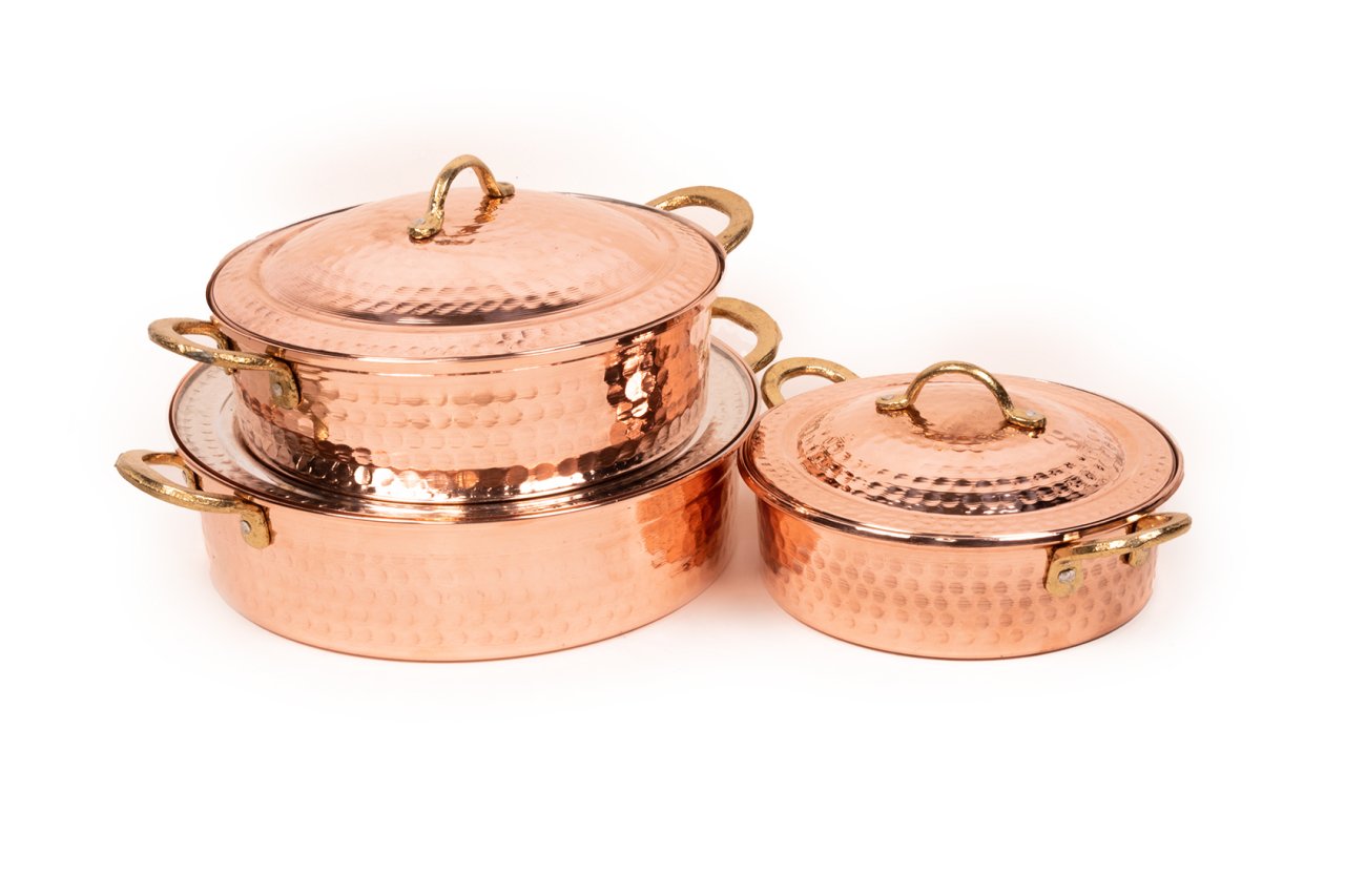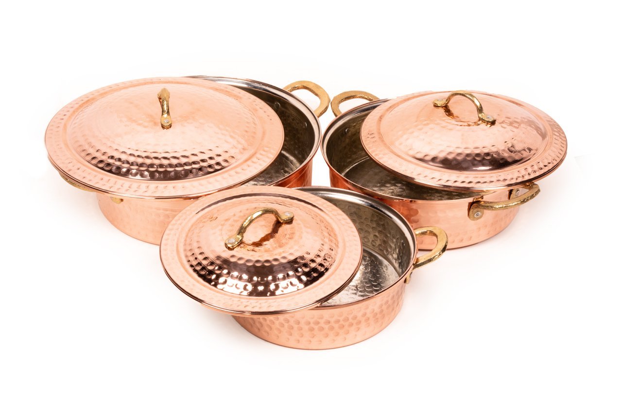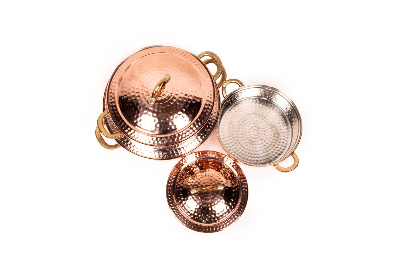 Handygoo Dövme Bakır Tencere Seti, birbirinden farklı 3 boy, modern ancak geleneksel tarzda ürettiğimiz dövme bakır tencere modellerimizi içermektedir. Set içerisindeki en ufak boy dövme bakır tenceremiz 21,5 cm çapında ve 6,5 cm derinliğindedir. Orta boy tenceremiz 25,5 cm çapında ve 8 cm derinliğinde iken, en büyük boy dövme bakır tencere modelimiz 29 cm çapında ve 8 cm derinliğindedir. Pilav, karnıyarık, çorba, güveç ve benzeri tüm yemekleriniz için birbirinden farklı boy seçeneği sunan dövme bakır tencere setimiz, mutfağınızdaki dekorasyonu bütünlerken, elinizin altında sürekli bulundurmak istediğiniz ürünümüz olacaktır. Günlük kullanıma son derece uygun olan bakır tencere modellerimizin iç yüzeyi güvenle kullanımınız için kalaylanmıştır. Tüm tencerelerimiz tamamen el yapımı olup, G.Antep'li bakır ustalarımız tarafından elde dövülerek üretilmiştir. Dolayısı ile ürünlerimiz tamamen size özeldir. Ürünlerimiz kalın bakırdan üretilmektedir. Dövme bakır tencere setimize, tüm kredi kartlarına peşin yada taksit imkanları ile güvenle sahip olabilirsiniz.