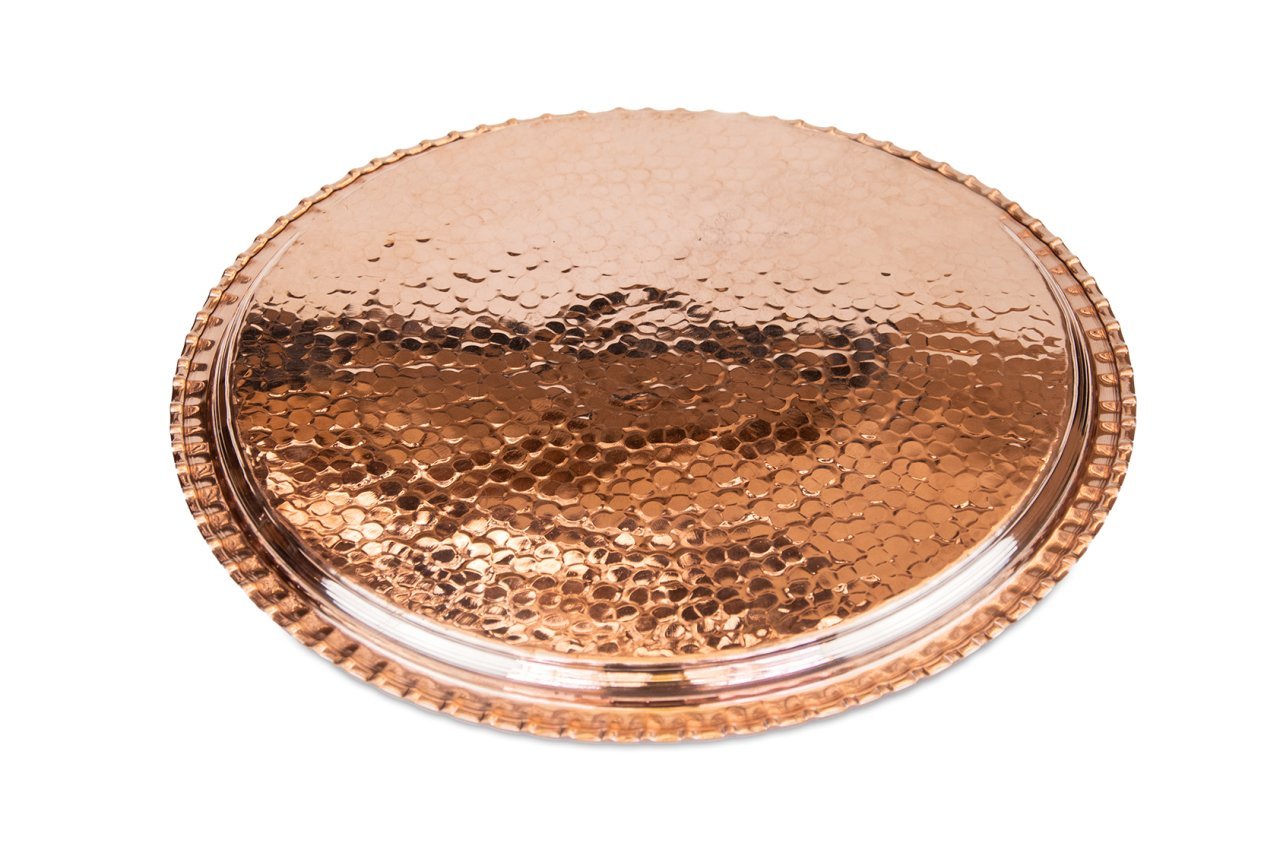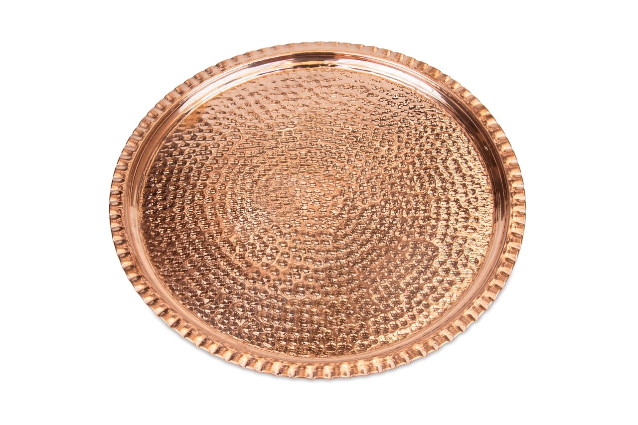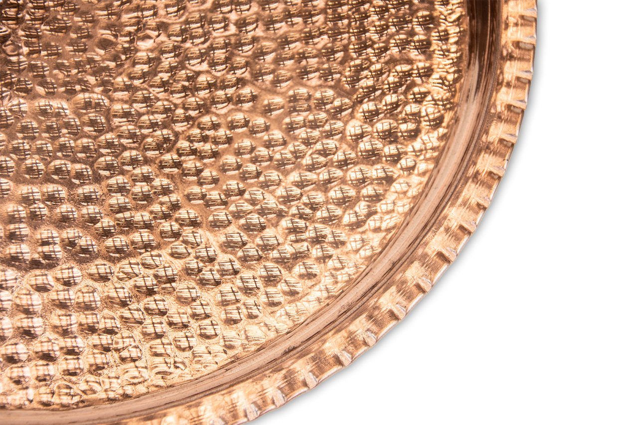 Handygoo Dövme Bakır Tepsi, bakır işleme sanatının zirvesinde yer alan ustalarımız tarafından iç kısmından dışarıya doğru tamamen çekiç darbeleri ile üretilmiştir. Çapı 35 cm olan el dövmesi bakır tepsi, günlük kullanıma uygundur. Sitemizde ayrıca aynı tepsinin 38 cm çap ölçüsüne sahip alternatifi de yer almaktadır. Kendi imalatımız olan üründe kalın bakır kullanılmış olup, her türlü çay, kahve vb. servisleriniz için uygundur. Günlük kullanım haricinde dekoratif olarak da kullanabileceğiniz ürün, görenleri kendine hayran bırakacak bir tarzda üretilmiştir. Sitemizde farklı ebat ve işleme modellerinde farklı tepsiler bulabilir ve ücretsiz kargo fırsatı ile sahip olabilirsiniz.