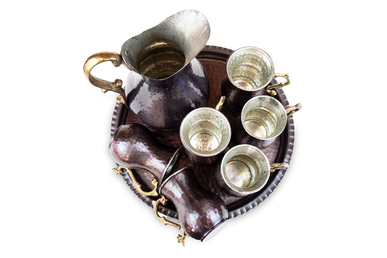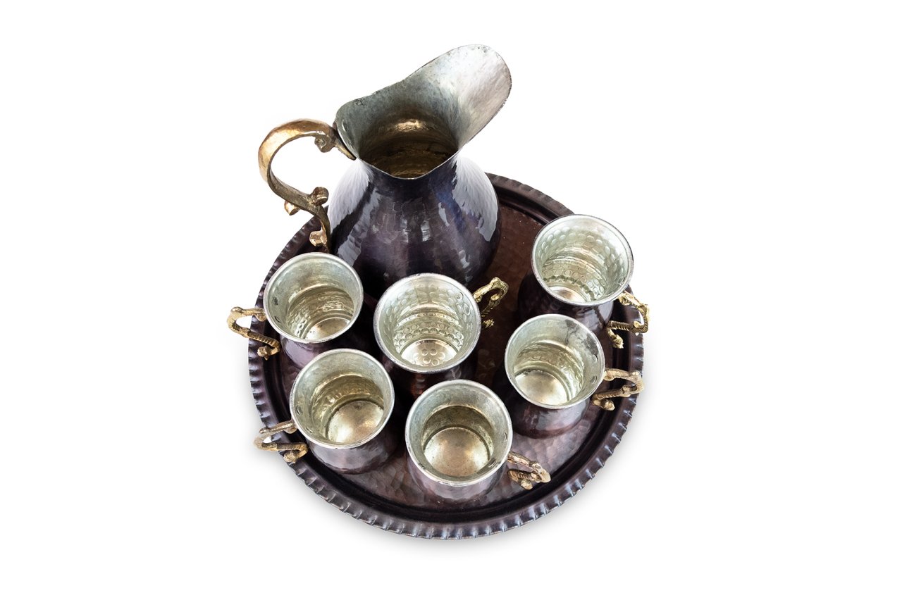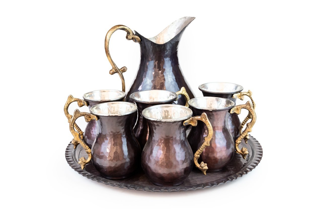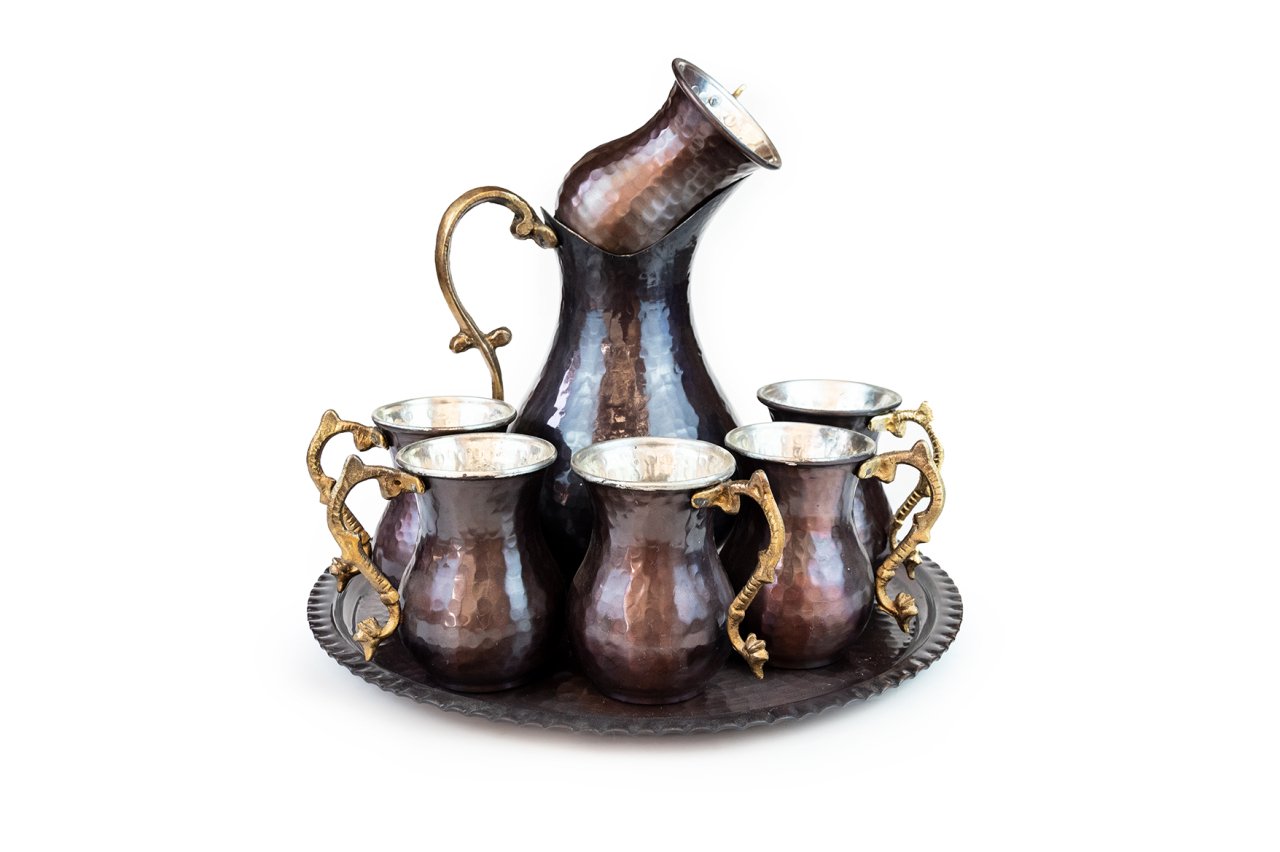Handygoo El Dövmesi Bakır Ayran Seti, tamamen el yapımı olup dövme bakırdan üretilmiştir. Set, bakır tepsi, bakır sürahi ve 6 adet bakır ayran kupa parçaları ile set olarak satılmaktadır. Bakır Ayran Seti nin tüm parçaları kalaylıdır. Tepsi çapı 34,5 cm ve kalınlığı 1,2 cm dir. Sürahi boyu 23 cm, ağız boyu 12 cm ve eni 7,5 cm dir. Bakır kupaların ağız çapı 7,5 cm, boyu 11 cm ve kulptan çapları 10,5 cm dir. Hem dekoratif, hem kullanışlı olan ürün, sofralarınız ve dekorasyonunuz için vazgeçilmez bir parça olacaktır. Kendi imalatımız olup, tüm parçalar kalın bakırdan üretilmiştir.