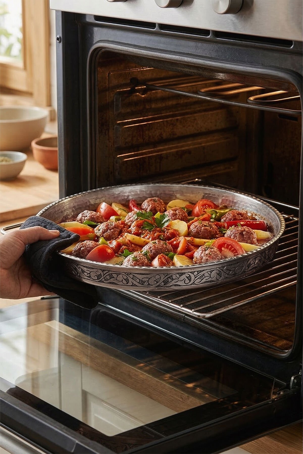 Handygoo El İşlemesi Bakır Fırın Tepsisi, alıştığınız tepsi modellerinden çok çok farklı. Kalın bakırdan üretilmiş olan bakır fırın tepsisi, üzerindeki tamamen el işlemesi motifleri ile göz dolduruyor. Sitemizde 25-35 ve 45 cm çaptaki çeşitlerine ulaşabileceğiniz tepsi derinliği 3,5 cm dir. İç kısmı elde çekiç ile dövülerek şekillendirilmiştir. Her türlü fırın ve ocakta kullanabileceğiniz ürünün içi kalaylıdır. Günlük kullanıma son derece uygun olup, sitemizdek diğer tüm bakır ürün modelleri ile uyumlu olup kombin edilebilmektedir.