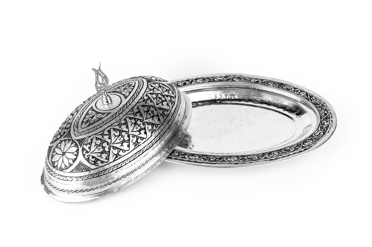 Handygoo El İşlemesi Bakır İskender Tabağı, çok gösterişli ve çok kullanışlı. Ağırlıklı olarak iskender kebabı servislerinde kullanılmak üzere tasarlanmış olsa da ev ve iş yerlerinizde her türlü sunum ve servislerinizde rahatlıkla kullanabilirsiniz. Ürün kendi imalatımız olup, kalın bakırdan üretilmiştir. El işlemesi bakır iskender tabağı ürünümüz, tamamen el yapımı olup, üzerindeki işlemelerde tamamen bakır işleme ustaları tarafından elde işlenmektedir. Bakır İskender tabağının iç tarafı da tamamen kalaylanmıştır. Sitemizde, 25-30-35 ve 40 cm lik boyutlarını bulabileceğiniz bakır iskender tabağı, geleneksel görüntüsü ile de görenleri kendisine hayran bırakmaktadır.