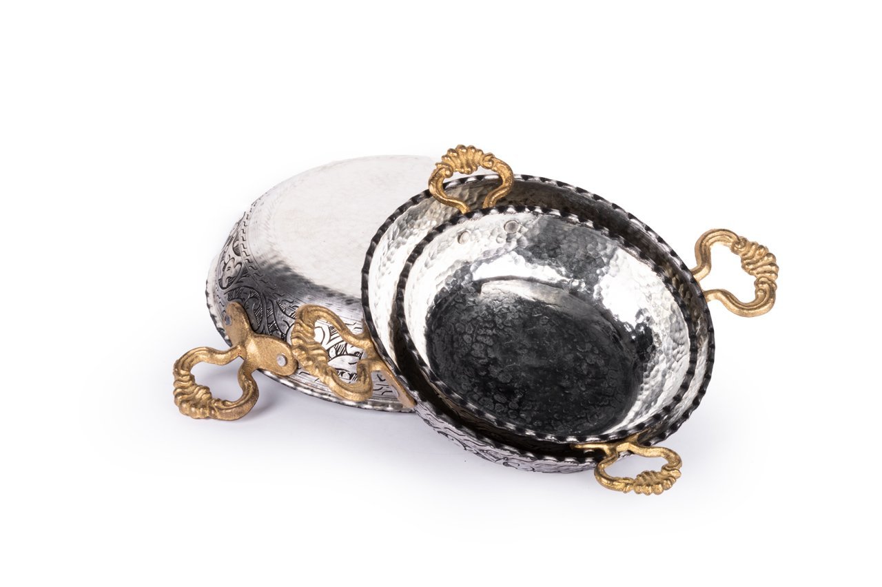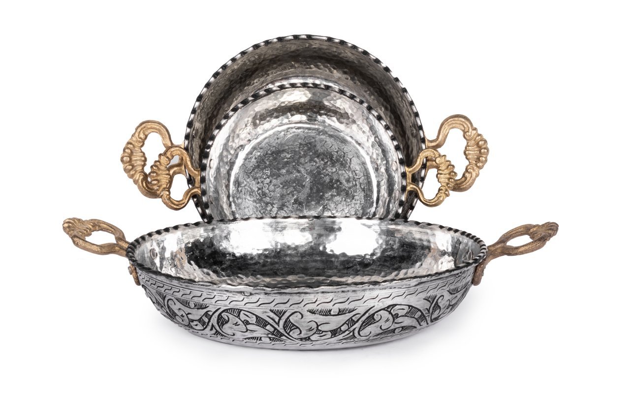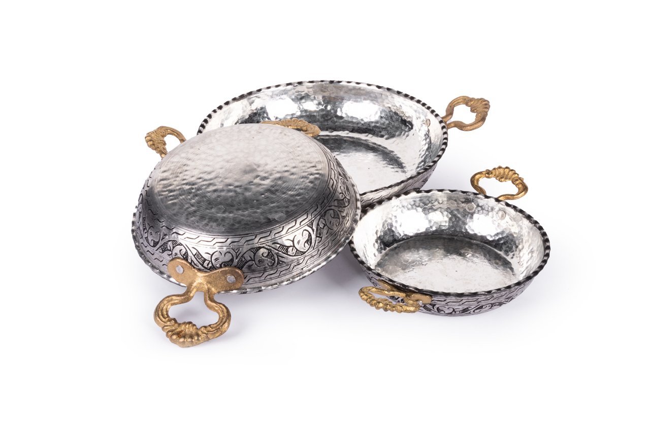 Handygoo El İşlemesi Bakır Sahan Seti, Gaziantep bakır el işlemesi örneklerini üzerinde taşımaktadır. %100 bakır kullanılarak tarafımızca üretilmiştir. İçleri kalaylıdır ve günlük kullanıma uygundur. Kalın olduğu için yapışma yapmamaktadır. Bakır sahan seti modellerimizin kulpları pirinç döküm malzemeden yapılmıştır. Set içerisinde üç farklı boy seçeneği mevcuttur.