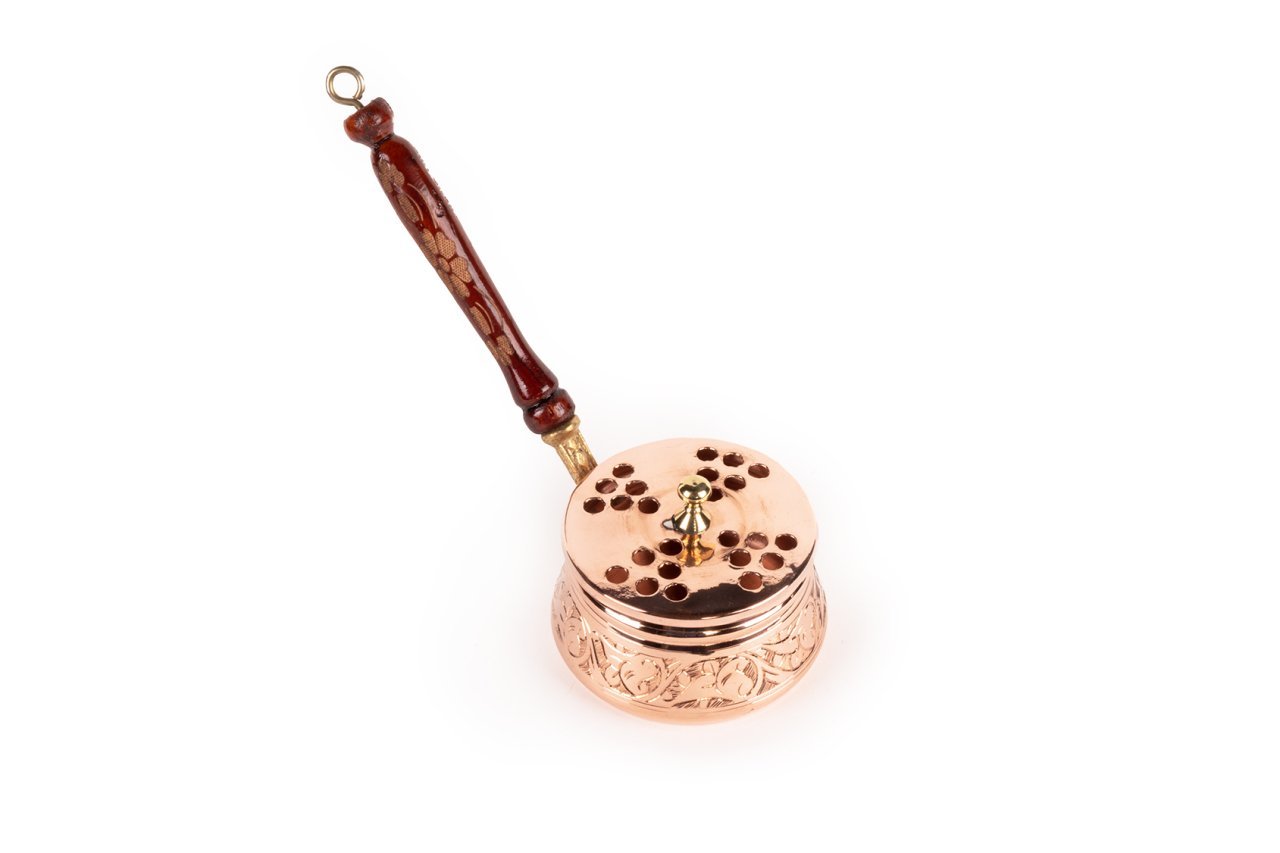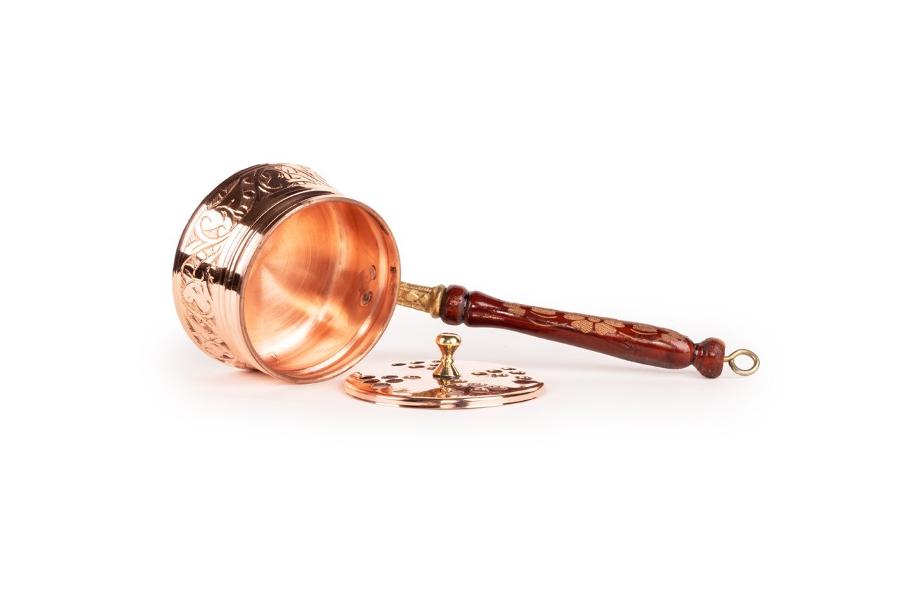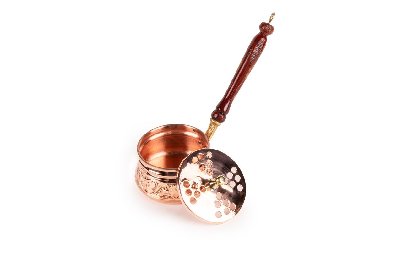 Handygoo El İşlemesi Bakır Tütsülük, reçine ve demet tütsülerinizi rahat bir şekilde kullanmanız ve kokularının ortama en güzel şekilde yayılmasını sağlamak için tasarlandı. Ayrıca zarif ve dekoratif görünümü ile görenleri kendisine hayran bırakmaktadır. Reçine ve demet tütsüler diğer tütsü türlerine göre daha uzun zamanda yanarlar. Ancak bir o kadar da keyifli, farklı duygular barındıran kokulara sahiptirler. Bakır tütsülük modelimizi kullanmanız bu tip tütsülerinizin kokularının her bir tınısını hissetmenizi sağlayacaktır. Buhur, sığla reçinesi, bereket tütsüsü, yedi dükkan süprüntüsü gibi demet ve reçine tütsülerinizi kolay bir şekilde yakabilir, istediğiniz her ortamda kullanabilirsiniz. Üzerindeki işlemeler G.Antep bakır işleme ustalarımız tarafından tamamen elde yapılan bakır tütsülük modelimiz ile çok farklı his ve deneyimler yaşayacak, tütsüleriniz ile negatif enerjiden kurtulacak ve kendinizi dingin ve huzurlu hissedeceksiniz.