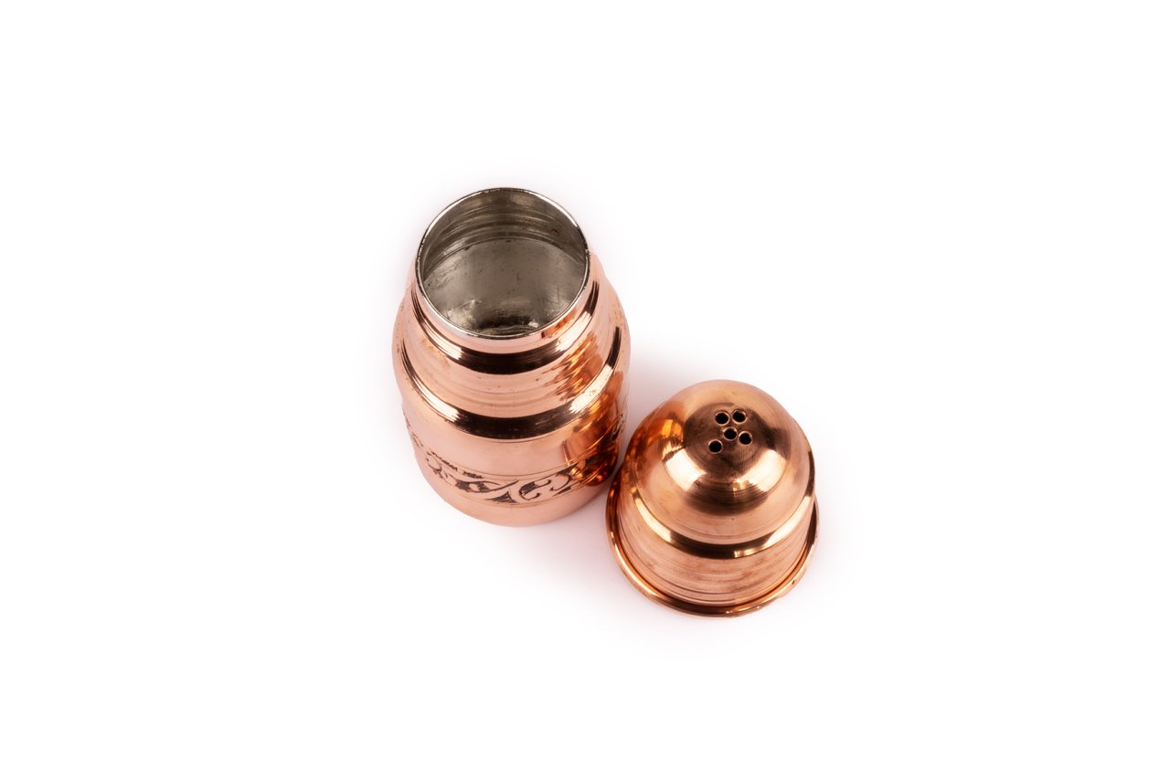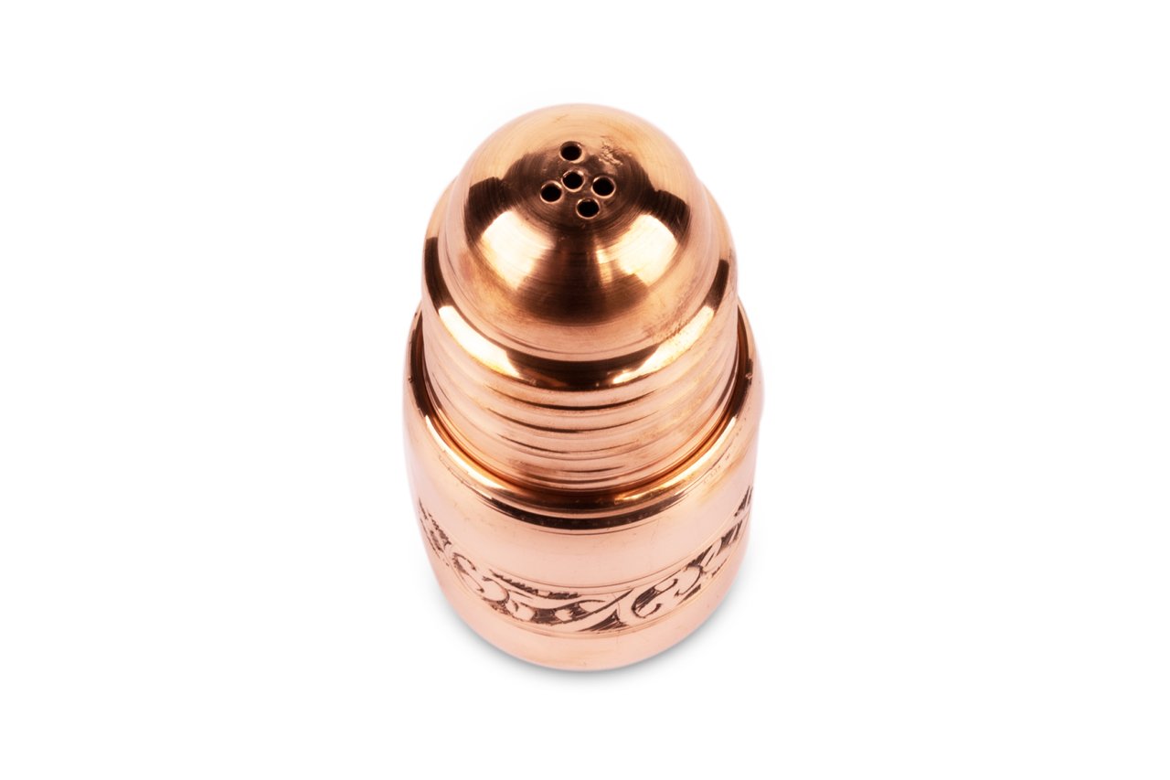 Handygoo El İşlemesi Bakır Tuzluk, sofralarınıza farklı bir dokunuş için tasarlandı. Bakır tuzluk modelimiz, tamamen bakırdan üretilmiş olup iç kısmı güvenle kullanımınız için kalay kaplıdır. Üzerindeki işlemeler el işlemesi olup, ürünümüzün yüksekliği 12,5 cm ve taban çapı 6 cm dir. Hem tuzluk olarak hem de karabiber, kırmızı biber vb. baharatlarınız için de kullanabilirsiniz. Günlük kullanıma son derece uygun olup dekoratif görüntüsü ile de sadece bir tuzluk değildir. Orjinal bakır rengi ve geleneksel şekli ile severek kullanacağınızdan emin olabilirsiniz.