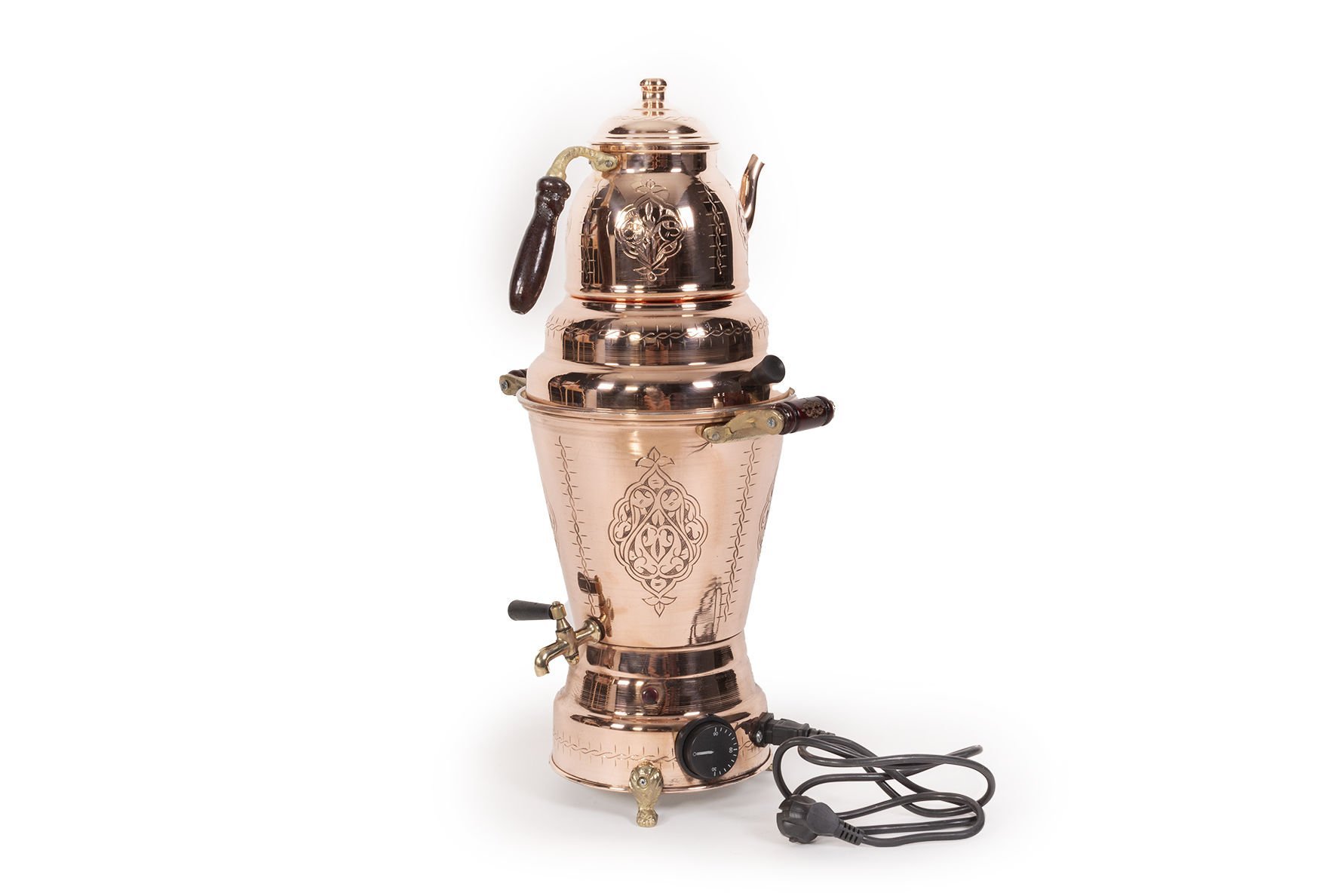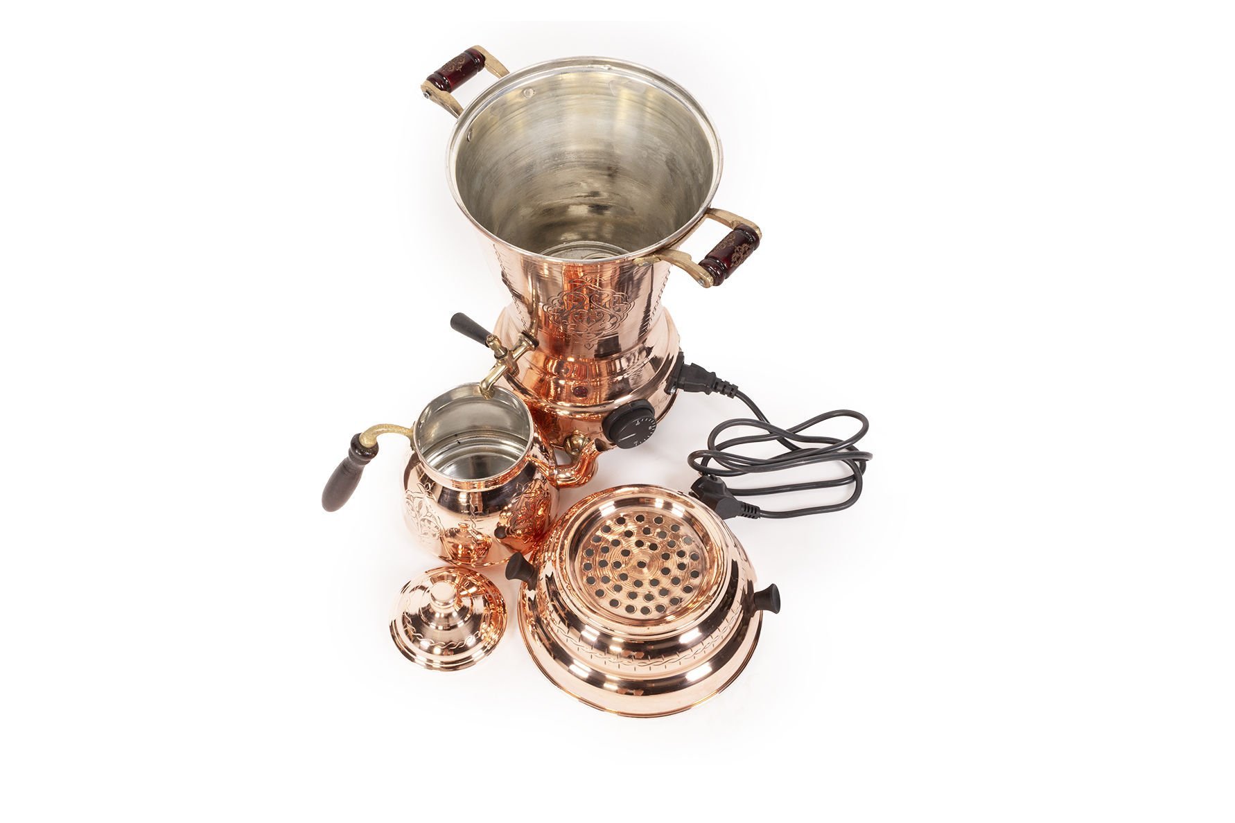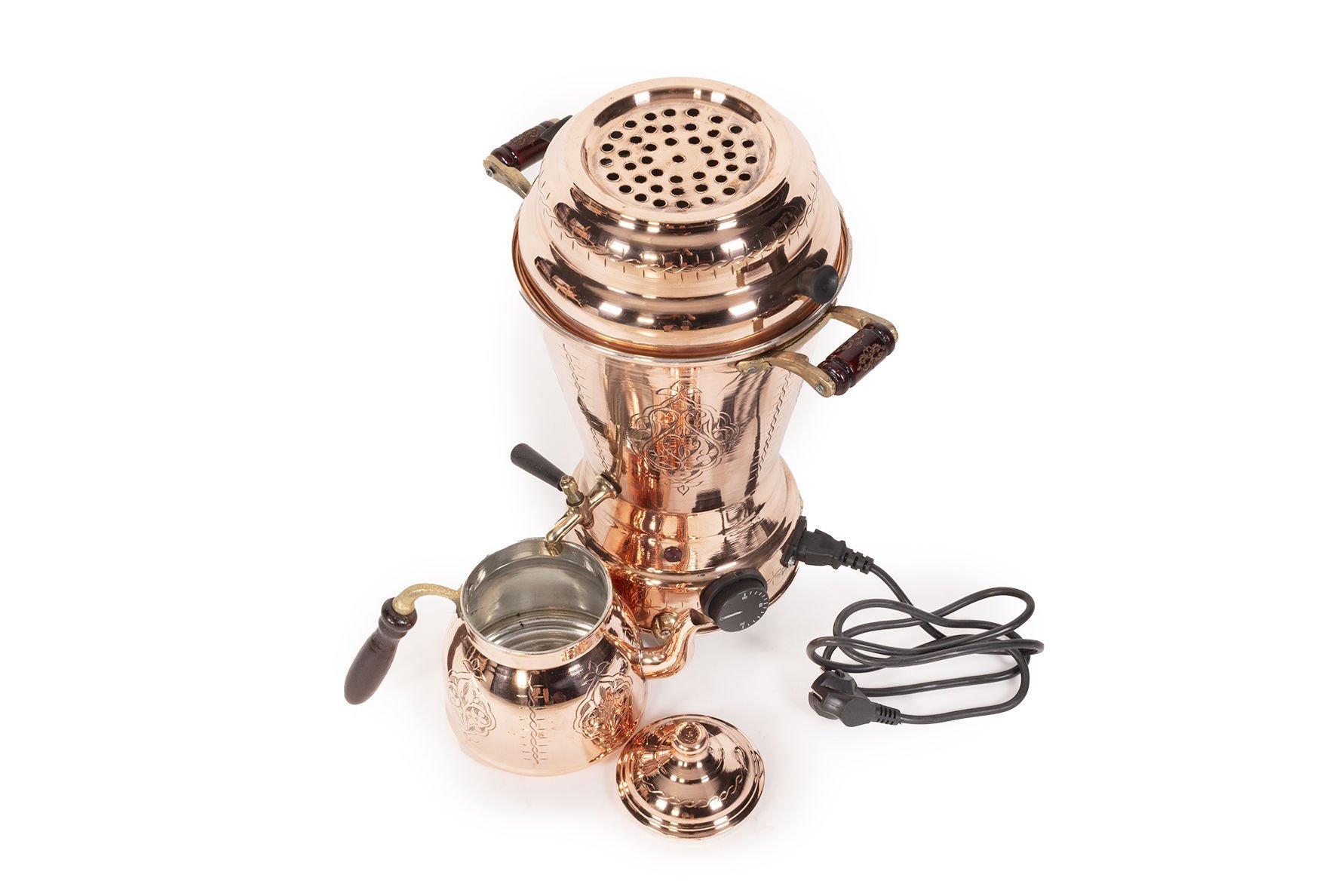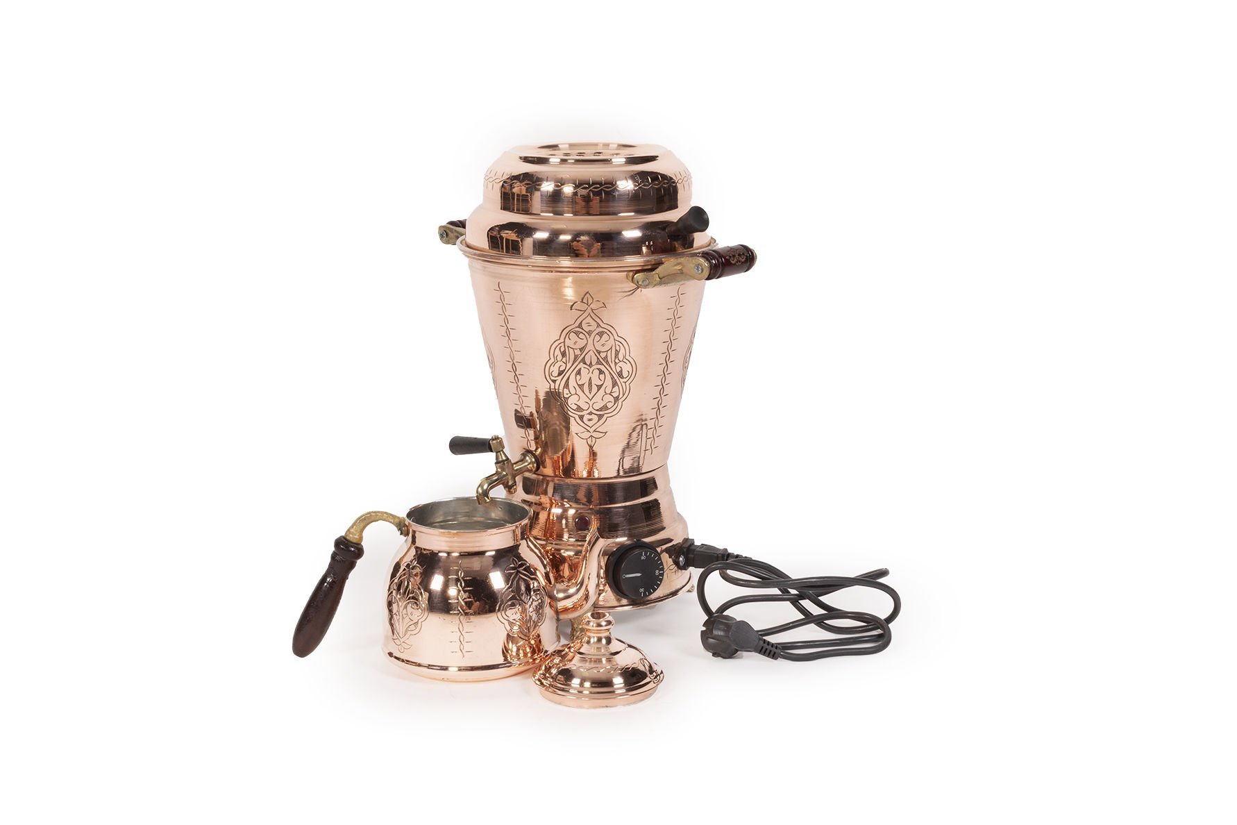 Handygoo El İşlemesi Kırmızı Elektrikli Bakır Semaver, özenle tasarladığımız yepyeni bakır semaver ürünümüzdür. % 100 bakır ve kendi imalatımızdır. İç yüzeyler kalaylıdır. Elektrikli olmasından dolayı ev ve iş yerlerinde kullanımı son derece kolaydır. Bakır semaver modelimizin büyük boy olan seçeneğinin demlik hacmi 1,5 LT ve su haznesi hacmi 3,5 LT dir. Toplam yükseklik 58 cm, çap ise 22,5 cm dir. İçerisindeki rezisdans tertibatı sayesinde 3,5 LT su 20 dakika içinde kaynamaktadır. Bakır semaver modelimizin küçük boy olan seçeneğinin demlik hacmi 0,8 LT ve su haznesi hacmi 2,5 LT dir. Toplam yükseklik 47 cm, çap ise20 cm dir. İçerisindeki rezisdans tertibatı sayesinde 2,5 LT su 15 dakika içinde kaynamaktadır.Bakır semaver modelimiz ayrıca son derece dekoratiftir. Kalın bakırdan üretilmiştir.