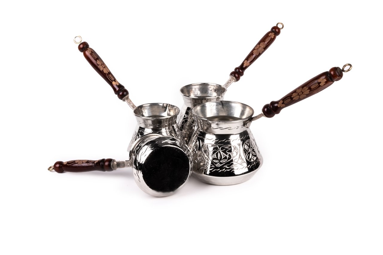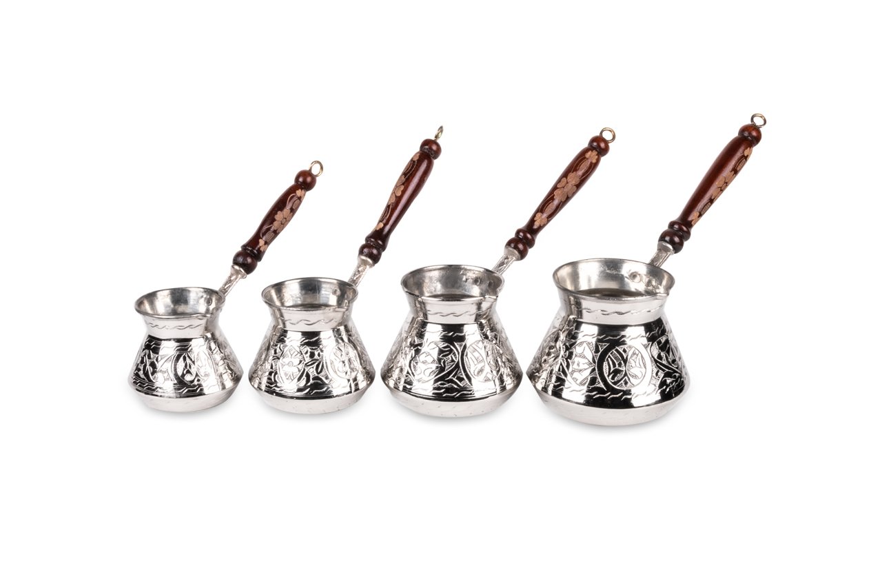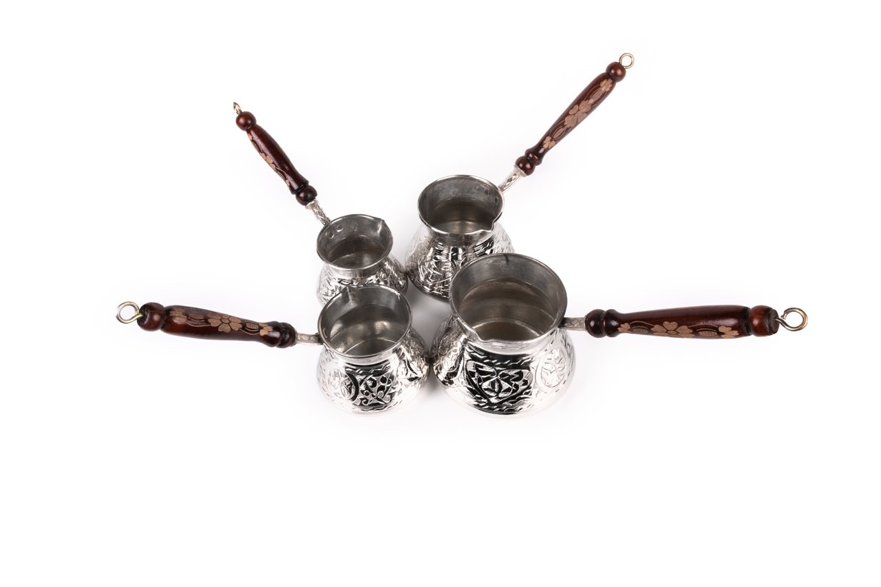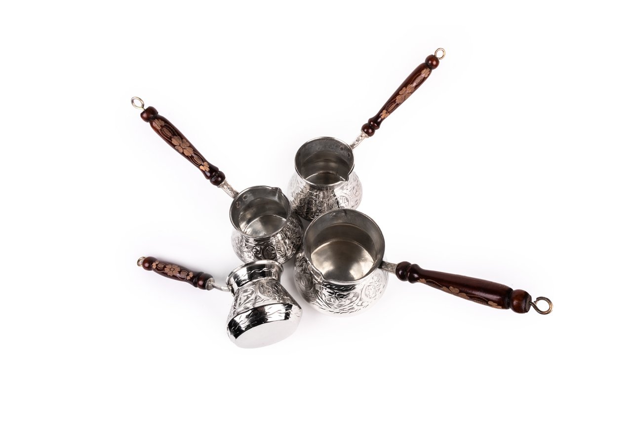 Handygoo El İşlemesi Nikelajlı Bakır Cezve Seti , kahve pişirmenin en klasik yöntemini muhteşem bir güzellik ile mutfağınıza getiriyor. Ürün, 2-4-6 ve 12 kişilik cezvelerden oluşmaktadır. 2 kişilk cezve 7 cm, 4 kişilik cezve 8 cm, 6 kişilik cezve 9 cm ve 12 kişilik cezve 10 cm çapa sahiptir. Ürün yükseklikleri sırası ile 8-9-10 ve 11 cm dir. Sap uzunlukları ise sırası ile 13-13-15 ce 17 cm dir. Ürün, mutfağınızda vazgeçmek istemeyeceğiniz parçalardan biri olurken, kahvelerinizin lezzetinin arttığını göreceksiniz.