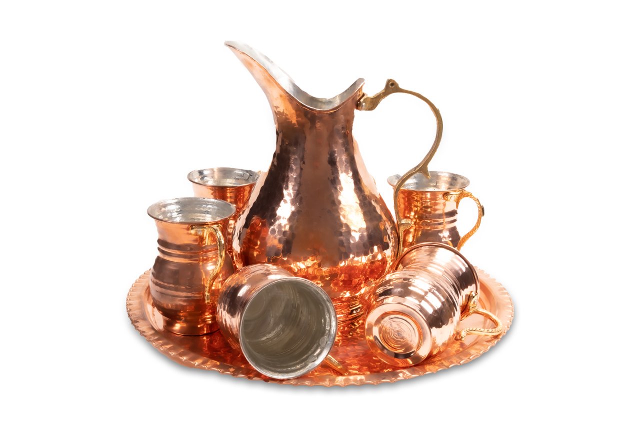 Handygoo El Yapımı Dövme Bakır Ayran Seti 6 Kişilik, tamamen el yapımı olup dövme bakırdan üretilmiştir. Set, bakır tepsi, bakır sürahi ve 6 adet bakır ayran kupa parçaları ile set olarak satılmaktadır. Bakır Ayran Seti nin tüm parçaları kalaylıdır. Tepsi çapı 34,5 cm ve kalınlığı 1,2 cm dir. Sürahi boyu 23 cm, ağız boyu 12 cm ve eni 7,5 cm dir. Bakır kupaların ağız çapı 7,5 cm, boyu 11 cm ve kulptan çapları 10,5 cm dir. Hem dekoratif, hem kullanışlı olan ürün, sofralarınız ve dekorasyonunuz için vazgeçilmez bir parça olacaktır.
