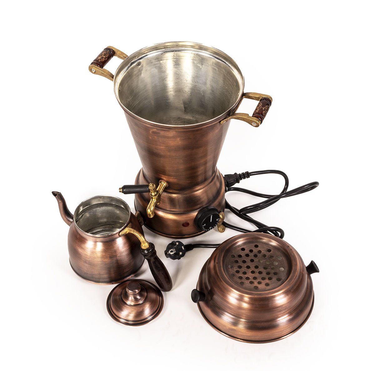 Handygoo Elektrikli Bakır Semaver, özenle tasarladığımız yepyeni bakır semaver ürünümüzdür. % 100 bakır ve kendi imalatımızdır. İç yüzeyler kalaylıdır. Elektrikli olmasından dolayı ev ve iş yerlerinde kullanımı son derece kolaydır. Bakır semaver modelimizin büyük boy olan seçeneğinin demlik hacmi 1,5 LT ve su haznesi hacmi 3,5 LT dir. Toplam yükseklik 58 cm, çap ise 22,5 cm dir. İçerisindeki rezisdans tertibatı sayesinde 3,5 LT su 20 dakika içinde kaynamaktadır. Bakır semaver modelimizin küçük boy olan seçeneğinin demlik hacmi 0,8 LT ve su haznesi hacmi 2,5 LT dir. Toplam yükseklik 47 cm, çap ise20 cm dir. İçerisindeki rezisdans tertibatı sayesinde 2,5 LT su 15 dakika içinde kaynamaktadır.Bakır semaver modelimiz ayrıca son derece dekoratiftir. Kalın bakırdan üretilmiştir.