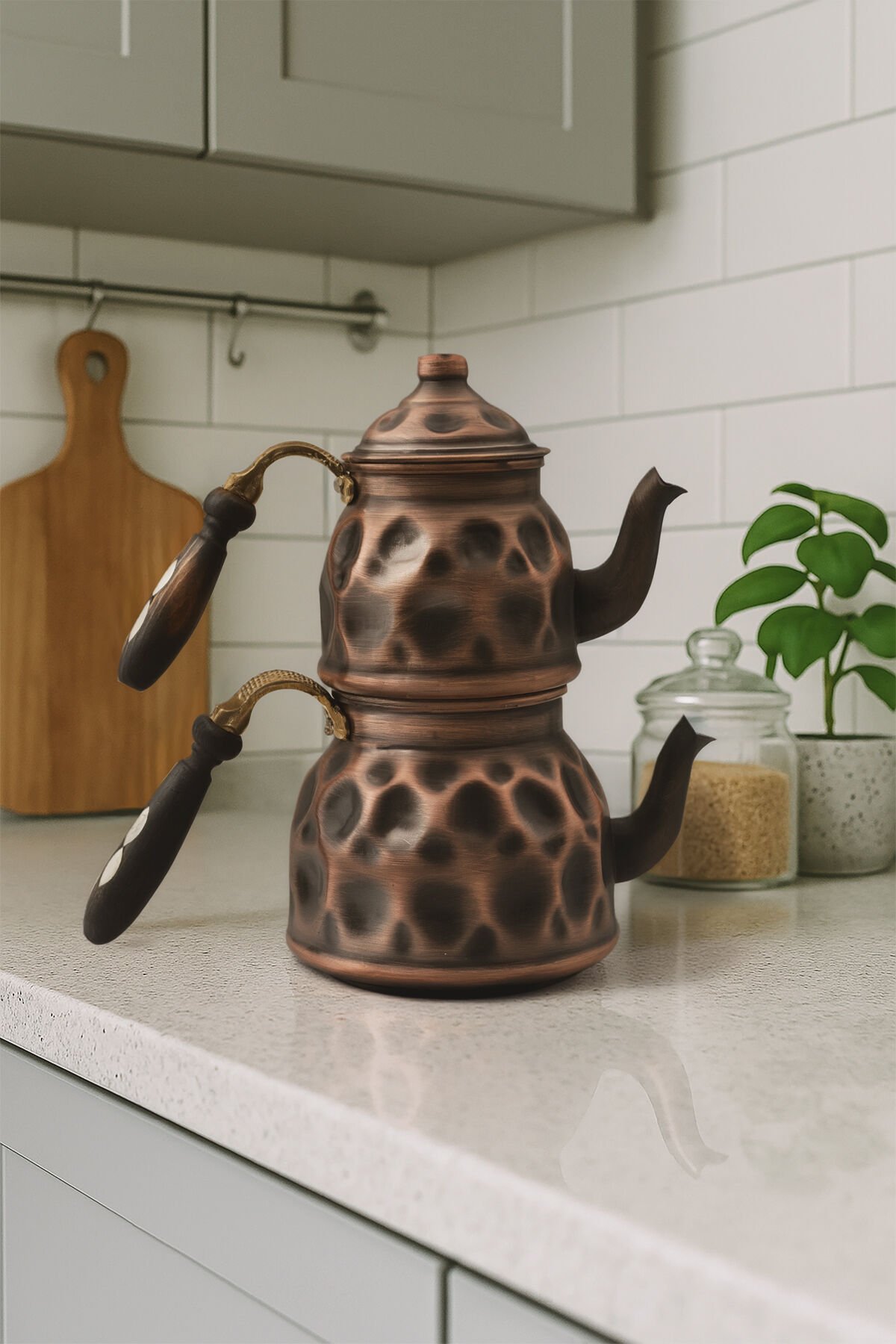 Handygoo Eterna Bakır Çaydanlık, geleneksel Türk işçiliğini modern mutfak estetiğiyle yeniden yorumluyor.