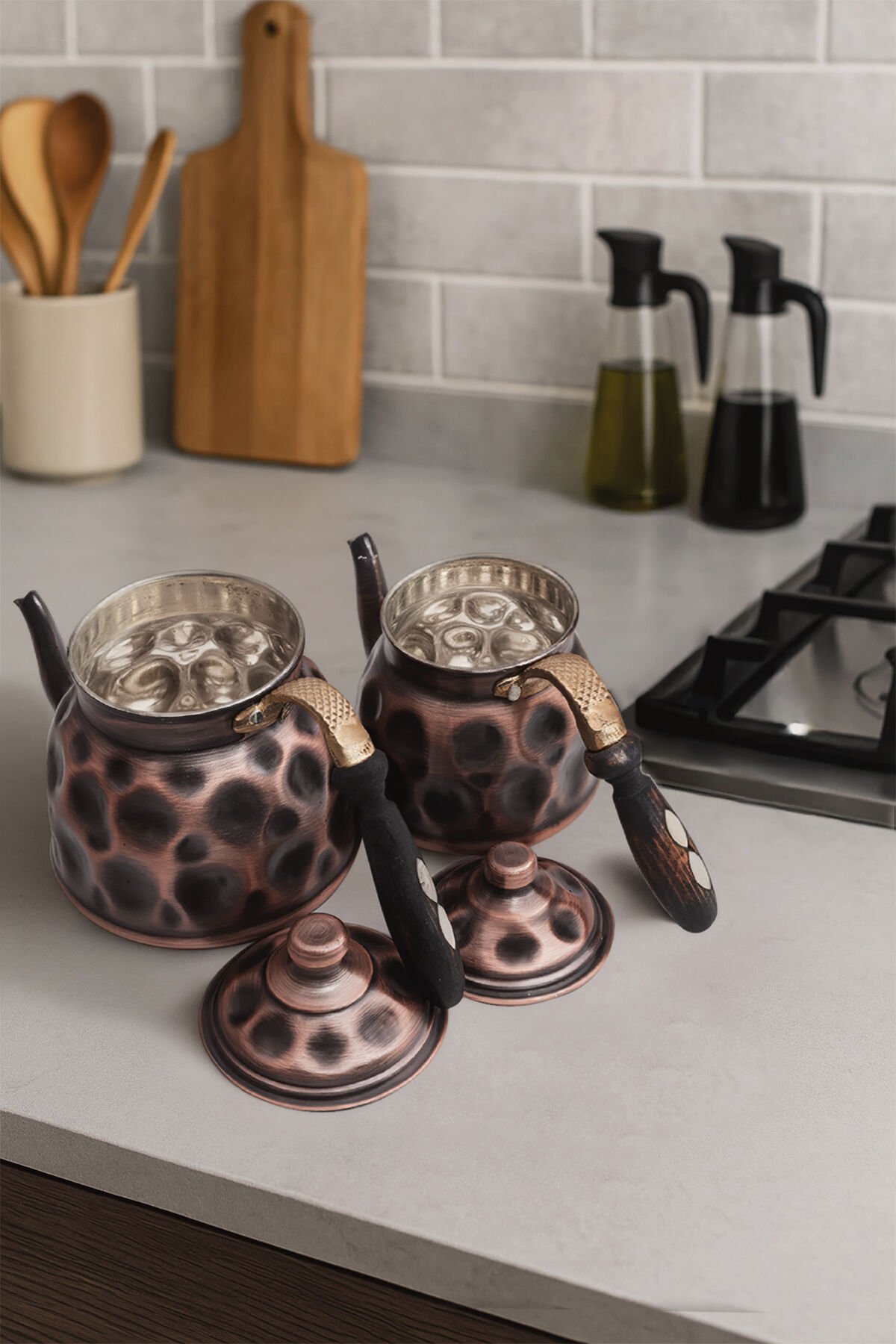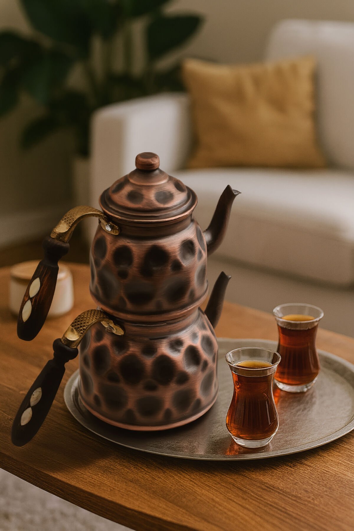 Tamamı %100 bakırdan el işçiliğiyle üretilmiş bu özel set, her bir çekiç darbesinde ustalığın izini taşır.