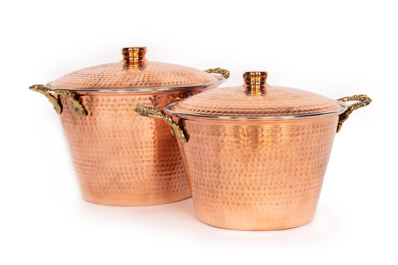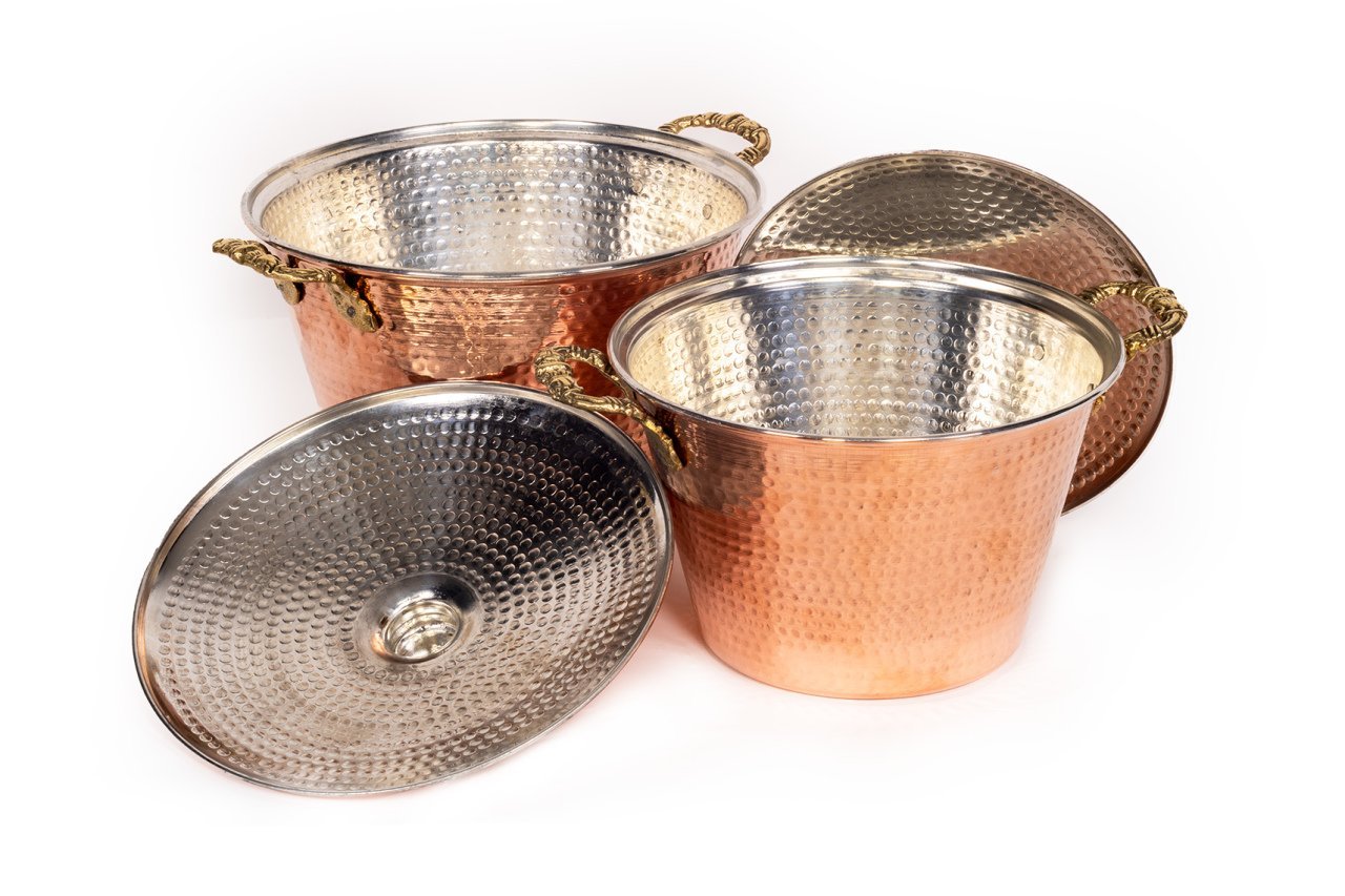 Handygoo Gaia Dövme Bakır Perde Pilavı Tenceresi Seti, ülkemizin yöresel ve eşsiz lezzetlerinden biri olan perde pilavını, sofralarınıza layık bir şekilde pişirmeniz için tasarladığımız 2 adet modelimizden oluşmaktadır. %100 dövme bakırdan ürettiğimiz dövme bakır perde pilavı tenceresi seti modelimiz kalın bakırdan üretilmiş olup setin büyük tenceresi 2,4 kg ağırlığındadır. 30 cm ağız çapı ve 20 cm derinliğindedir. Setin ufak tenceresi ise 2 kg ağırlığında olup, 27 cm ağız çapı ve 17 cm derinliğe sahiptir. Tamamı ile el yapımı ve el dövmesi olan ürünümüzü ocak ve fırınlarınızda (indüksiyonlu ocak hariç) rahatlıkla kullanabilirsiniz. Kalın olmasından dolayı uzun zaman boyunca fırın içinde kalmaya dayanıklıdır. Sadece perde pilavı değil aynı zamanda tüm sulu yemek ve diğer pişirimlerinizde de rahatlıkla kullanabilirsiniz. Sahip olduğu dövme bakırın göz alıcı görüntüsü ile de son derece dekoratiftir. Tüm diğer bakır ürünlerimiz ile son derece uyumludur.