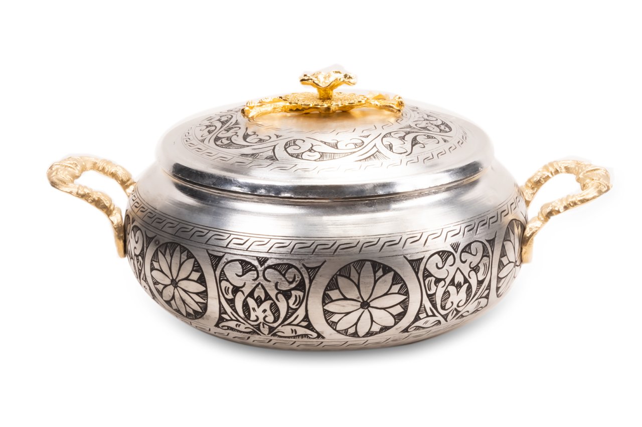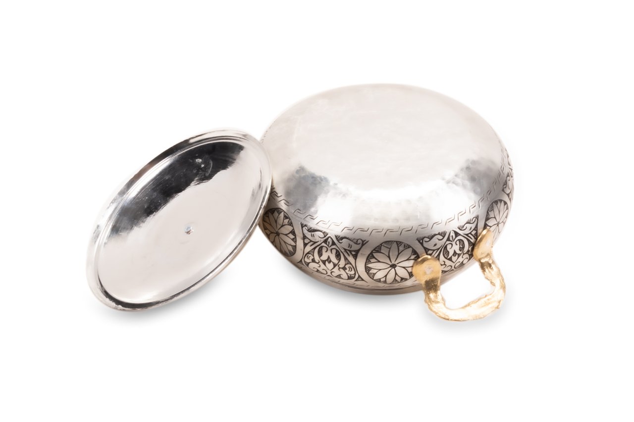 Çift kulplu Handygoo Gray Sultan Bakır Tencere, üzerindeki el işlemesinin büyüsünden, akıcılığından ve detayların hareketliliğinden hoşlananlar için tasarlandı. Sıcak yada soğuk tüm çorba, yemek ve benzeri servisleriniz için kullanım rahatlığı sunarken anı zamanda eviniz için son derece dekoratif bir görünüme sahiptir. Ustaların ruhundan ellerine süzülen duyguları ile dövülerek şekil aldığı bakır tencere ürünü, en altından başlayarak el işi keski işlemesi ile çok sık, ince ve şık nakışlar ile süslenmiş, bu nakışlar, tencerenin tamamlayıcı parçası olan kapak üzerinde de detaylandırılarak, ürün üzerinde bütünlük sağlanmıştır. Tarihin şafağından bu yana, bu bakır çorbalık ve tencereler mutfakların başlıca metali olmuştur. Paslanmaz çelik, döküm, granit ve diğer tencere tipleri ile karşılaştırıldığında süper iletken olması ve yüzeyinde virüs, mikrop yaşatmaması itibariyle her zaman üstün gelmiştir. Çorbalıklar da tarifleriniz, mükemmel bir dengede lezzet bulur. Dünyadaki en ünlü şeflerin tercihi her zaman bakır tencere ve tavalar olmuştur. Yumuşak bir metal olduğu için çizilmeye müsaittir. Tencerelerin bilhassa çekiçle vurularak üretilmesinin nedeni, çizilmeye karşı gösterdiği dirençtir. Çorbalıkların iç kaplamasında kalay kullanılır. Kalay, bakırın ısı iletkenliğini korur. Girdiği her alanda çarpıcı bir etki yaratan bakırın sıcaklığı ile evinizin dekorunu ısıtabilirsiniz. Gurme tercihler ve kaliteye adanmışlığın bir sembolü olan bu tencereler, mutfağınızda kendini lezzete adamış bir şefin yaşadığına işaret edecektir. Yerel özgünlüğe verilen değerin de elçisi olan mutfaktaki bakırlarınız, ev dekorunuzun her türlü katmanıyla kolayca bütünleşip, bir zenginlik yaratacaktır. Ürünün sitemizde 4 farklı boyu yer almaktadır. Bunlar, çap 19 cm, derinlik 8 cm, çap 24 cm, derinlik 9 cm, çap 27 cm, derinlik 10 cm ve çap 31 cm, derinlik 11 cm olacak şekildedir. Kulplar pirinç kaplamadır.