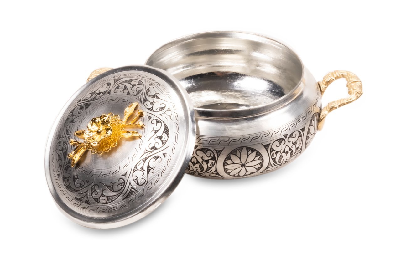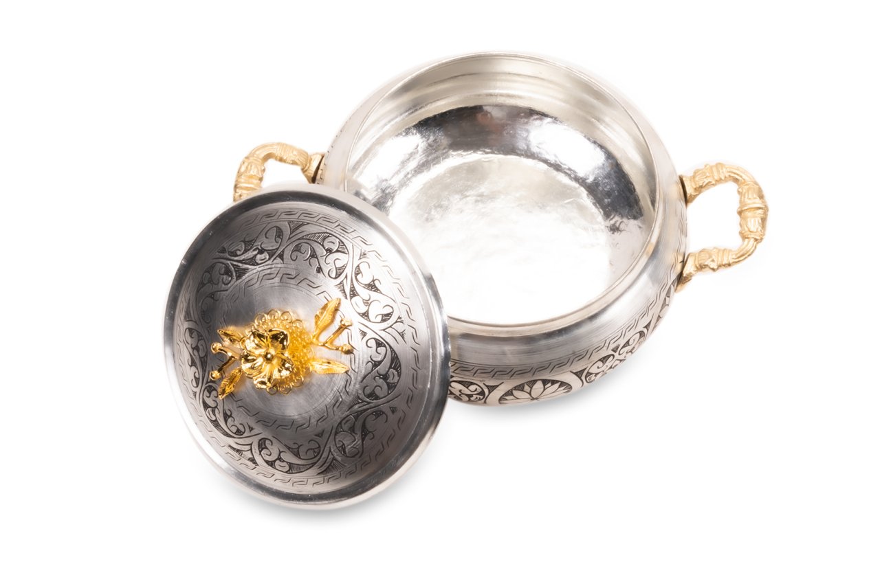 Çift kulplu Handygoo Gray Sultan Bakır Tencere, üzerindeki el işlemesinin büyüsünden, akıcılığından ve detayların hareketliliğinden hoşlananlar için tasarlandı. Sıcak yada soğuk tüm çorba, yemek ve benzeri servisleriniz için kullanım rahatlığı sunarken anı zamanda eviniz için son derece dekoratif bir görünüme sahiptir. Ustaların ruhundan ellerine süzülen duyguları ile dövülerek şekil aldığı  bakır tencere ürünü, en altından başlayarak el işi keski işlemesi ile çok sık, ince ve şık nakışlar ile süslenmiş, bu nakışlar, tencerenin tamamlayıcı parçası olan kapak üzerinde de detaylandırılarak, ürün üzerinde bütünlük sağlanmıştır. Tarihin şafağından bu yana, bu bakır çorbalık ve tencereler mutfakların başlıca metali olmuştur. Paslanmaz çelik, döküm, granit ve diğer tencere tipleri ile karşılaştırıldığında süper iletken olması ve yüzeyinde virüs, mikrop yaşatmaması itibariyle her zaman üstün gelmiştir. Çorbalıklar da tarifleriniz, mükemmel bir dengede lezzet bulur. Dünyadaki en ünlü şeflerin tercihi her zaman bakır tencere ve tavalar olmuştur. Yumuşak bir metal olduğu için çizilmeye müsaittir. Tencerelerin bilhassa çekiçle vurularak üretilmesinin nedeni, çizilmeye karşı gösterdiği dirençtir. Çorbalıkların iç kaplamasında kalay kullanılır. Kalay, bakırın ısı iletkenliğini korur. Girdiği her alanda çarpıcı bir etki yaratan bakırın sıcaklığı ile evinizin dekorunu ısıtabilirsiniz. Gurme tercihler ve kaliteye adanmışlığın bir sembolü olan bu tencereler, mutfağınızda kendini lezzete adamış bir şefin yaşadığına işaret edecektir. Yerel özgünlüğe verilen değerin de elçisi olan mutfaktaki bakırlarınız, ev dekorunuzun her türlü katmanıyla kolayca bütünleşip, bir zenginlik yaratacaktır. Ürünün sitemizde 4 farklı boyu yer almaktadır. Bunlar,  çap 19 cm, derinlik 8 cm, çap 24 cm, derinlik 9 cm, çap 27 cm, derinlik 10 cm ve çap 31 cm, derinlik 11 cm olacak şekildedir. Kulplar pirinç kaplamadır.