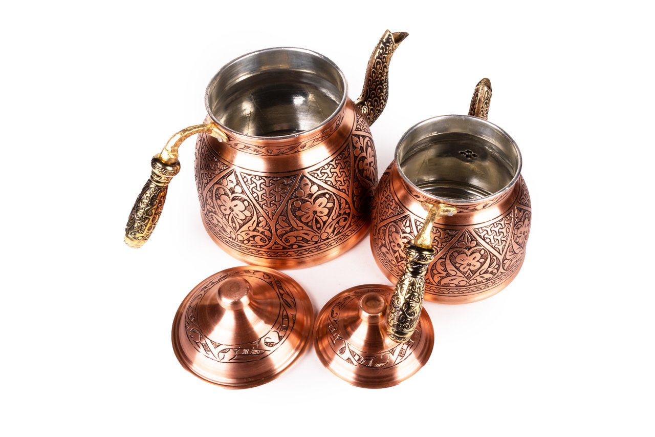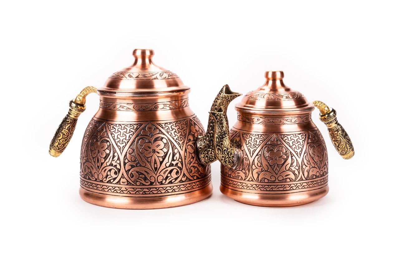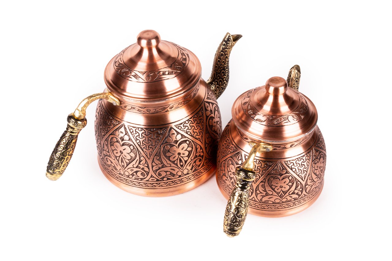 Handygoo Hand Work El İşlemesi Bakır Çaydanlık, tam bir ustalık eseri. Baştan aşağıya bakır işleme ustalarımız tarafından özenle işlenmiş ve kalın bakırdan üretilmiştir. Bakır çaydanlık modelimiz 1,8 lt üst demlik ve 2,8 alt demlik hacmine sahiptir. Sahip olduğu bu hacim ile geniş aileler ve işyerleri için son derece idealdir. Demliklerinin iç yüzeyi kalaylanmış olup, iyi bakılması durumunda yıllarca tekrar kalay gerektirmez. Bakırın orjinal renginin eskitme tarz ile birleştirilmesi ile ürettiğimiz ürünümüz tüm bu özelliklerinin yanı sıra bulunduğu ortama dekoratif olarak etkisi son derece büyüktür. Görenlerin dikkatini çekecek ve kendisine hayran bırakacak olan bakır çaydanlık modelimize sitemizden ücretsiz kargo ve güvenli alış veriş fırsatları ile hemen sahip olabilirsiniz. Ürünümüz sitemizdeki tüm diğer bakır ürünler ile uyumlu olup hediye olarak da düşünebileceğiniz yüzlerce ürünümüz ile kombinleyebilirsiniz.