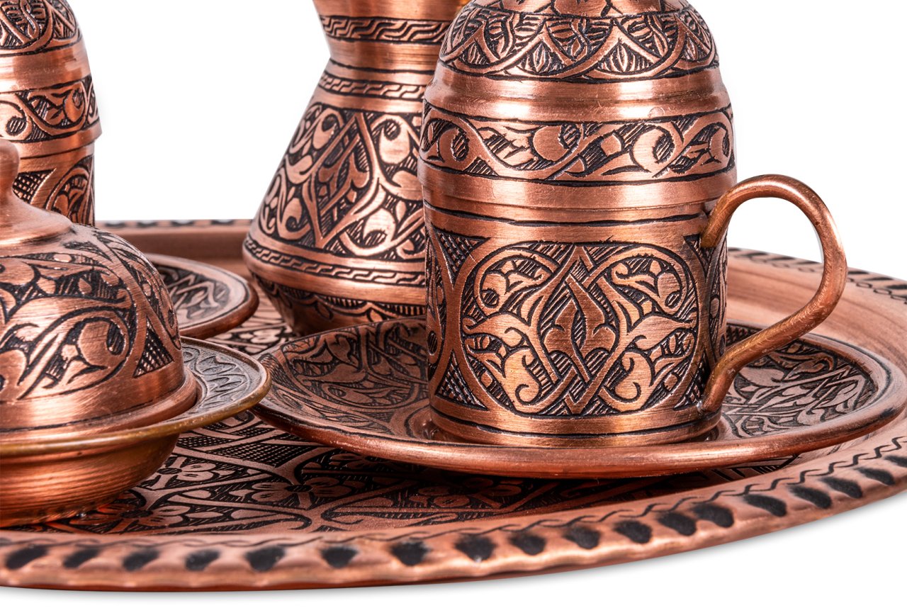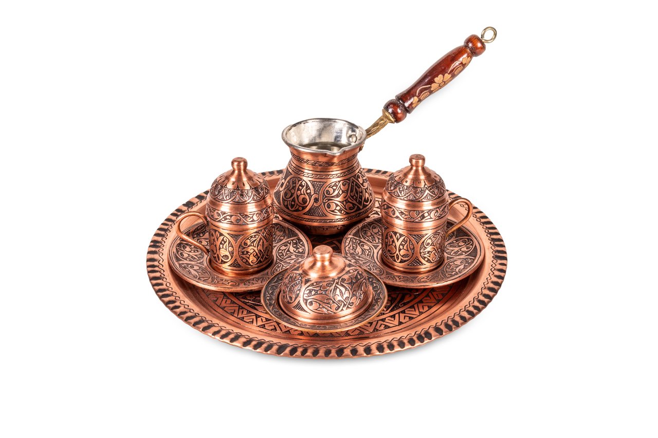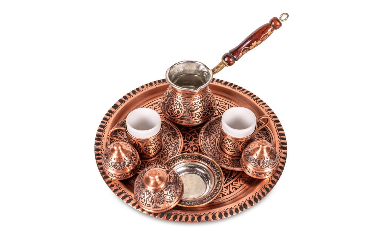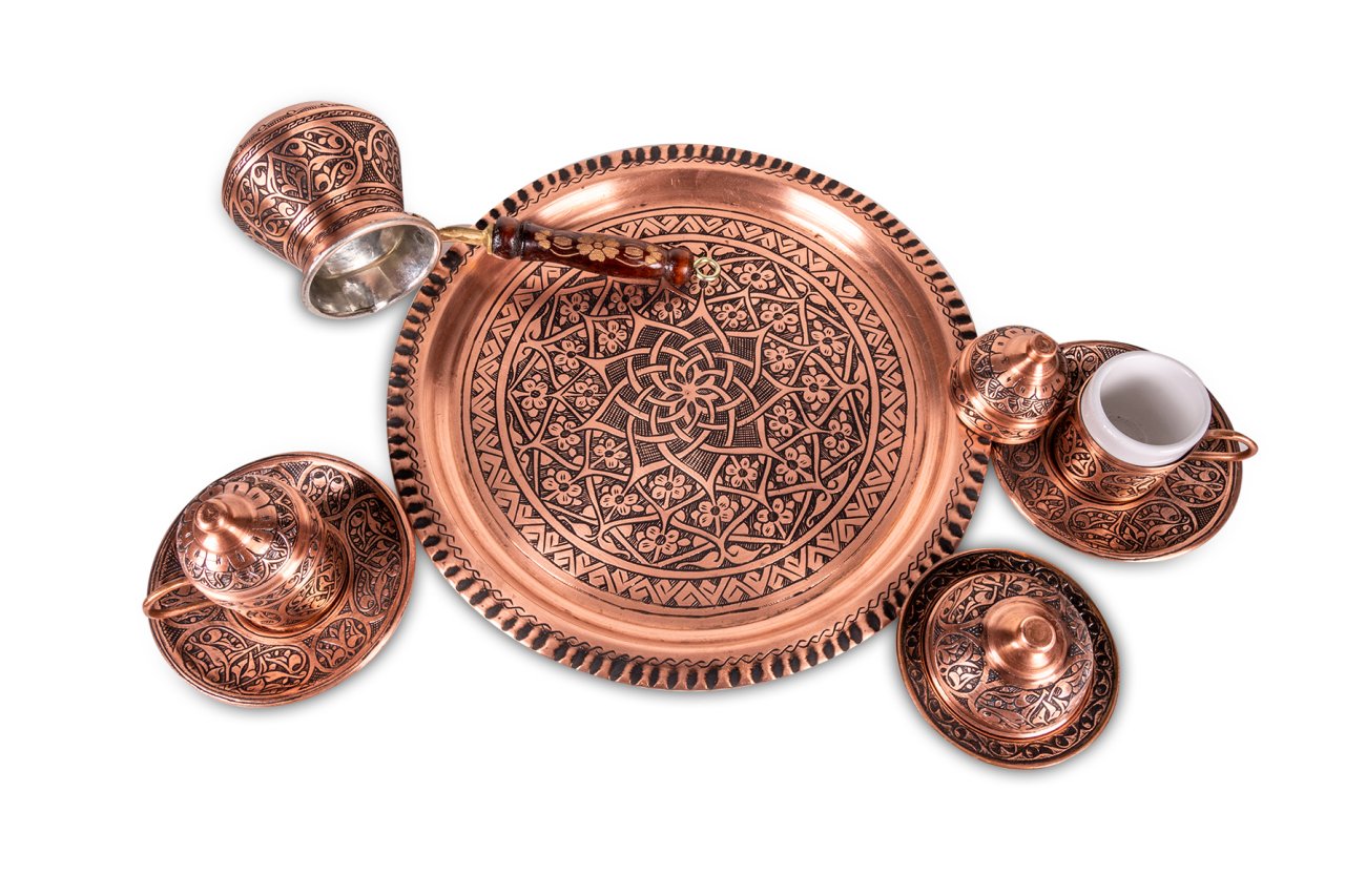 Handygoo Handblast Bakır Kahve Seti, bakır kahve seti modelleri içerisinde çok farklı bir yerde. Tepsisinden kahve fincanı tabaklarına kadar her bir alanı, bakır işleme ustalarımız tarafından elde işlenmiştir. Üzerinde oldukça emek verilen bakır kahve seti modelimiz, kırmızı eskitme tarzı ile de geleneksel esintileri sizlere getirirken, türk kahvesi zevkinizi oldukça yükseklere taşıyacak. Görenleri kendisine hayran bırakması yanı sıra, sunum kaliteniz için de çok farklı bir yere yerleşecek. Bakır kahve seti modelimiz kendi imalatımız olup kalın bakırdan üretilmiştir. Set içerisinde, tepsisi, 2 kişilik kahve cezvesi, 2 adet kapaklı kahve fincan kaidesi, 2 adet porselen kahve fincanı, 2 adet fincan tabağı ve lokumluk yer almaktadır. Tepsi 29 cm çapında ve 2 cm kalınlığındadır. Fincan kaideleri 5 cm çap ve 4,5 cm yüksekliğinde, porselen kahve fincanları ise 4,8 cm çap ve 5,8 cm yüksekliğe sahiptir. Fincanlar kapakları ile birlikte toplam 9,5 cm yüksekliğe sahiptir. Bakır kahve cezvesi 7 cm çap ve 8 cm yüksekliğindedir. Sap ölçüsü 14 cm dir. Bakır lokumluk 9,5 cm çap ve 5,5 cm yüksekliğindedir. Bakır kahve seti ürünümüz günlük kullanıma uygun olup, set içerisinde yer alan bakır ürünlerin iç kısımları kalaylıdır. Ürünümüze ücretsiz kargo ve tüm kredi kartları ile taksitli olarak da sahip olabilirsiniz.