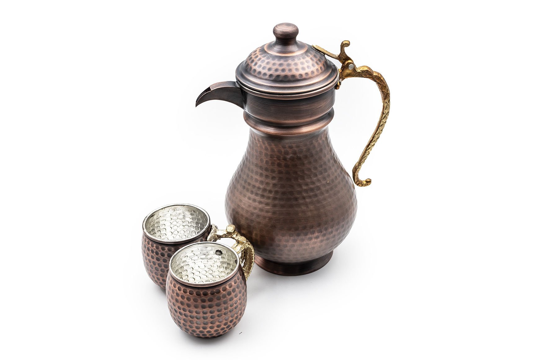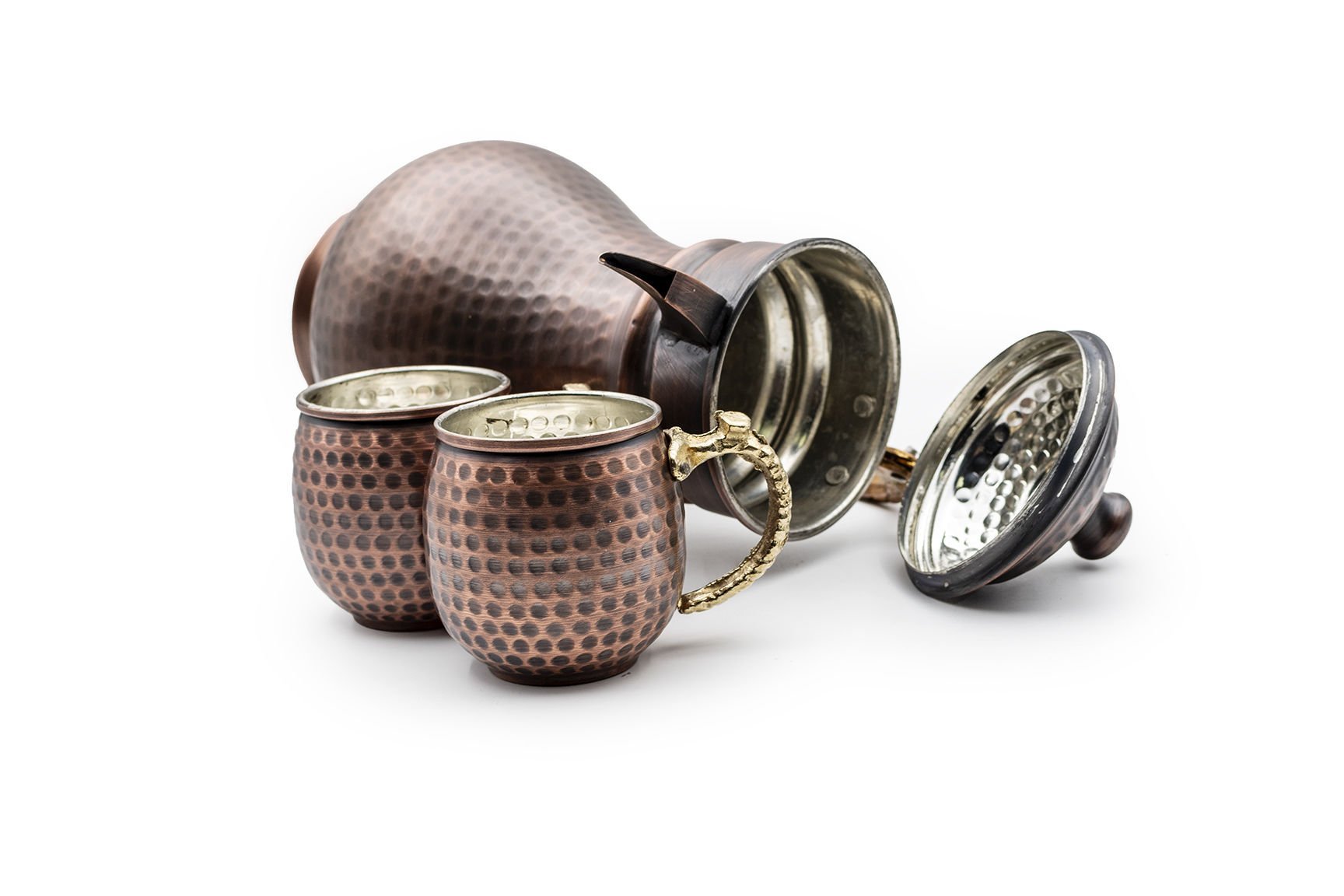 Handygoo Handside Bakır Sürahi Seti, dövme bakır sanatının tüm güzelliğini üzerinde taşımaktadır. Set içerisinde yer alan bakır sürahi modelimiz 2,5 lt hacminde, 28 cm yükseklik ve 11 cm çap ölçüsüne sahiptir. Bakır muglar ise 2 adet olup her biri 275 ml hacmindedir. Ürünlerimiz %100 bakır olup el yapımıdır. Kalın bakırdan ürettiğimiz bakır sürahi seti modelimiz, oksitlendirilmiş özel rengi ile son derece şık ve dekoratiftir. Bakır sürahi modelimizin sitemizde ayrıca sadece sürahisi ve mugları da ayrı ayrı yer almaktadır.