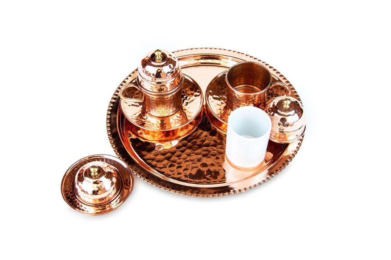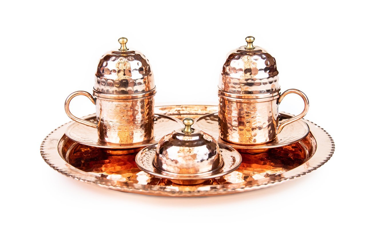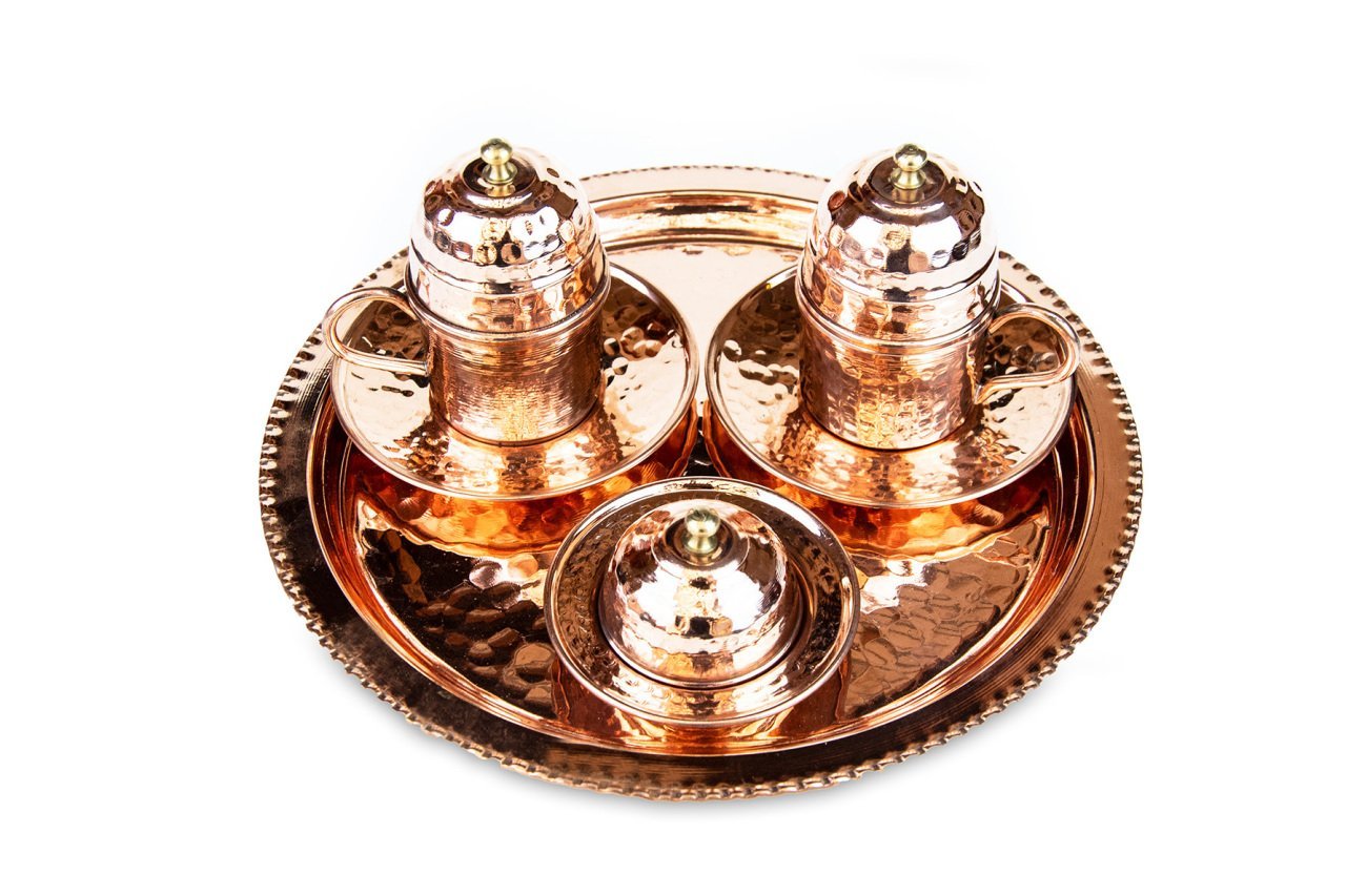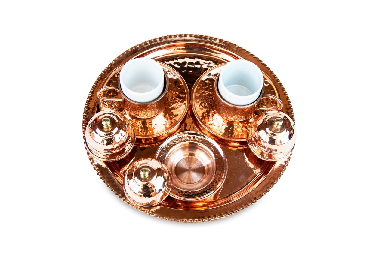 Handygoo İki Kişilik Dövme Bakır Kahve Fincanı Seti, Türk kahvesi sunum ve servisleriniz için özel olarak tasarlandı. Ürünümüzün tamamı bakırdan üretilmiştir. Kahve fincanlarından, fincan altlıklarına, lokumluğundan tepsisine kadar baştan sona el yapımıdır. Dövme bakır kahve fincanı seti üzerindeki tüm çekiçleme G.Antep'li bakır nakış ve işleme ustalarımız tarafından özenle sizler için yapılmıştır. Dolayısı ile her bir setimiz aslında size özeldir. Özellikle geleneksel ve çok özel rengi ile dikkatleri üzerine toplayan dövme bakır kahve fincanı seti modelimiz, türk kahvesi servis, sunum ve içim zevkinizi oldukça yükseklere taşımaktadır. Görenleri kendisine hayran bırakacağından emin olabilirsiniz. Bakır kahve fincanı seti modelimiz kendi imalatımız olup kalın bakırdan üretilmiştir. Set içerisinde, tepsisi, 2 adet kapaklı kahve fincan kaidesi, 2 adet porselen kahve fincanı, 2 adet fincan tabağı ve lokumluk yer almaktadır. Tepsi 25 cm çapında dövme bakırdır. Fincan kaideleri 5 cm çap ve 4,5 cm yüksekliğinde ve yine dövme bakırdır. Porselen kahve fincanları ise 4,8 cm çap ve 5,8 cm yüksekliğe sahiptir. Fincanlar kapakları ile birlikte toplam 9,5 cm yüksekliğe sahiptir. Dövme bakır lokumluk 9,5 cm çap ve 5,5 cm yüksekliğindedir. Günlük kullanımda, kullanmaktan büyük zevk duyacağınız ürünümüz aynı zamanda sevdikleriniz için son derece ideal bir hediye de olacaktır. Ayrıca sitemizde bakır kahve fincanı setinize uygun olacak aynı renk cezve modelleri ile birlikte yine tercih edebileceğiniz farklı bakır cezve modellerimizi bulabilirsiniz.