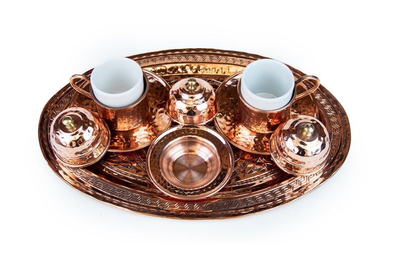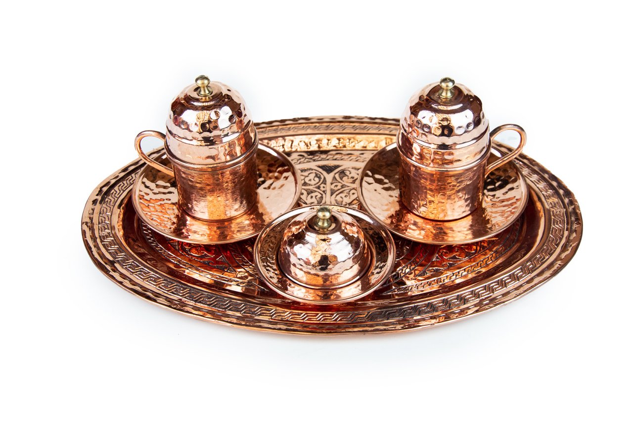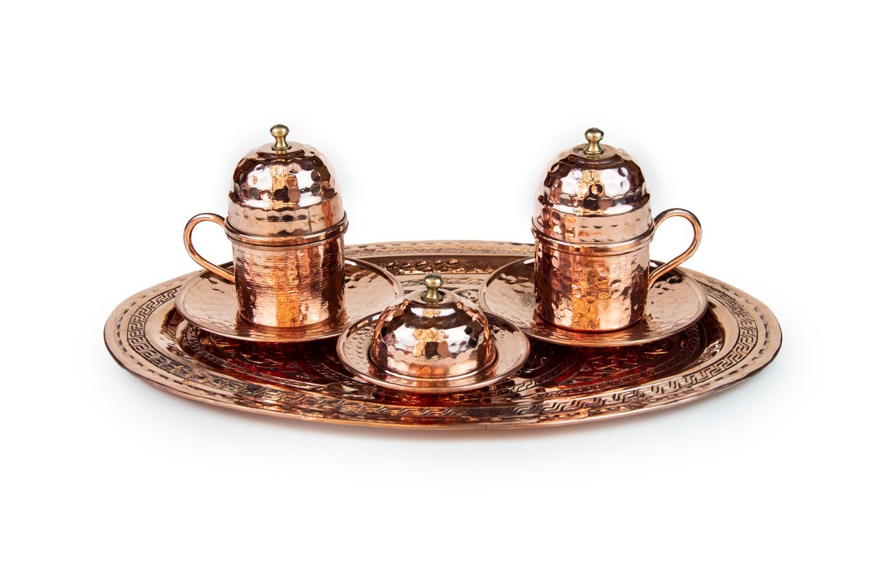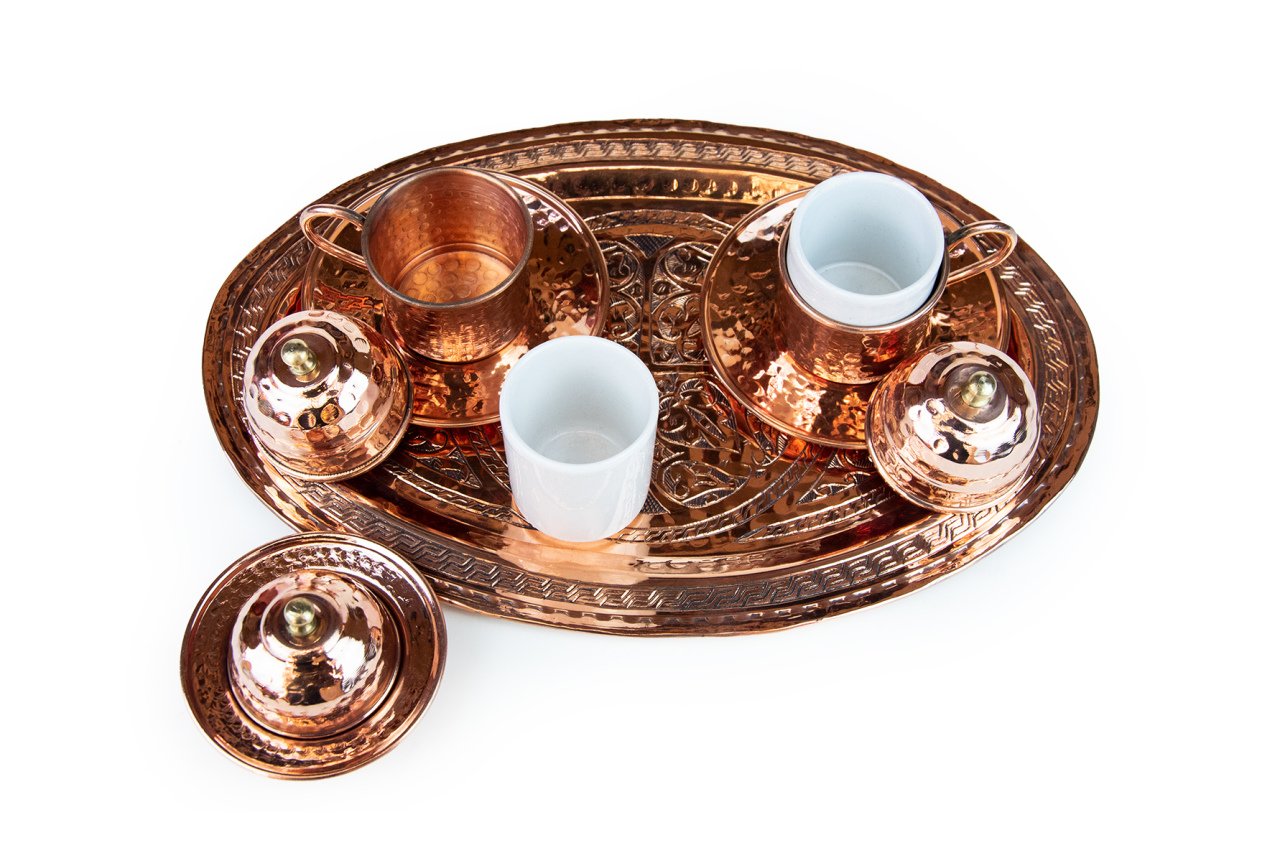 Handygoo İki Kişilik El Dövmesi Bakır Kahve Fincanı Seti, Türk kahvesi sunum ve servisleriniz için özel olarak tasarlandı. Ürünümüzün tamamı bakırdan üretilmiştir. Kahve fincanlarından, fincan altlıklarına, lokumluğundan tepsisine kadar baştan sona el yapımıdır. El işlemeli bakır kahve fincanı seti üzerindeki tüm işleme G.Antep'li bakır nakış ve işleme ustalarımız tarafından özenle sizler için yapılmıştır. Dolayısı ile her bir setimiz aslında size özeldir. Özellikle geleneksel ve çok özel rengi ile dikkatleri üzerine toplayan el işlemeli bakır kahve fincanı seti modelimiz, türk kahvesi servis, sunum ve içim zevkinizi oldukça yükseklere taşımaktadır. Görenleri kendisine hayran bırakacağından emin olabilirsiniz. Bakır kahve fincanı seti modelimiz kendi imalatımız olup kalın bakırdan üretilmiştir. Set içerisinde, tepsisi, 2 adet kapaklı kahve fincan kaidesi, 2 adet porselen kahve fincanı, 2 adet fincan tabağı ve lokumluk yer almaktadır. Tepsi 25 cm çapında el işlemeli bakırdır. Fincan kaideleri 5 cm çap ve 4,5 cm yüksekliğinde ve el dövmesi bakırdır. Porselen kahve fincanları ise 4,8 cm çap ve 5,8 cm yüksekliğe sahiptir. Fincanlar kapakları ile birlikte toplam 9,5 cm yüksekliğe sahiptir. Dövme bakır lokumluk 9,5 cm çap ve 5,5 cm yüksekliğindedir. Günlük kullanımda, kullanmaktan büyük zevk duyacağınız ürünümüz aynı zamanda sevdikleriniz için son derece ideal bir hediye de olacaktır. Ayrıca sitemizde bakır kahve fincanı setinize uygun olacak aynı renk cezve modelleri ile birlikte yine tercih edebileceğiniz farklı bakır cezve modellerimizi bulabilirsiniz.