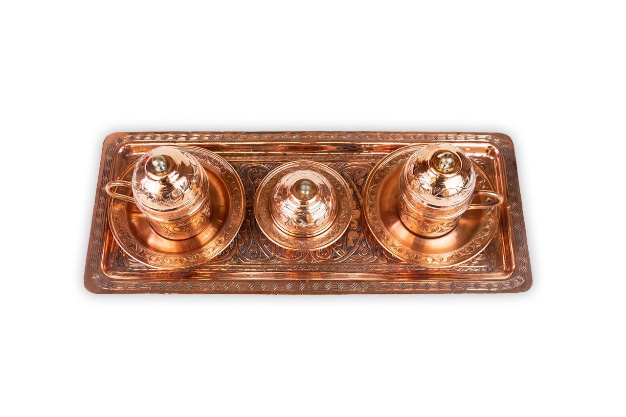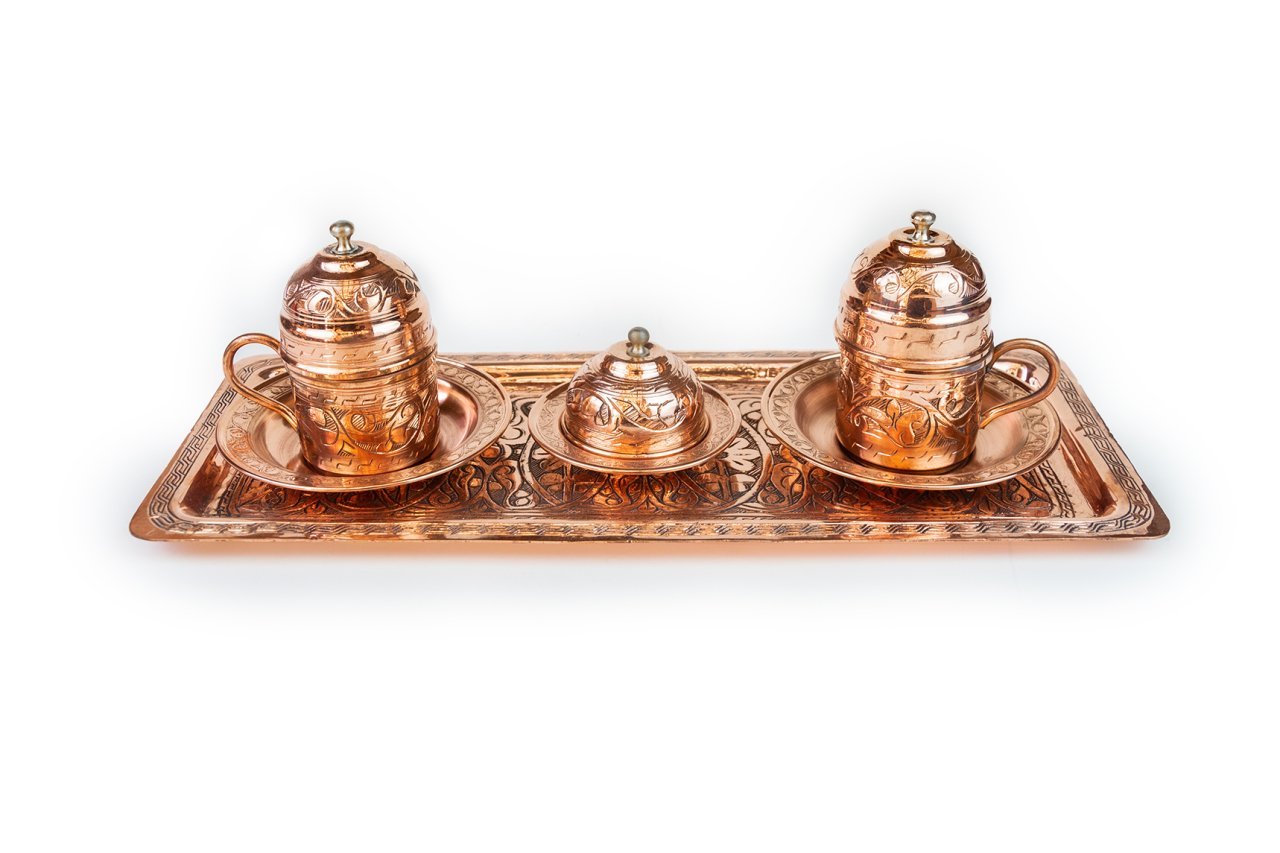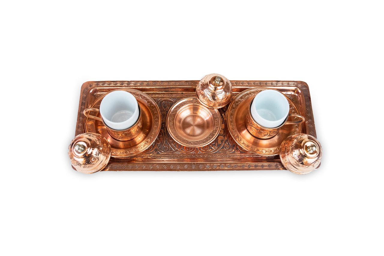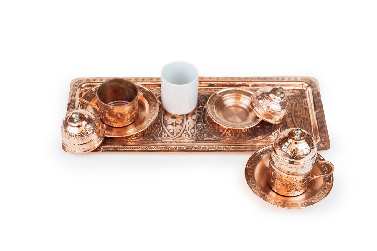 Handygoo İki Kişilik El İşlemesi Bakır Kahve Fincanı Seti, Türk kahvesi sunum ve servisleriniz için özel olarak tasarlandı. Ürünümüzün tamamı bakırdan üretilmiştir. Kahve fincanlarından, fincan altlıklarına, lokumluğundan tepsisine kadar baştan sona el yapımıdır. El işlemeli bakır kahve fincan seti üzerindeki tüm işleme G.Antep'li bakır nakış ve işleme ustalarımız tarafından özenle sizler için yapılmıştır. Dolayısı ile her bir setimiz aslında size özeldir. Özellikle geleneksel ve çok özel rengi ile dikkatleri üzerine toplayan el işlemeli bakır kahve fincan seti modelimiz, türk kahvesi servis, sunum ve içim zevkinizi oldukça yükseklere taşımaktadır. Görenleri kendisine hayran bırakacağından emin olabilirsiniz. Bakır kahve fincan seti modelimiz kendi imalatımız olup kalın bakırdan üretilmiştir. Set içerisinde, tepsisi, 2 adet kapaklı kahve fincan kaidesi, 2 adet porselen kahve fincanı, 2 adet fincan tabağı ve lokumluk yer almaktadır. Tepsi 25 cm çapında el işlemeli bakırdır. Fincan kaideleri 5 cm çap ve 4,5 cm yüksekliğinde ve el işlemeli bakırdır. Porselen kahve fincanları ise 4,8 cm çap ve 5,8 cm yüksekliğe sahiptir. Fincanlar kapakları ile birlikte toplam 9,5 cm yüksekliğe sahiptir. Dövme bakır lokumluk 9,5 cm çap ve 5,5 cm yüksekliğindedir. Günlük kullanımda, kullanmaktan büyük zevk duyacağınız ürünümüz aynı zamanda sevdikleriniz için son derece ideal bir hediye de olacaktır. Ayrıca sitemizde bakır kahve fincanı setinize uygun olacak aynı renk cezve modelleri ile birlikte yine tercih edebileceğiniz farklı bakır cezve modellerimizi bulabilirsiniz.