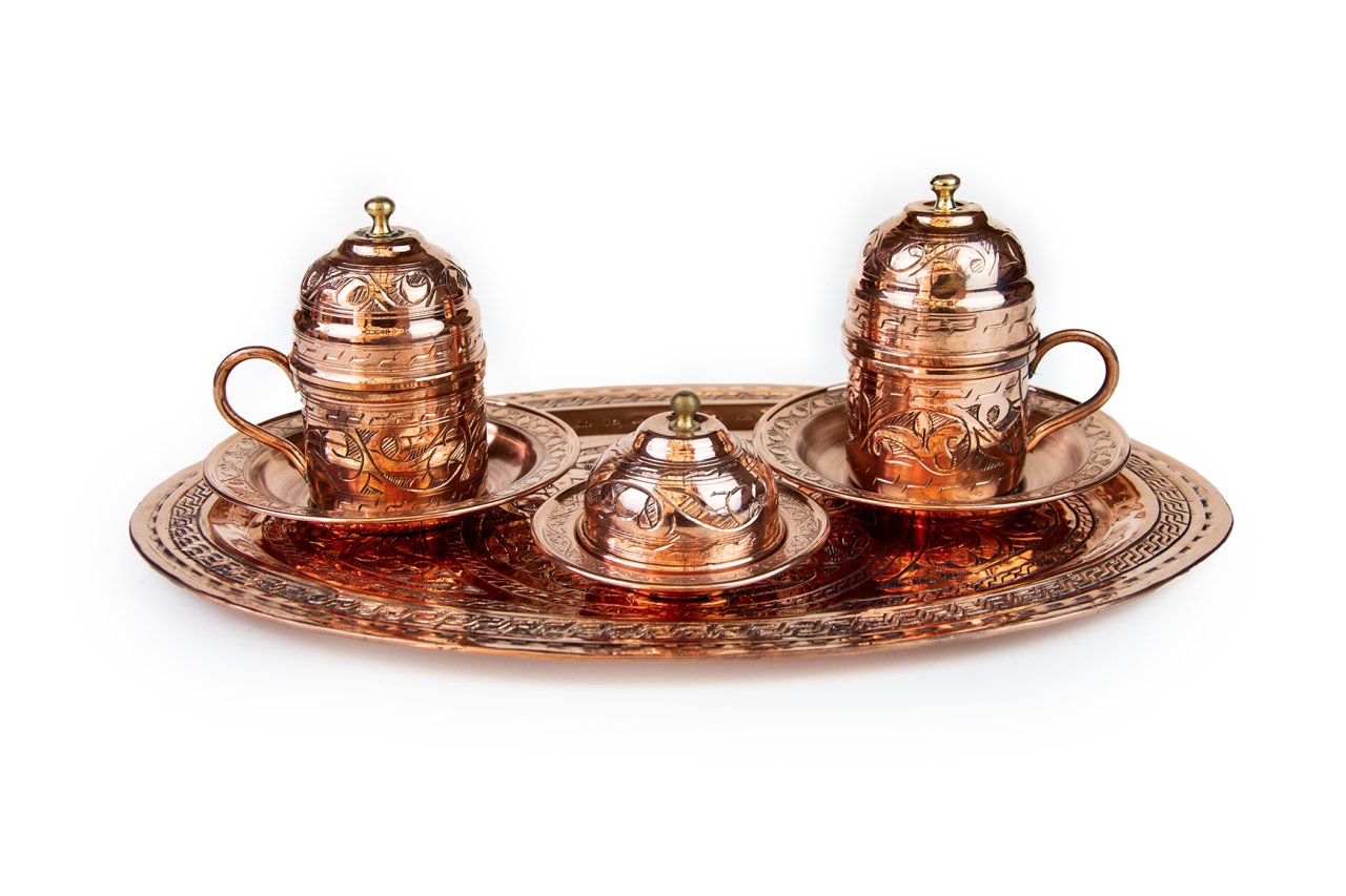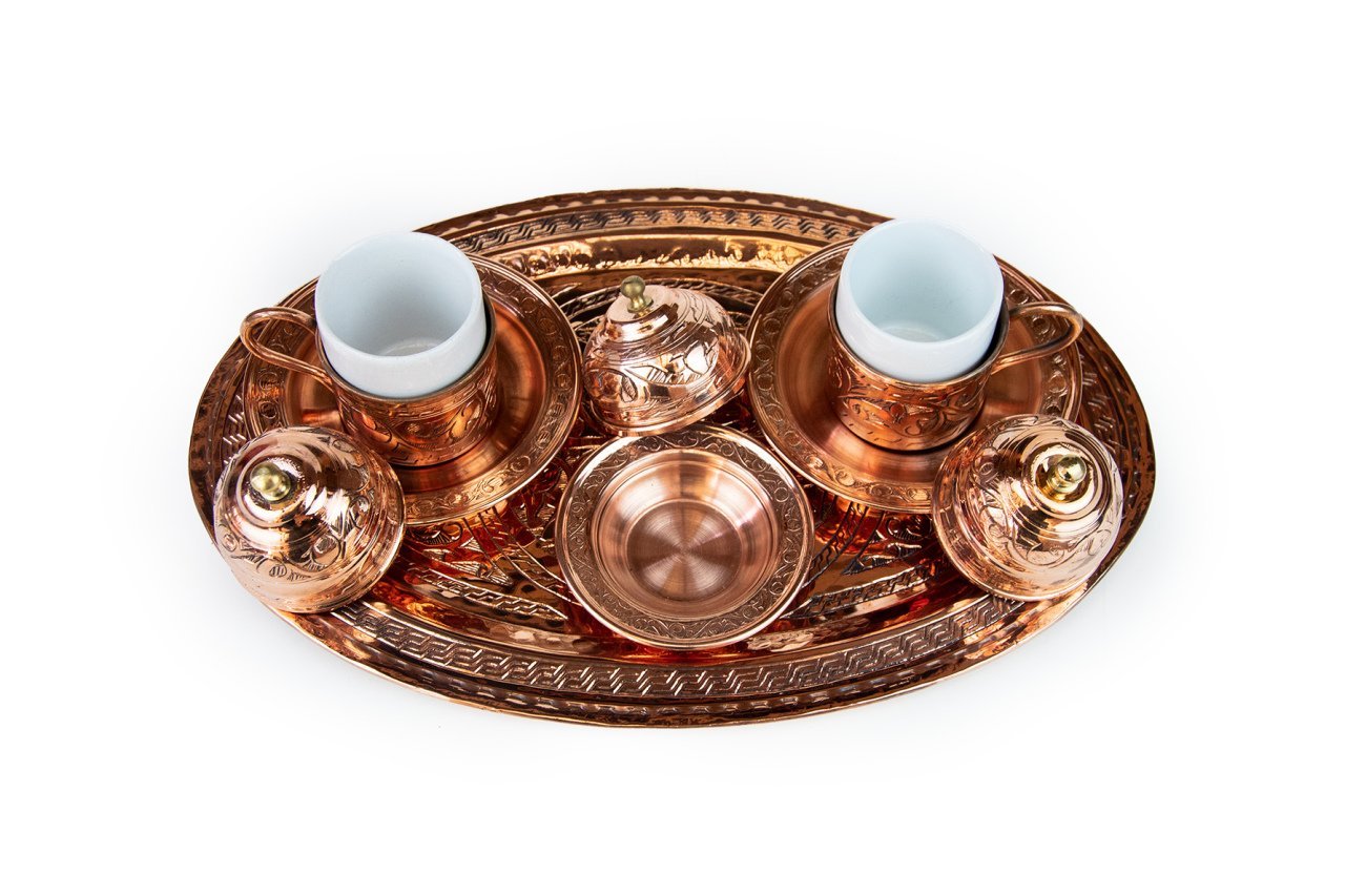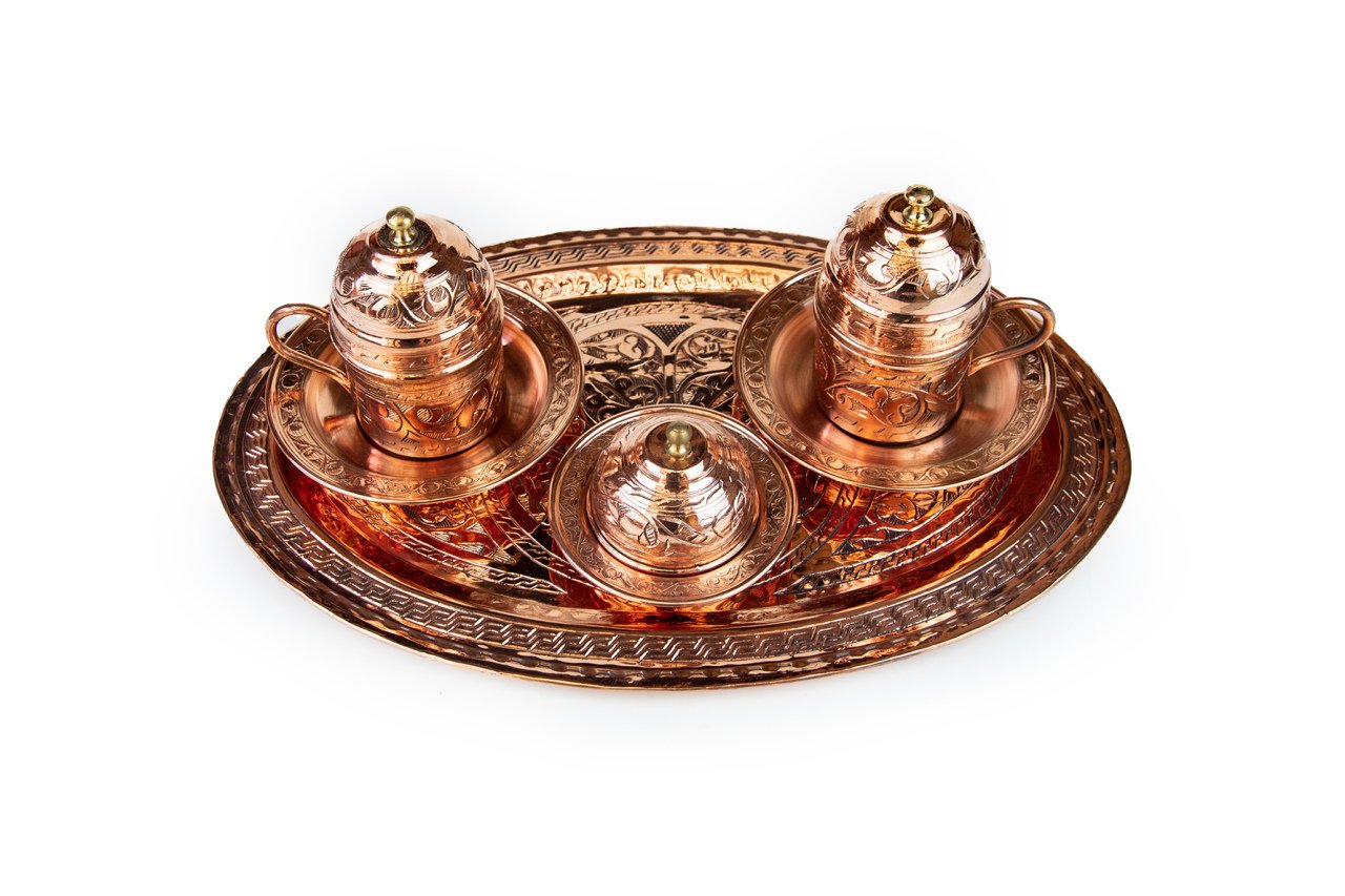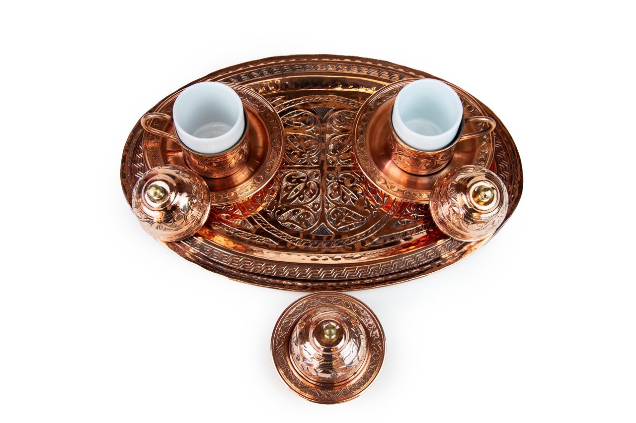 Handygoo İki Kişilik El İşlemesi Bakır Kahve Fincanı Seti, Türk kahvesi sunum ve servisleriniz için özel olarak tasarlandı. Ürünümüzün tamamı bakırdan üretilmiştir. Kahve fincanlarından, fincan altlıklarına, lokumluğundan tepsisine kadar baştan sona el yapımıdır. El işlemeli bakır kahve fincanı seti üzerindeki tüm işleme G.Antep'li bakır nakış ve işleme ustalarımız tarafından özenle sizler için yapılmıştır. Dolayısı ile her bir setimiz aslında size özeldir. Özellikle geleneksel ve çok özel rengi ile dikkatleri üzerine toplayan el işlemeli bakır kahve fincanı seti modelimiz, türk kahvesi servis, sunum ve içim zevkinizi oldukça yükseklere taşımaktadır. Görenleri kendisine hayran bırakacağından emin olabilirsiniz. Bakır kahve fincanı seti modelimiz kendi imalatımız olup kalın bakırdan üretilmiştir. Set içerisinde, tepsisi, 2 adet kapaklı kahve fincan kaidesi, 2 adet porselen kahve fincanı, 2 adet fincan tabağı ve lokumluk yer almaktadır. Tepsi 25 cm çapında el işlemeli bakırdır. Fincan kaideleri 5 cm çap ve 4,5 cm yüksekliğinde ve el işlemeli bakırdır. Porselen kahve fincanları ise 4,8 cm çap ve 5,8 cm yüksekliğe sahiptir. Fincanlar kapakları ile birlikte toplam 9,5 cm yüksekliğe sahiptir. Dövme bakır lokumluk 9,5 cm çap ve 5,5 cm yüksekliğindedir. Günlük kullanımda, kullanmaktan büyük zevk duyacağınız ürünümüz aynı zamanda sevdikleriniz için son derece ideal bir hediye de olacaktır. Ayrıca sitemizde bakır kahve fincanı setinize uygun olacak aynı renk cezve modelleri ile birlikte yine tercih edebileceğiniz farklı bakır cezve modellerimizi bulabilirsiniz.