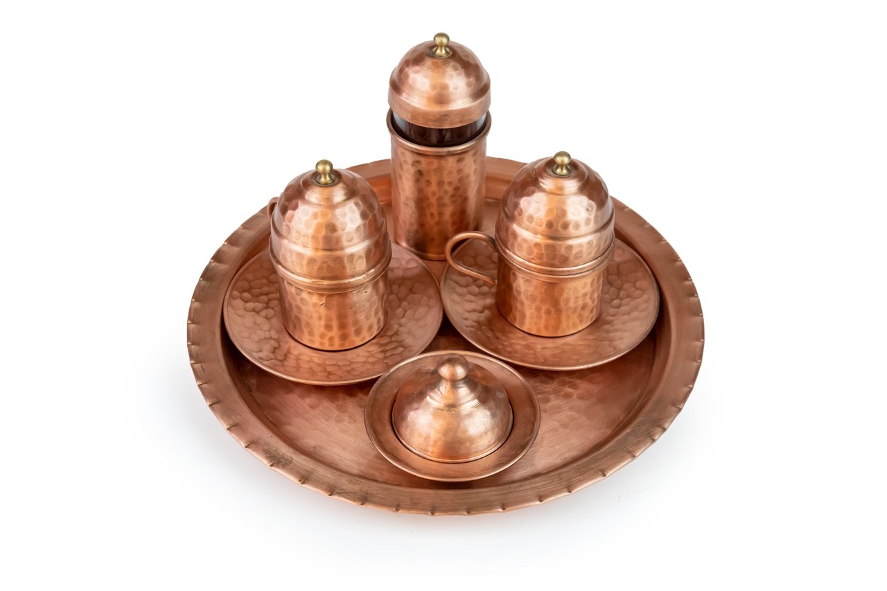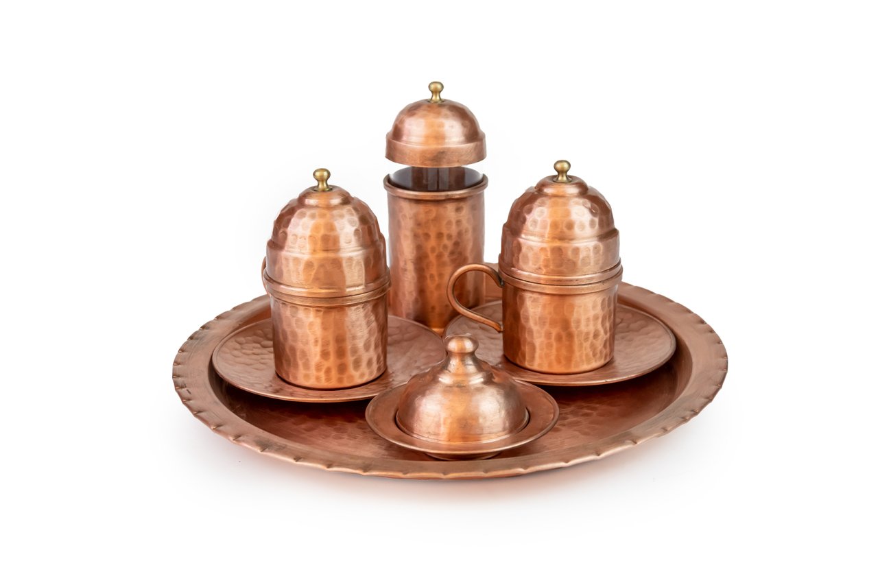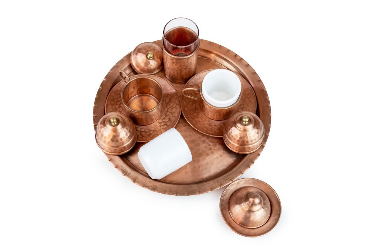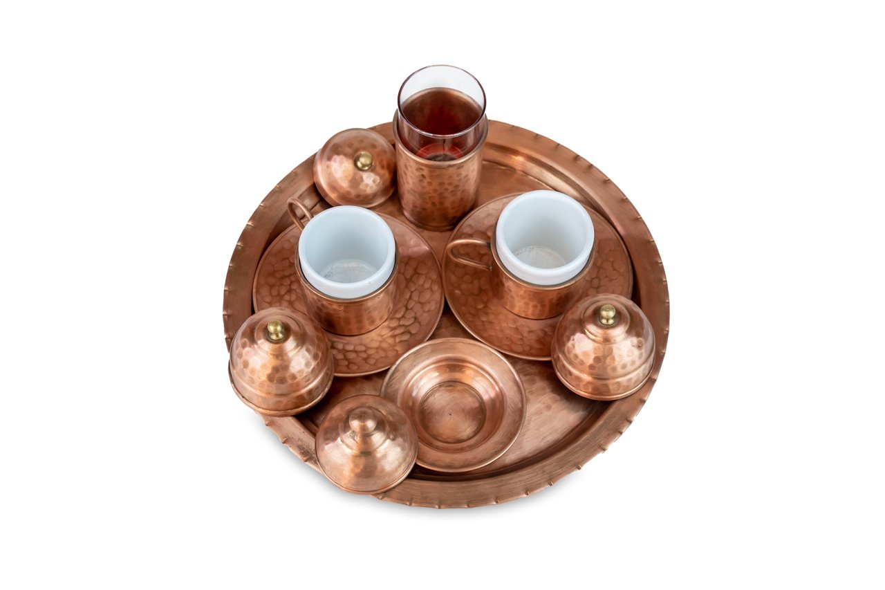 Handygoo İki Kişilik Mat Dövme Bakır Kahve Fincanı Seti, Türk kahvesi sunum ve servisleriniz için özel olarak tasarlandı. Ürünümüzün tamamı bakırdan üretilmiştir. Kahve fincanlarından, fincan altlıklarına, lokumluğundan suluğu ve tepsisine kadar baştan sona el yapımıdır. Dövme bakır kahve fincanı seti üzerindeki tüm çekiçleme G.Antep'li bakır nakış ve işleme ustalarımız tarafından özenle sizler için yapılmıştır. Dolayısı ile her bir setimiz aslında size özeldir. Özellikle mat ve çok özel rengi ile dikkatleri üzerine toplayan dövme bakır kahve fincanı seti modelimiz, türk kahvesi servis, sunum ve içim zevkinizi oldukça yükseklere taşımaktadır. Görenleri kendisine hayran bırakacağından emin olabilirsiniz. Bakır kahve fincanı seti modelimiz kendi imalatımız olup kalın bakırdan üretilmiştir. Set içerisinde, tepsisi, 2 adet kapaklı kahve fincan kaidesi, 2 adet porselen kahve fincanı, 2 adet fincan tabağı ile lokumluk ve suluk yer almaktadır. Tepsi 25 cm çapında dövme bakırdır. Fincan kaideleri 5 cm çap ve 4,5 cm yüksekliğinde ve yine dövme bakırdır. Porselen kahve fincanları ise 4,8 cm çap ve 5,8 cm yüksekliğe sahiptir. Fincanlar kapakları ile birlikte toplam 9,5 cm yüksekliğe sahiptir. Dövme bakır lokumluk 9,5 cm çap ve 5,5 cm yüksekliğindedir. Bakır suluk 3,9 cm çapında, 7,5 cm boyundadır. Su bardağı ile toplam yüksekliği ise 9 cm dir. Günlük kullanımda, kullanmaktan büyük zevk duyacağınız ürünümüz aynı zamanda sevdikleriniz için son derece ideal bir hediye de olacaktır. Ayrıca sitemizde bakır kahve fincanı setinize uygun olacak aynı renk cezve modelleri ile birlikte yine tercih edebileceğiniz farklı bakır cezve modellerimizi bulabilirsiniz.