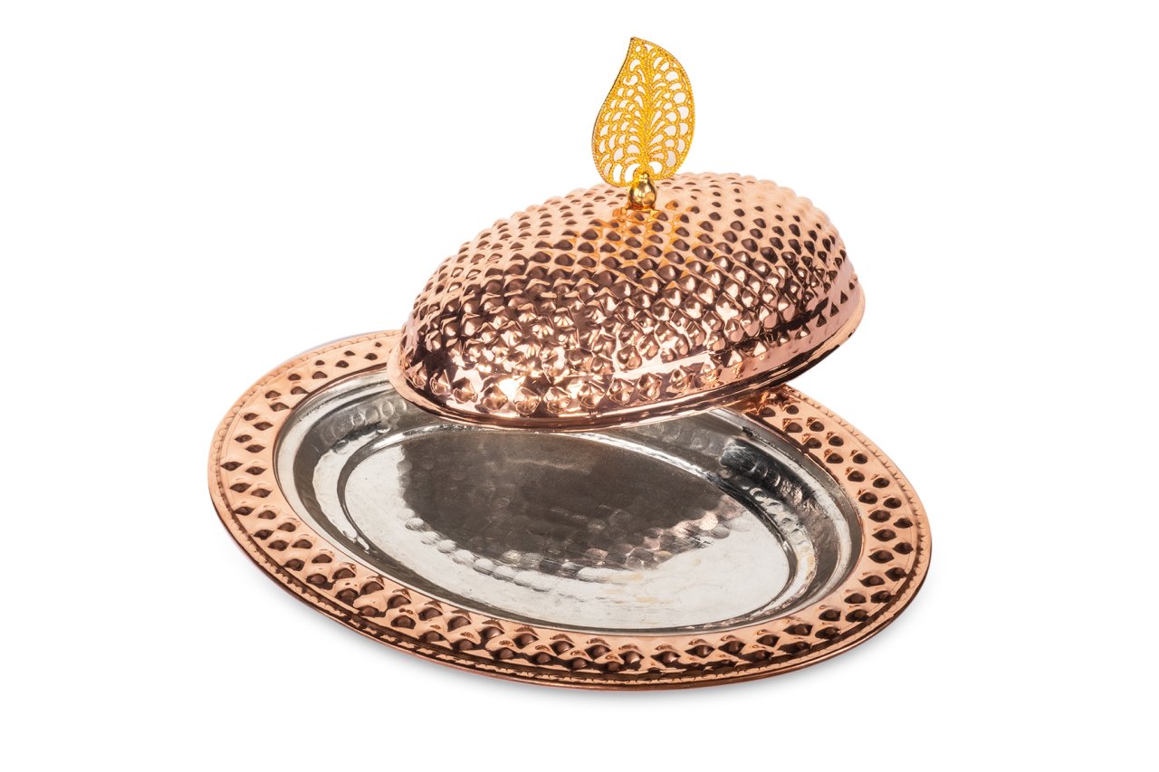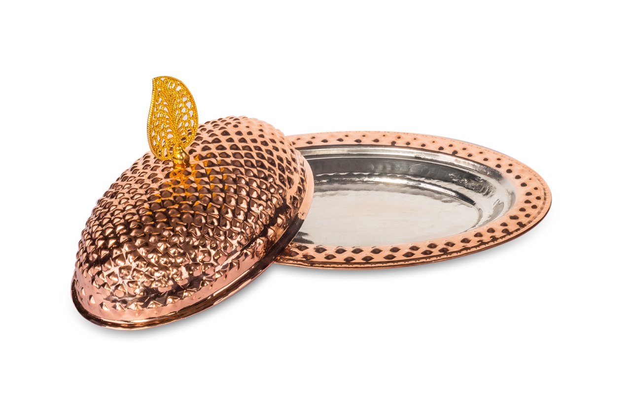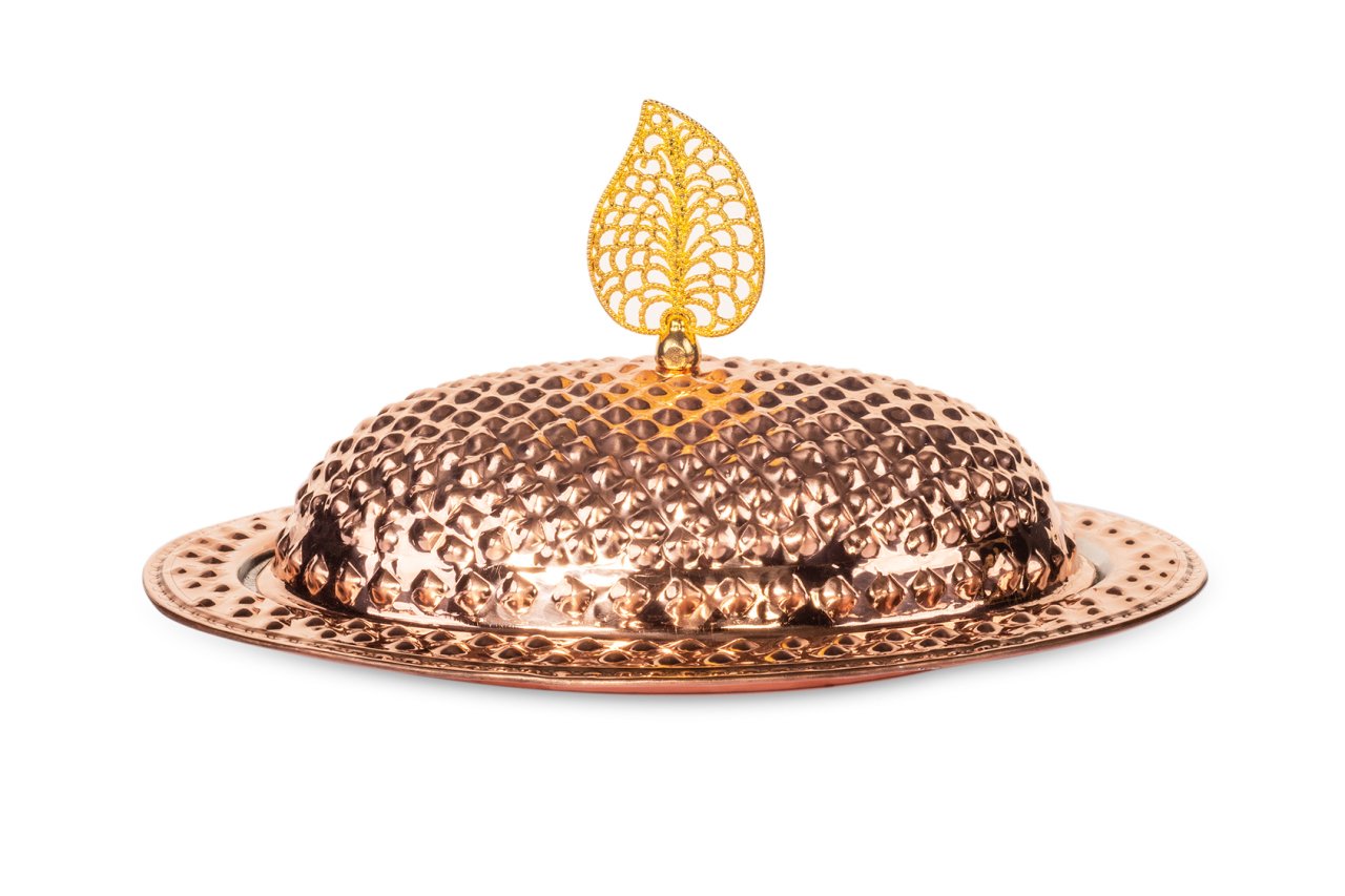 Handygoo Keops Bakır Servis Tabağı, oldukça gösterişli ve çok kullanışlı. Ağırlıklı olarak iskender kebabı servislerinde kullanılmak üzere tasarlanmış olsa da ev ve iş yerlerinizde her türlü sunum ve servislerinizde rahatlıkla kullanabilirsiniz. Ürün kendi imalatımız olup, kalın bakırdan üretilmiştir. Özel tasarım bakır servis tabağı ürünümüz, tamamen el yapımı olup, üzerindeki piramit tasarımları tamamen G.Antep bakır işleme ustaları tarafından elde yapılmaktadır. Ürünümüzün iç tarafı da tamamen kalaylanmıştır. Sitemizde, 25-30-35 ve 40 cm lik boyutlarını bulabileceğiniz ürünümüze ücretsiz kargo fırsatı ile sahip olabilirsiniz.
