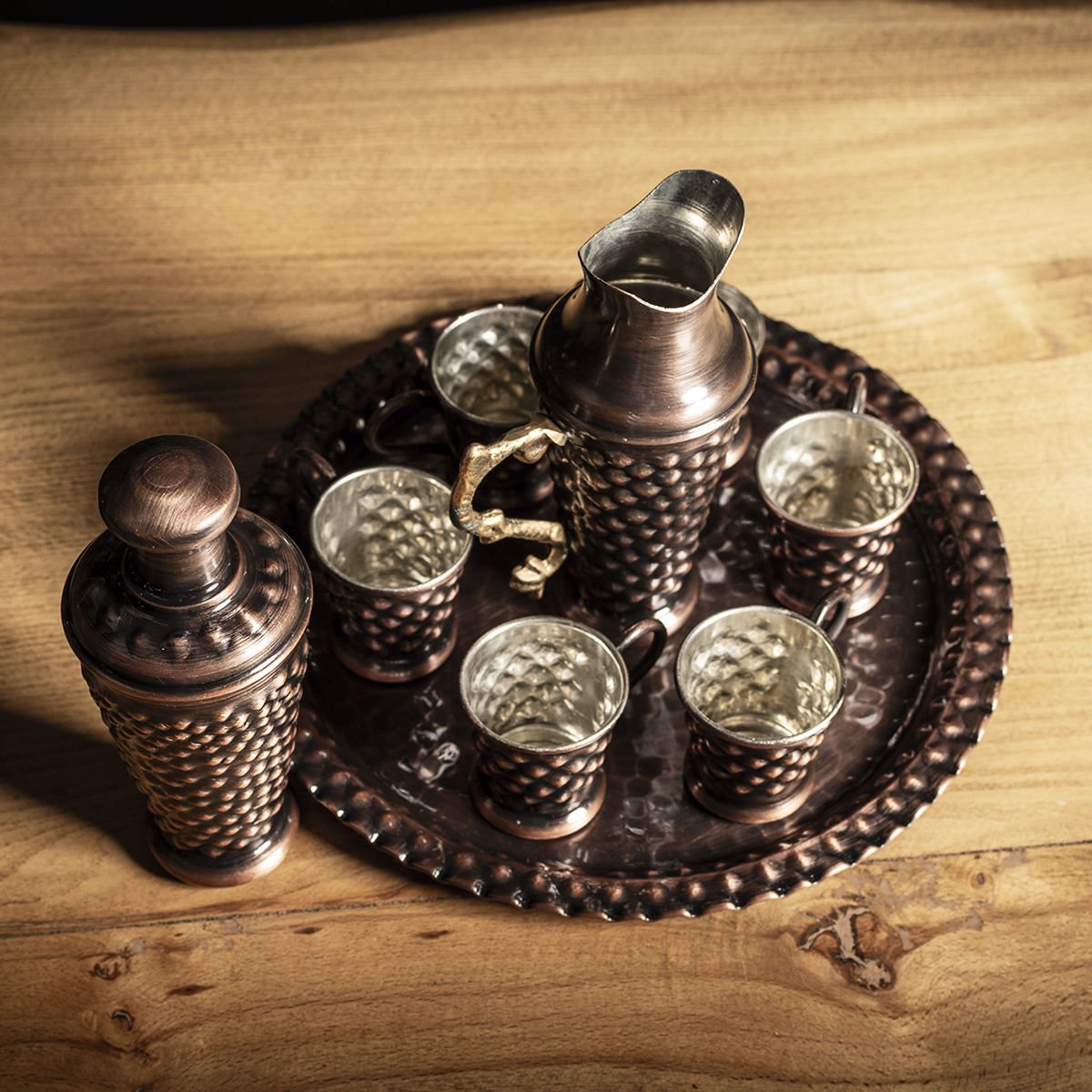 Handygoo Keops Bakır Zemzem Seti, toplam 9 parçadan oluşmaktadır. Bakır zemzem seti içerisinde 1 adet 24 cm çapında tepsi, 6 adet fincan, 1 adet zemzemlik ve kolonyalık yer almaktadır. Fincanlarımız 5 cm yüksekliğindedir. Zemzemlik 14 cm yüksekliğinde ve 5 cm çapında iken kolonyalık modelimiz ise 15 cm yükseklik ve 5 cm çap ölçüsüne sahiptir. Ürünümüz %100 bakır ve el yapımıdır. Üzerindeki piramit desenleri özenle hazırlanmıştır. Son derece dekoratif olan modelimiz, zemzem servislerinizde göz kamaştıracaktır.