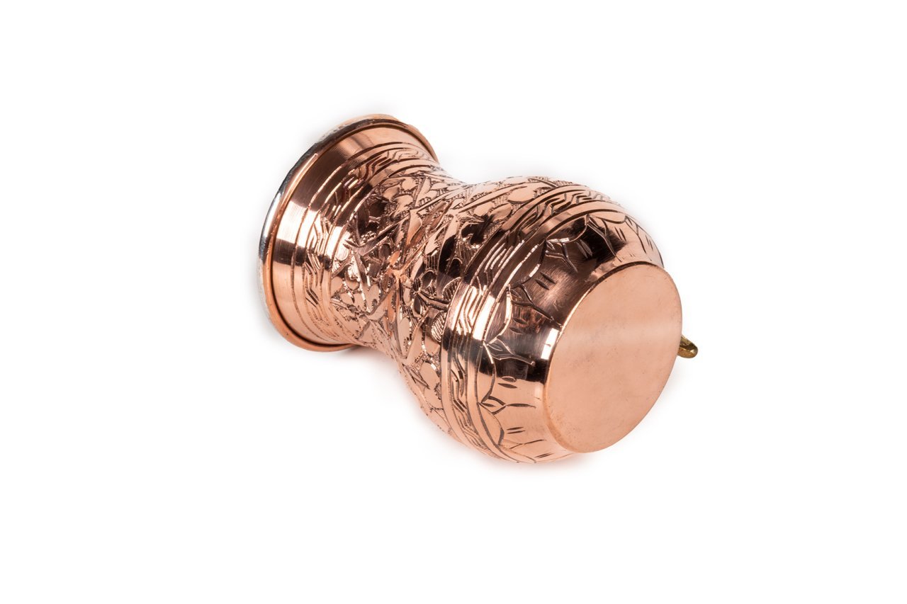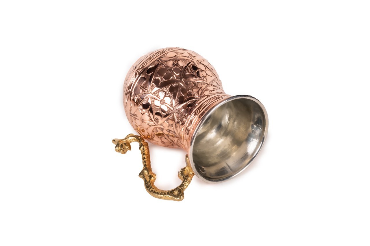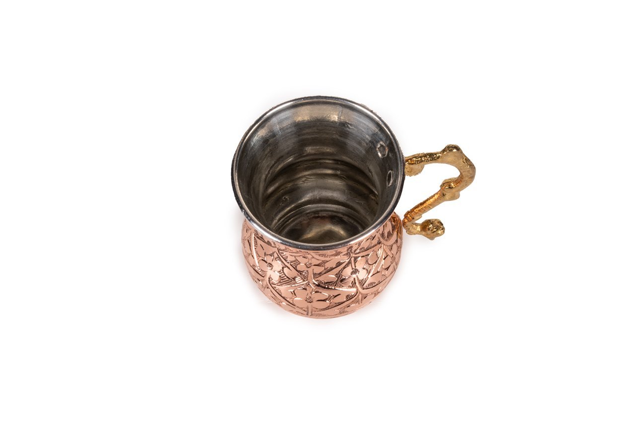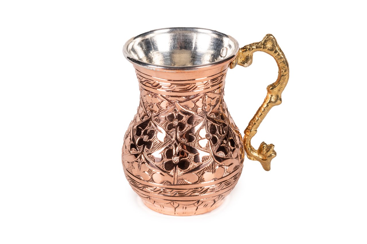 Tek kulplu kırmızı bakır kupa ve soğuk esintiler, içeceklerinizi eski zamanlardan kalan işlemelerin modern dünyadaki yansımalarında yudumlamanız için yapıldı. Yalnızken kullanmaktan keyif alacağınız, dostlarınız ile birlikteyken sohbetlerinize harmanlayabileceğiniz bir üründür. Alttan yukarıya doğru hoş bir kıvrıma sahip ürün, tüm vücudunda özenle düşünülerek hayata geçirilmiş işlemeler ile donatılmıştır. Kalay kaplı iç yüzeyi sayesinde güvenle kullanabileceğiniz şekilde kullanıma hazırdır. Üzerindeki kulp gövdeye dışardan sabitlenmiş olup pirinç dökümdür. Bakır kupalar son derece işlevsel ve çok yönlüdür. Masanızda, iş yerinizde ve dışarda rahatlıkla kullanabilirsiniz. Doğal olarak yalıtılmış bakır kupalar, inanmış olduğumuz doğaya, doğallığa ve onun sihrine son derece uygundur. Bakır kupada, sadelik, basitlik ve yalınlık, son derece etkileyici, dans eden işlemeler ile buluşmaktadır. Girdiği her alanda çarpıcı bir etki yaratan bakırın sıcaklığı ile evinizin dekorunu ısıtabilirsiniz. Rafine tercihler ve kaliteye adanmışlığın bir sembolü olan bakır kupalar ve bardaklar, mutfağınızda kendini lezzete adamış bir şefin yaşadığına işaret edecek. Yerel özgünlüğe verilen değerin de elçisi olan mutfaktaki bakırlarınız, ev dekorunuzun her türlü katmanıyla kolayca bütünleşip, bir zenginlik yaratacak. Ürünümüz 7,2 cm çapa ve 11 cm yüksekliğe sahiptir. Kulptan çapı ise 11 cm dir. Kalın bakırdan üretilmiş olup kendi imalatımızdır.