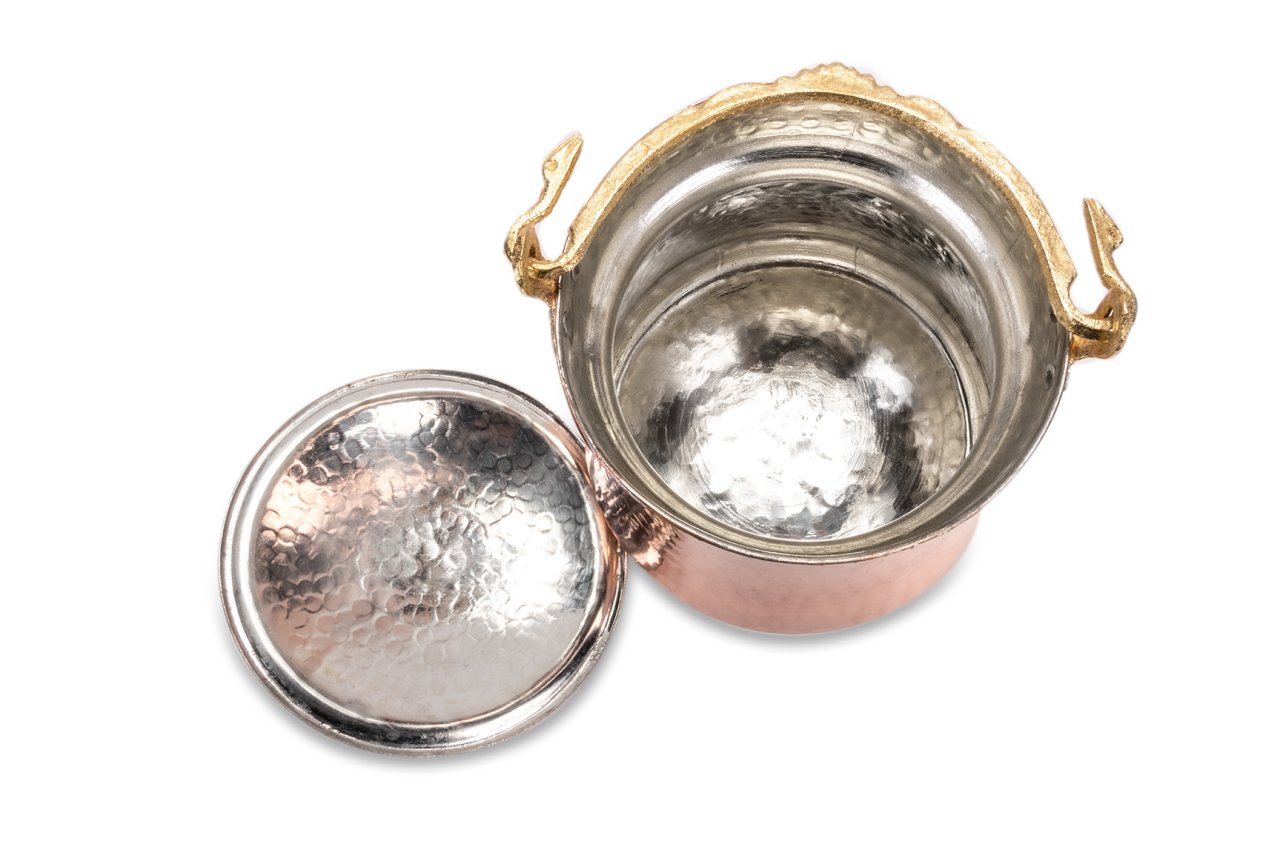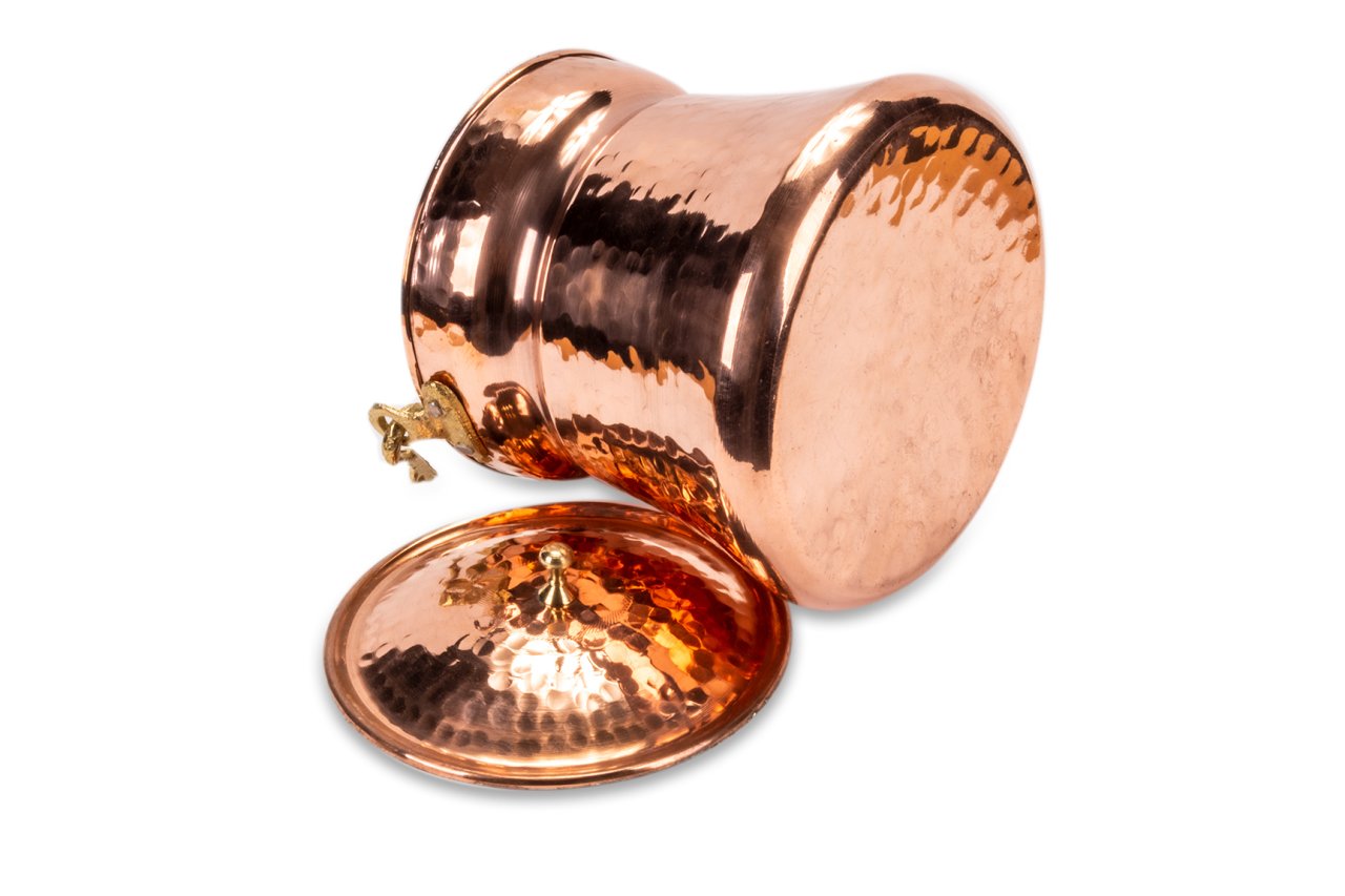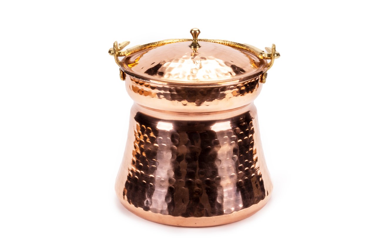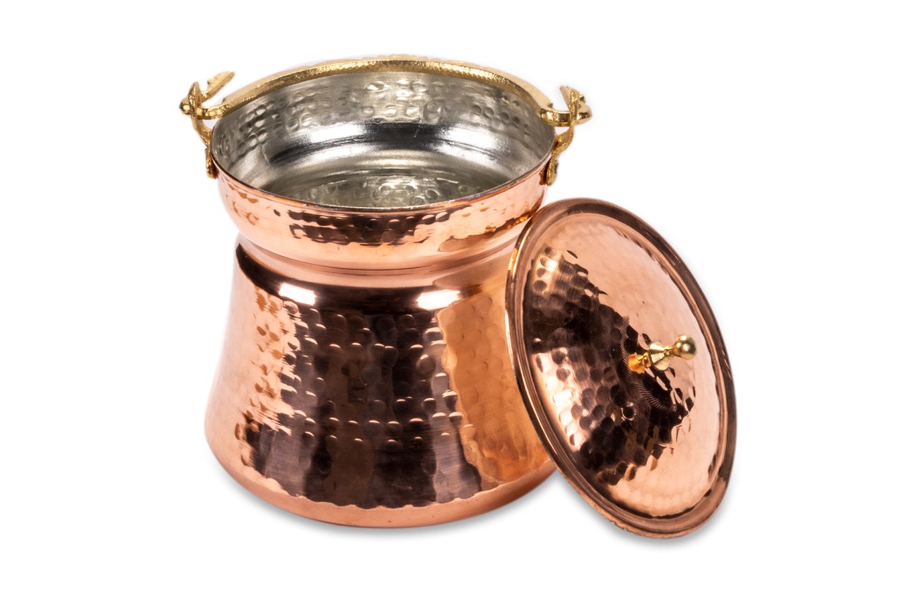 Handygoo Kırmızı Dövme Bakır Bakraç, Gaziantep’li ustaların elleri ile dövülmüş ve üretilmiştir. Yoğurt mayalama, sıvı yada katı saklama ve taşıma amaçlı olarak tasarlanmış olup, sadece dekoratif amaçlı olarak da kullanabileceğiniz bir ürün olarak ön plana çıkmaktadır. Yükseklik ve çapı 15 cm olan bakır ürünün 2 lt hacmi bulunmakta, tamamen el işçiliği ile eskitme tekniği kullanılarak üretilmiştir. İç kısmı kalay ile kaplanmış olup, dış kısımlar parlaklığını koruyan malzeme ile kaplanmıştır. Bu sebep ile kararma yapmamaktadır. En altından üste doğru geleneksel işlemelere sahip olup kapak kısmı da işlemelidir. Hem kapak üstünde hemde yanlarından pirinç kulplara sahip olan bakır bakraç, kullanım kolaylığı sağlamaktadır. Tamamen geleneksel ve kültürel temalar ile donatılmış olan ürün, mutfak, yemek odası ve oturma odası için göz alıcı özelliklere sahiptir. Misafirlerinizi etkileyebilecek tarz ve pratiklik dengesine sahip olan bakr kova yada bakraç ürününüz ile herhangi bir iç yada dış mekan için büyüleyici bir aksesuar yaratabilirsiniz. Sevdiklerinize ve dostlarınıza hediye de edebileceğiniz bakır kova ve bakraç, kendilerini son derece şanslı hissetmelerine sebep olacaktır. Ürünümüzün 3 ve 4 lt hacimli seçenekleri de mevcuttur.
